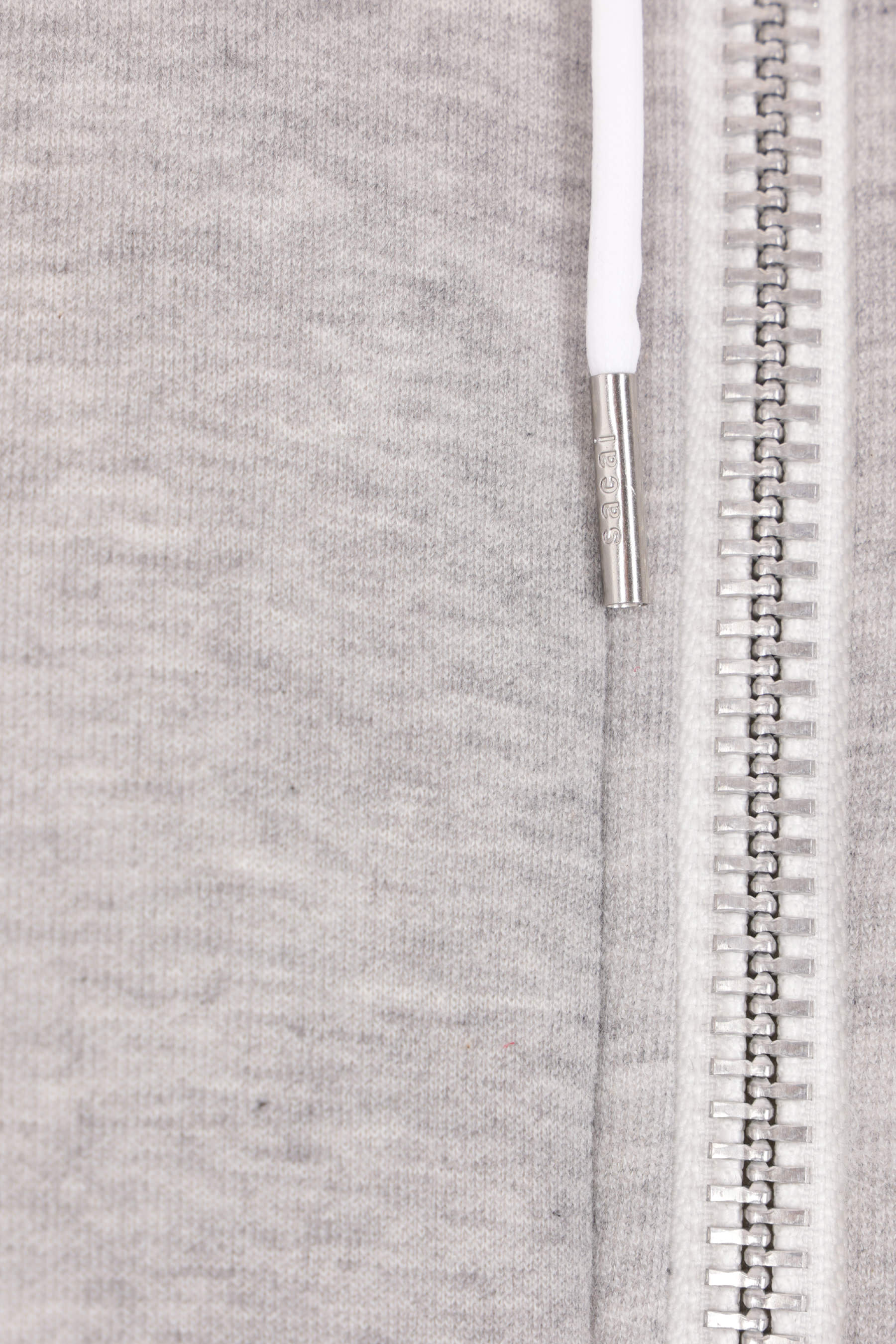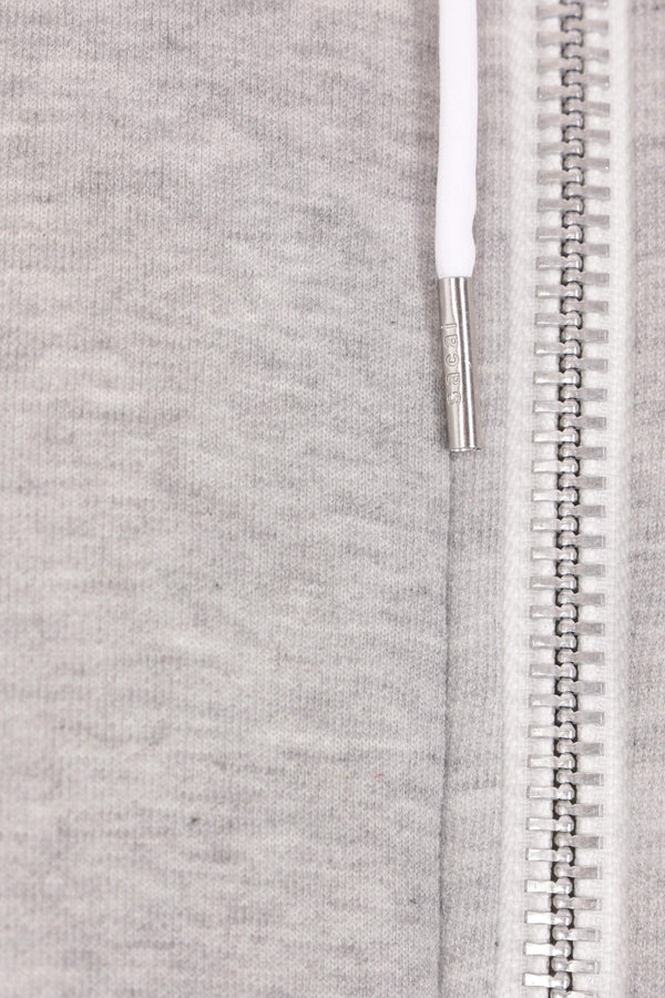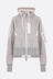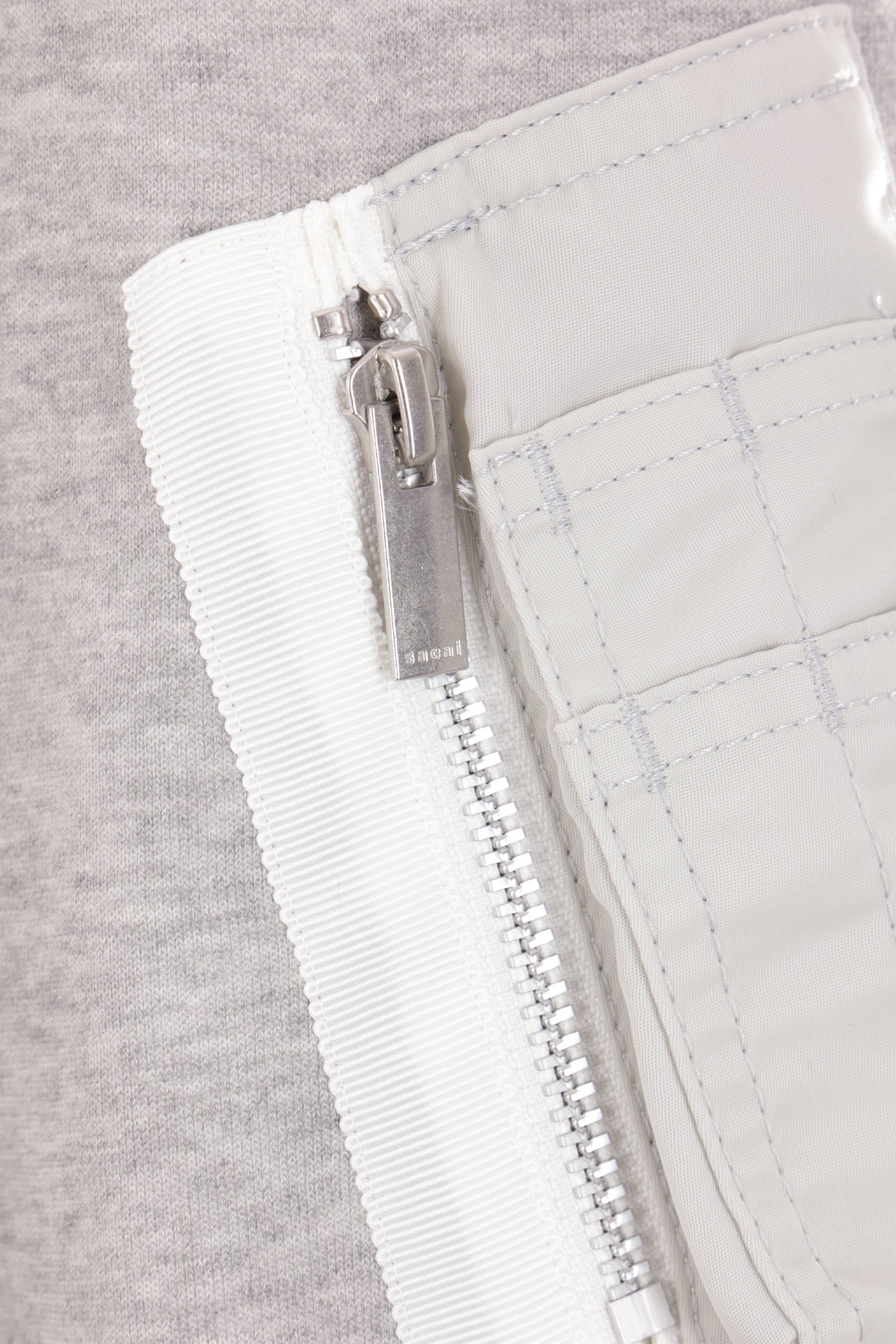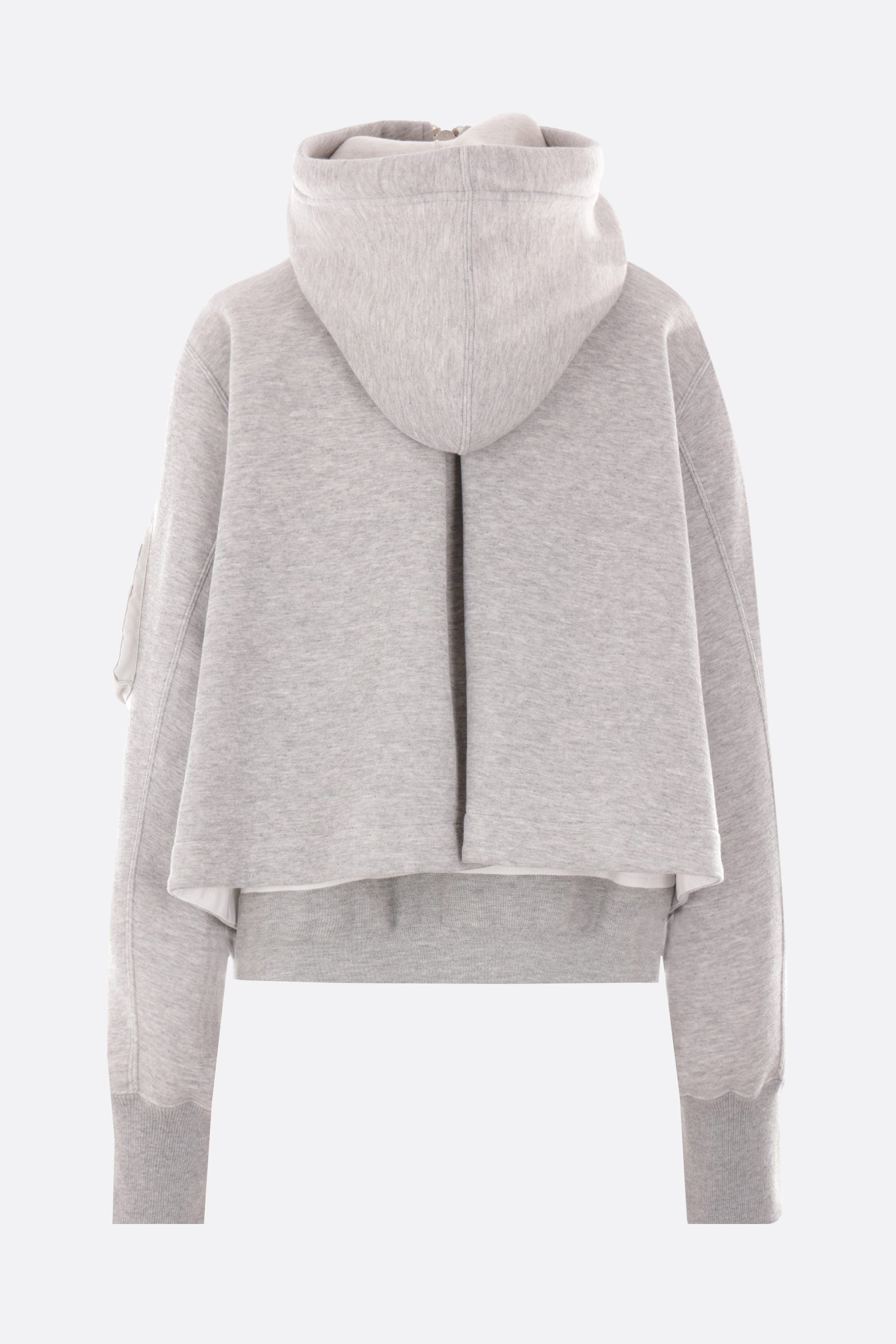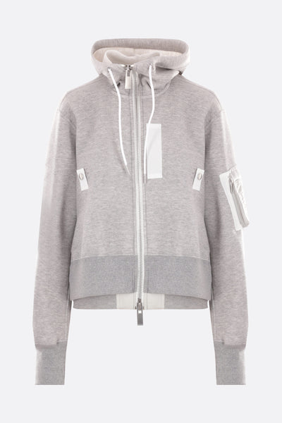 Felpa con cappuccio di Sacai realizzata in jersey di misto cotone color grigio chiaro con inserti in twill di nylon color bianco. Caratterizzata da chiusura con zip a doppio cursore, tasche multiple, maniche lunghe, bordi a costine e doppio fondo.