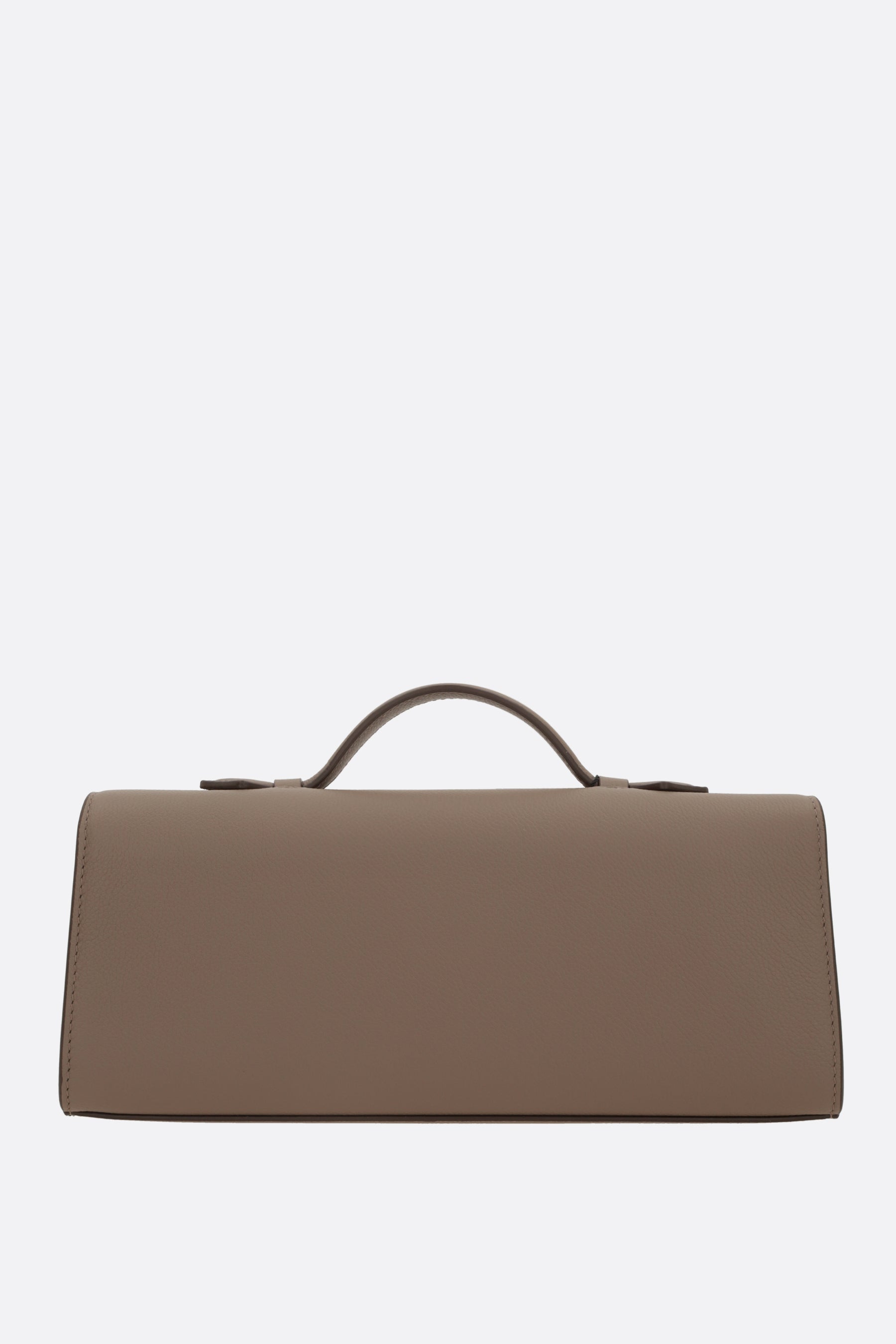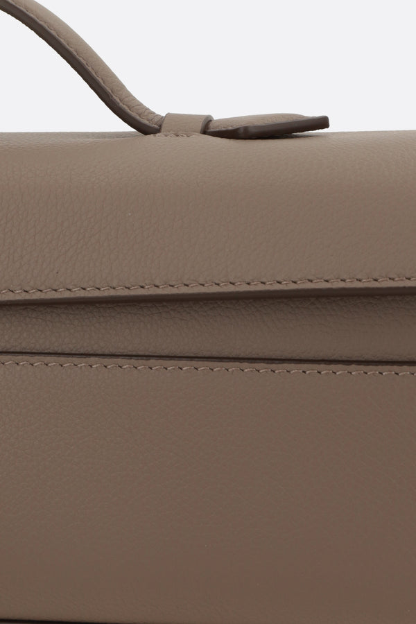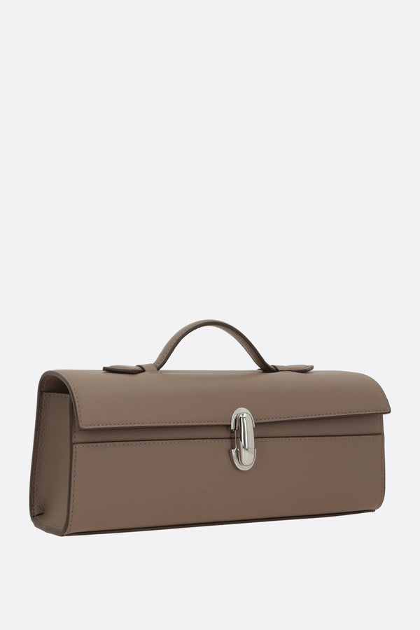 Borsa a mano di Savette realizzata in pelle martellata color talpa. Caratterizzata da metalleria color argento, chiusura turn-lock su patta e manico piatto. L'interno foderato in pelle tono su tono è dotato di fessura per carte. Completa il design l'inconfondibile logo lettering impresso sotto la patta.