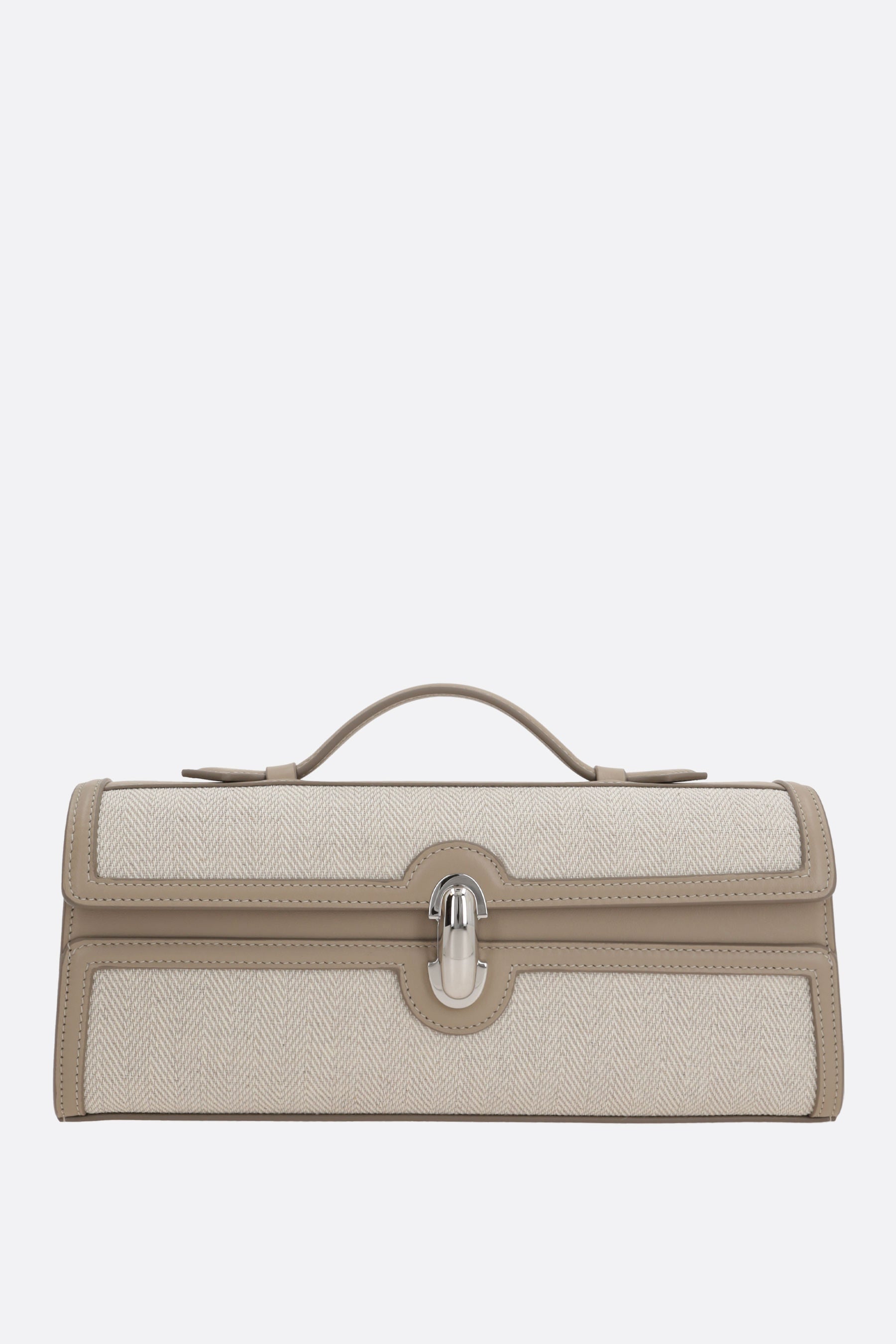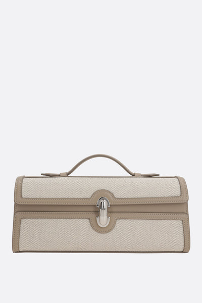 Borsa a mano di Savette realizzata in lino a motivo spigato con finiture in pelle liscia color beige. Caratterizzata da metalleria color argento, chiusura turn-lock su patta e manico piatto. L'interno foderato in pelle tono su tono è dotato di fessura per carte. Completa il design l'inconfondibile logo lettering impresso sotto la patta.