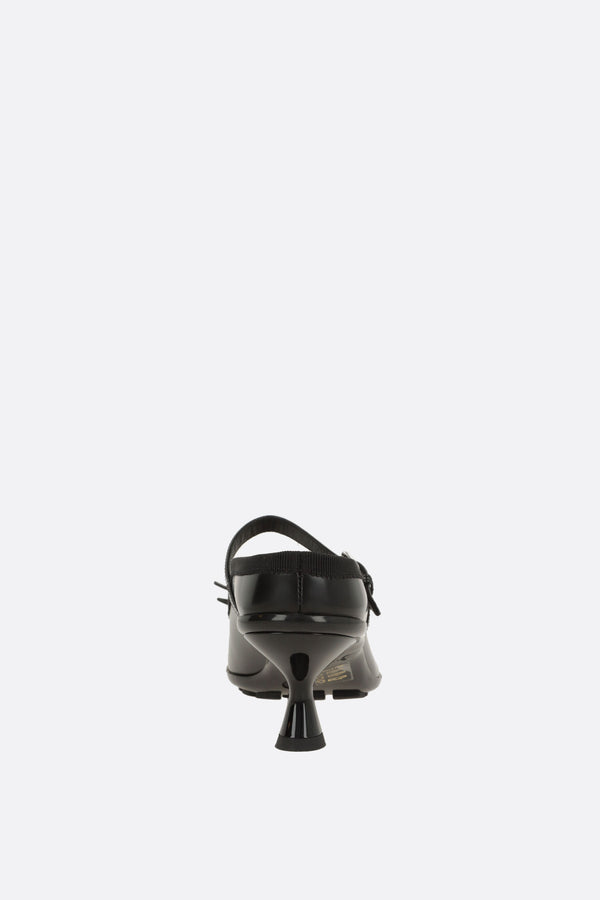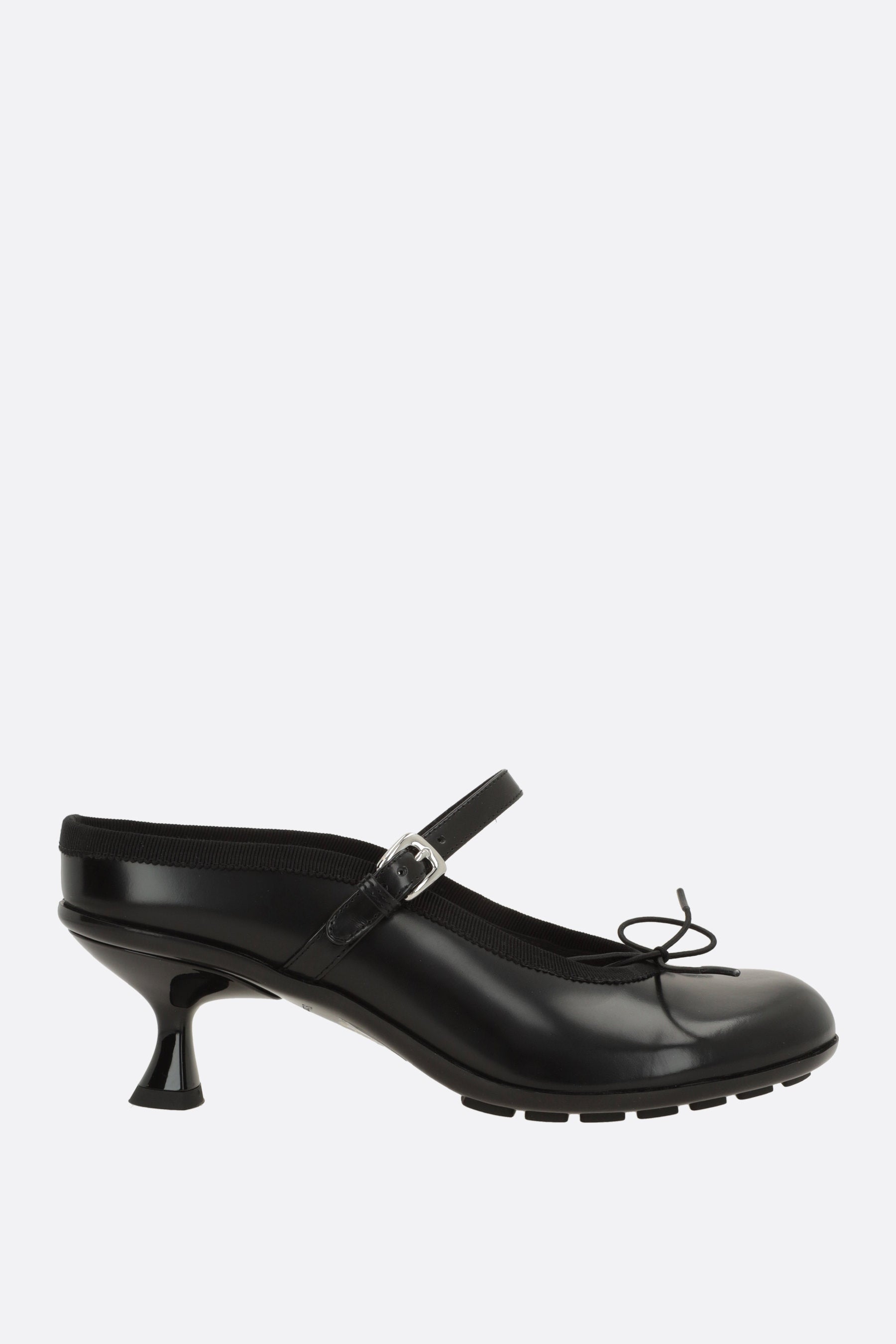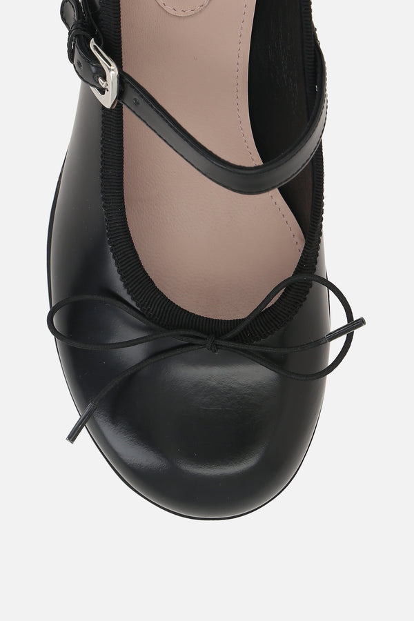 Mule di Simone Rocha realizzata in pelle lucida color nero con fiocco frontale e profili in gros grain tono su tono. Caratterizzata da punta tonda, cinturino frontale regolabile con fibbia metallica, fodere in pelle e suola in gomma. Completa il design il tacco a rocchetto laccato.