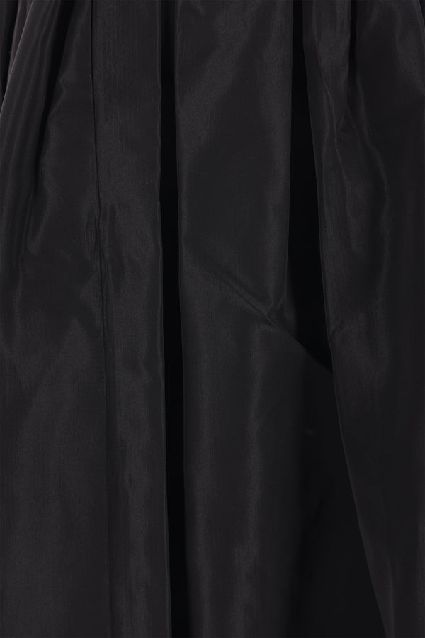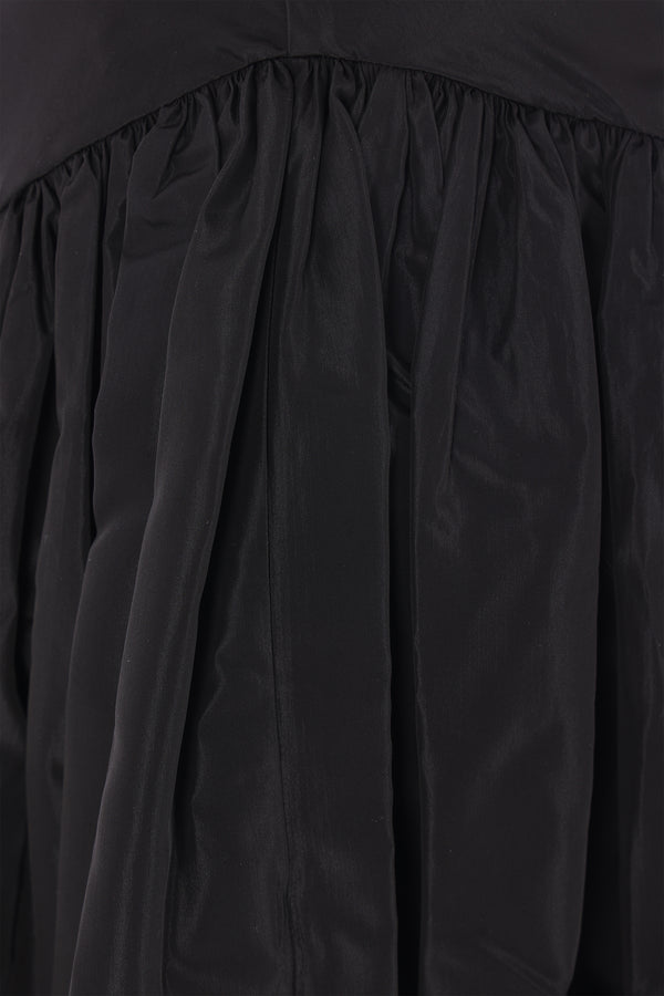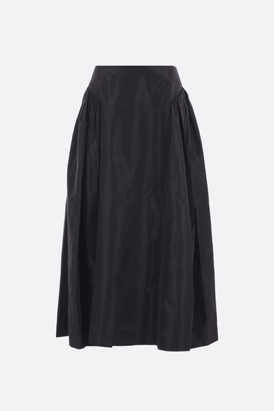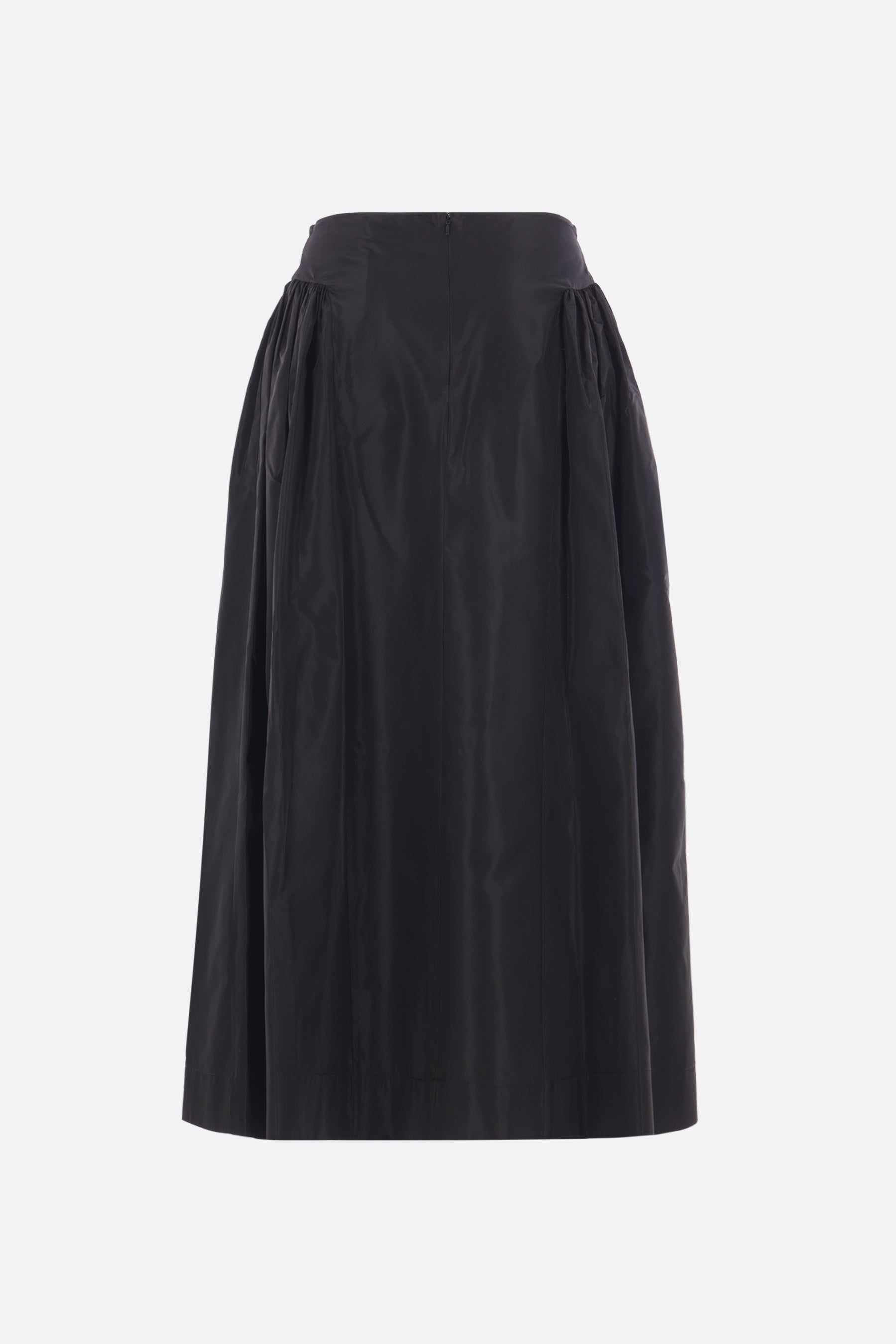 Gonna midi di Simone Rocha realizzata in taffetà color nero. Caratterizzata da chiusura posteriore con zip, tasche invisibili ai lati, arricciature sui fianchi e interno sfoderato.