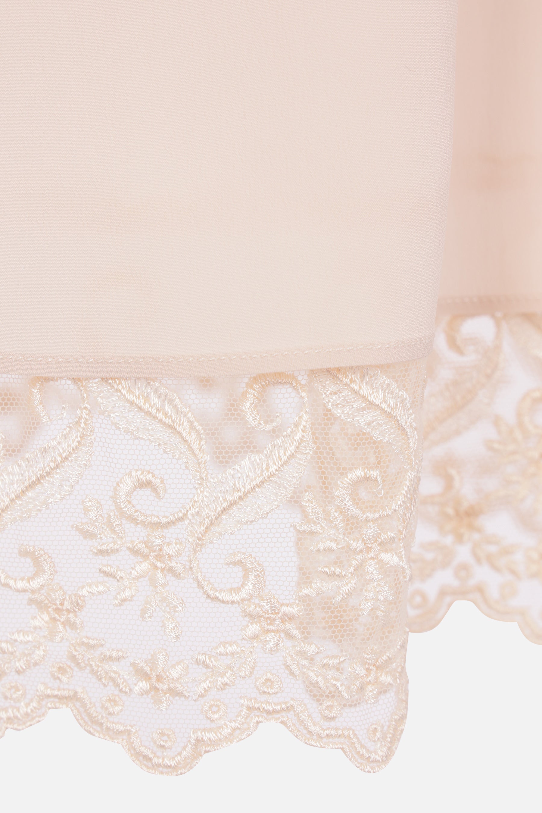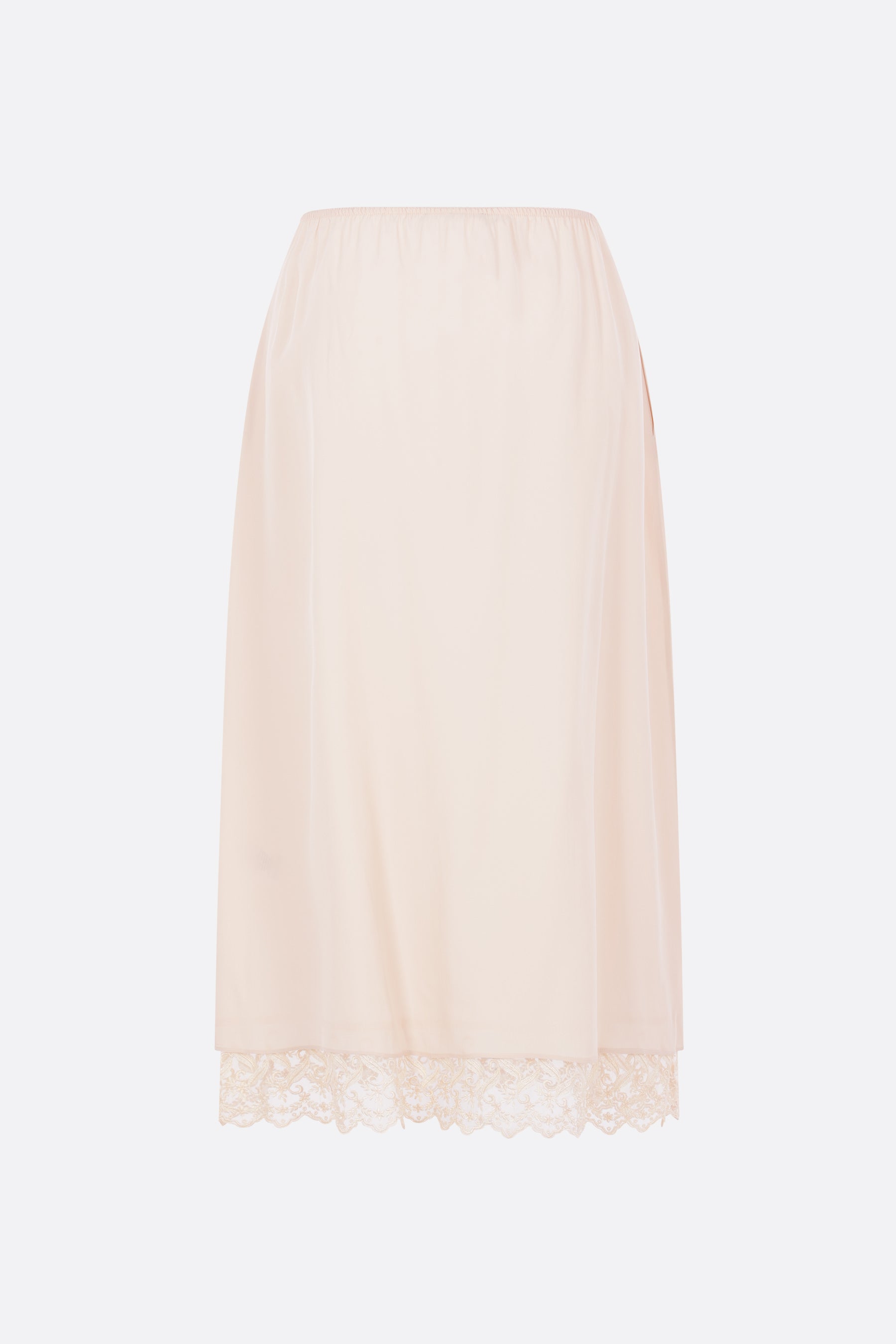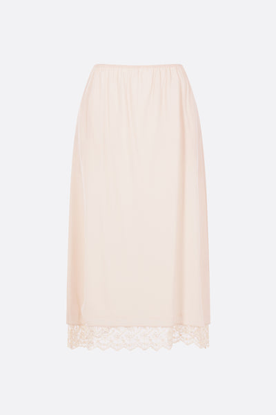 Gonna midi di Simone Rocha realizzata in crepe de chine di misto seta color nude con bordo in pizzo smerlato. Caratterizzata da fascia elasticizzata in vita, tasche invisibili ai lati e interno foderato.