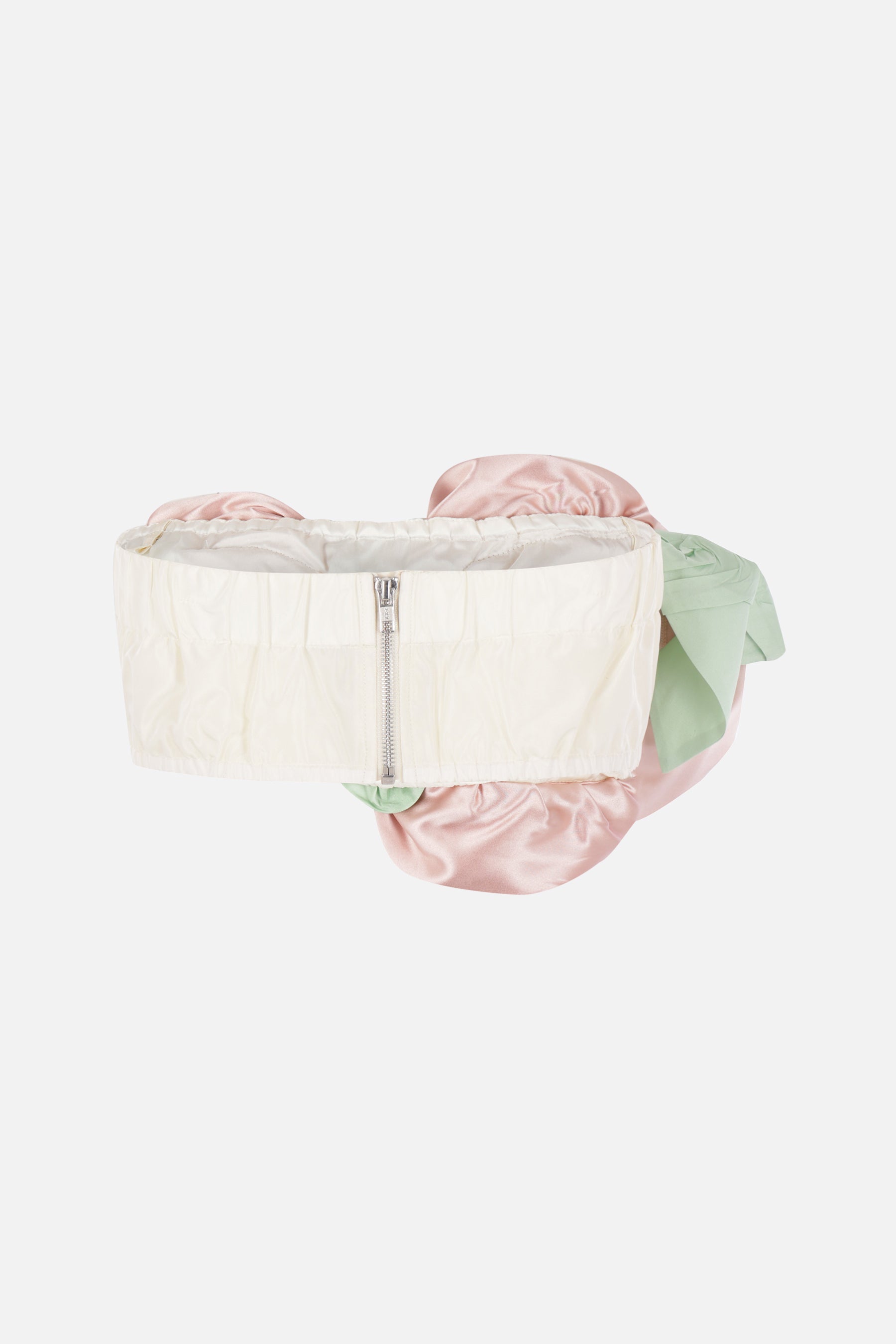 Top a fascia di Simone Rocha realizzato in taffetà color crema con rose in raso multicolore. Caratterizzato da scollatura dritta, chiusura posteriore con zip, bordi elasticizzati e interno foderato.