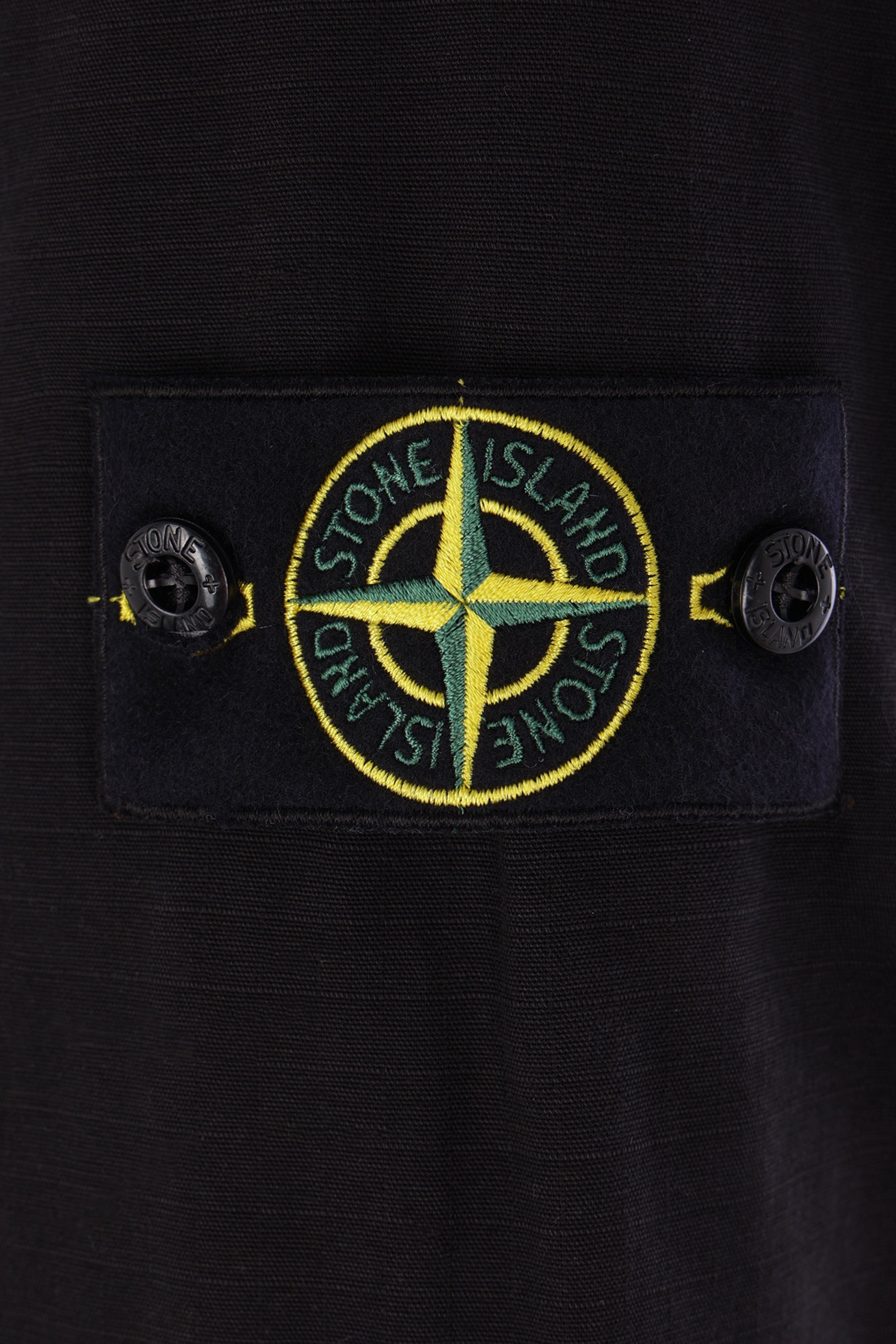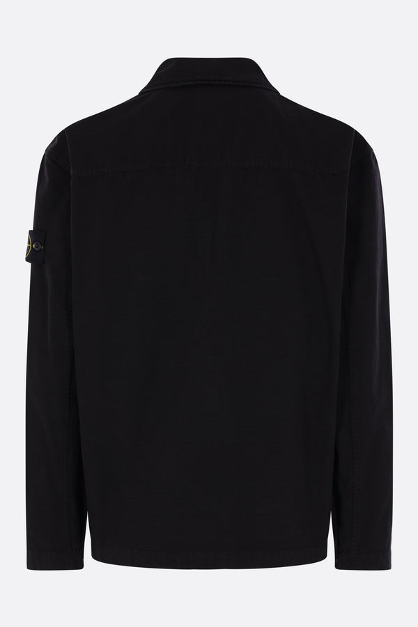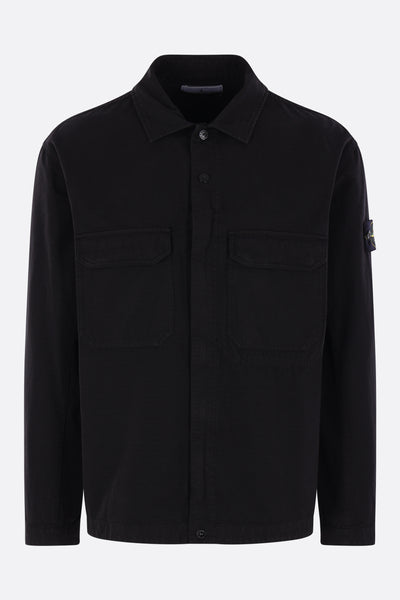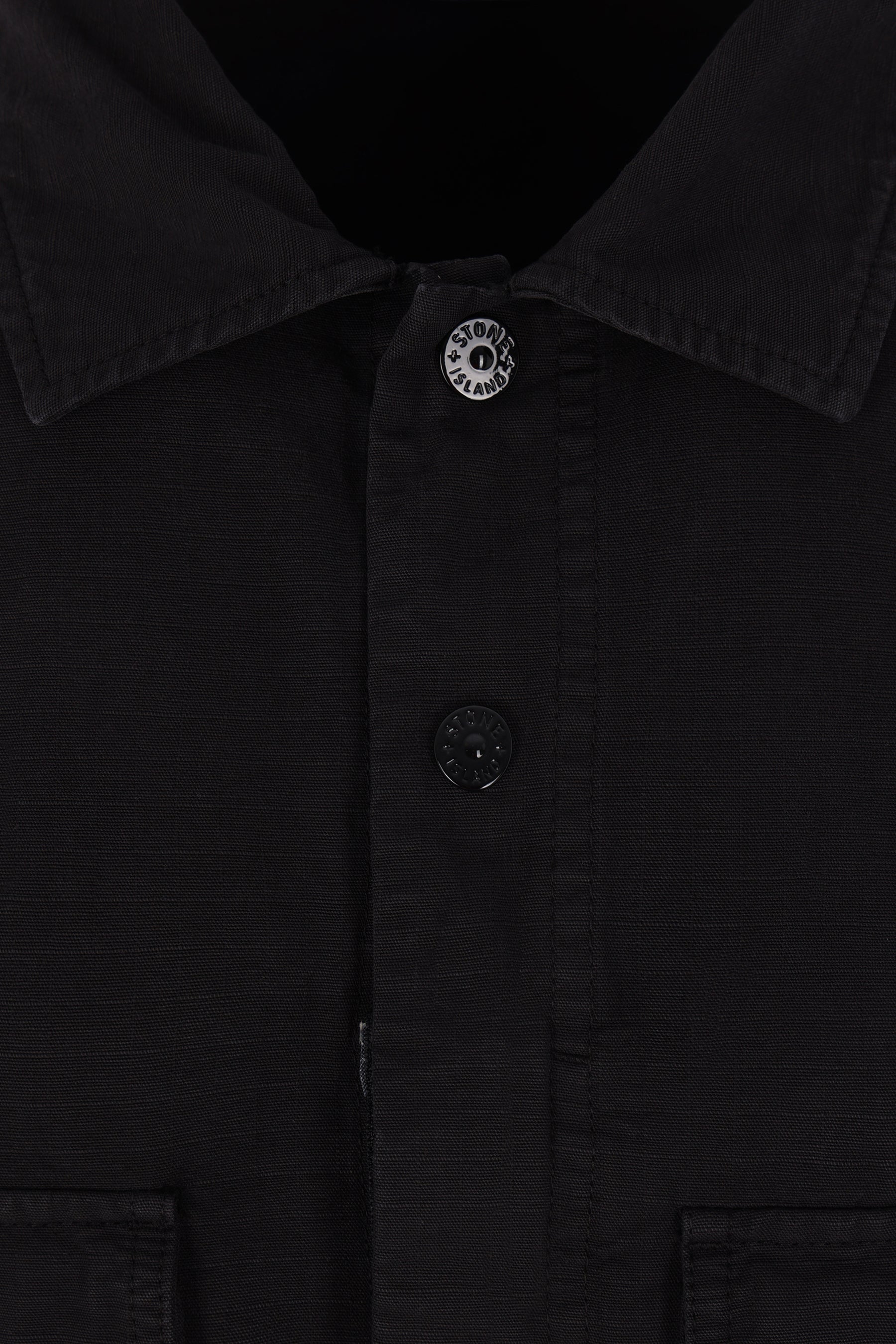 Giacca-camicia di Stone Island realizzata in cotone ripstop color nero. Caratterizzata da colletto a punta, chiusura frontale con zip nascosta e bottoni, tasche con patta sul petto, maniche lunghe con polsini abbottonati e fondo dritto. Interno sfoderato. Completa il design l'iconico badge logo removibile.