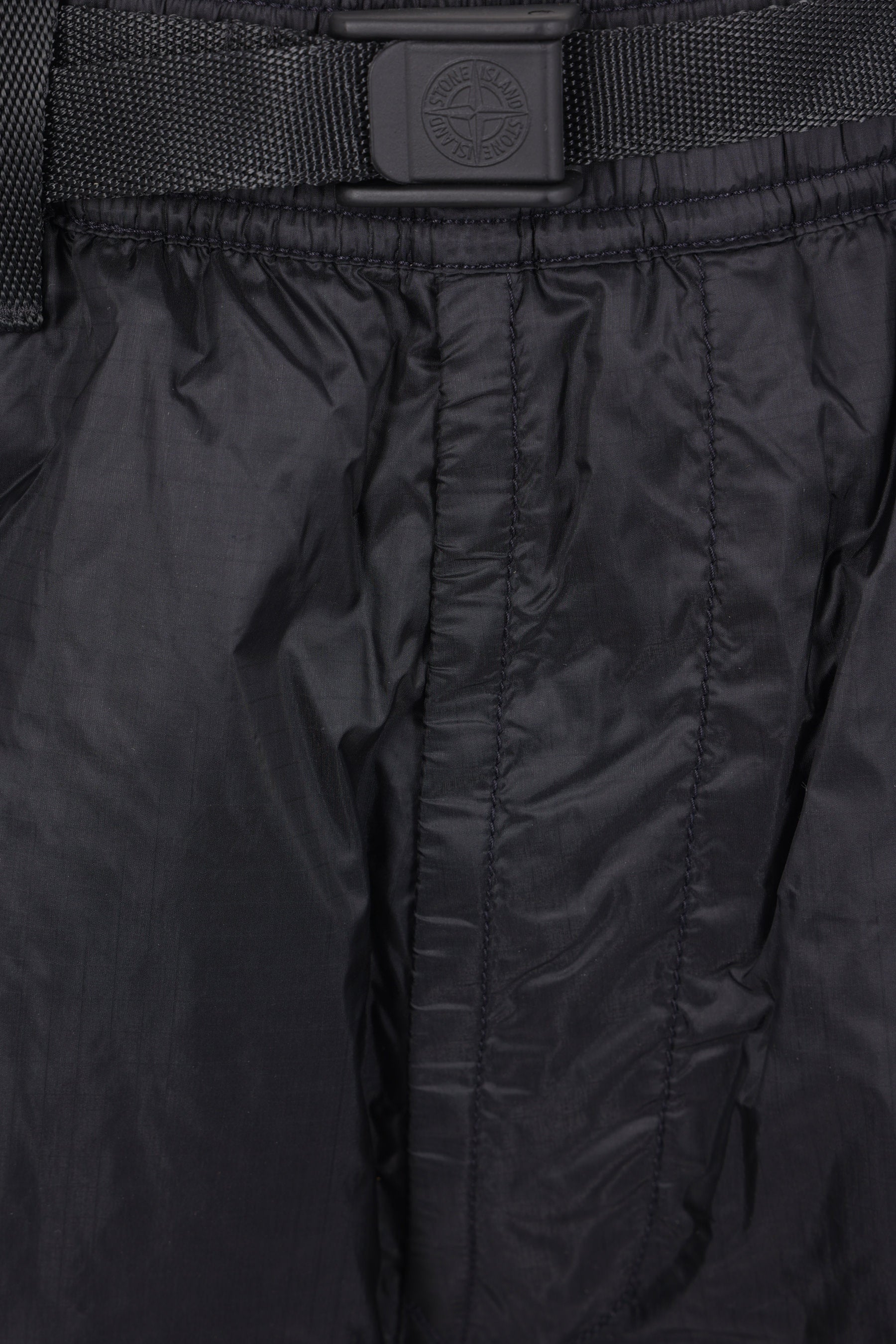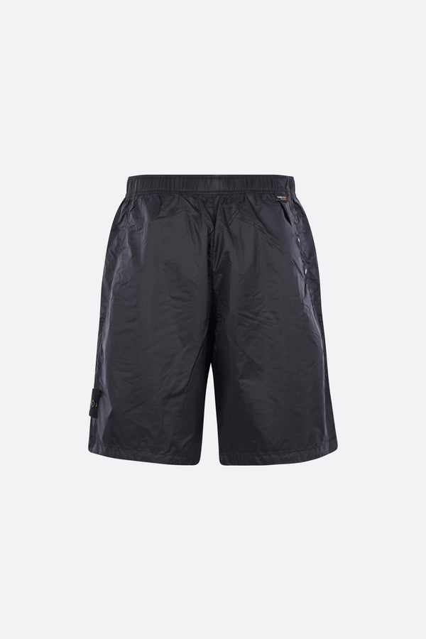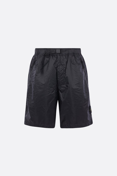 Pantalone corto di Stone Island realizzato in nylon ripstop CORDURA® color blu scuro con badge logo removibile. Caratterizzato da fascia elasticizzata in vita con cintura regolabile, zip frontale, tasche multiple e interno foderato.