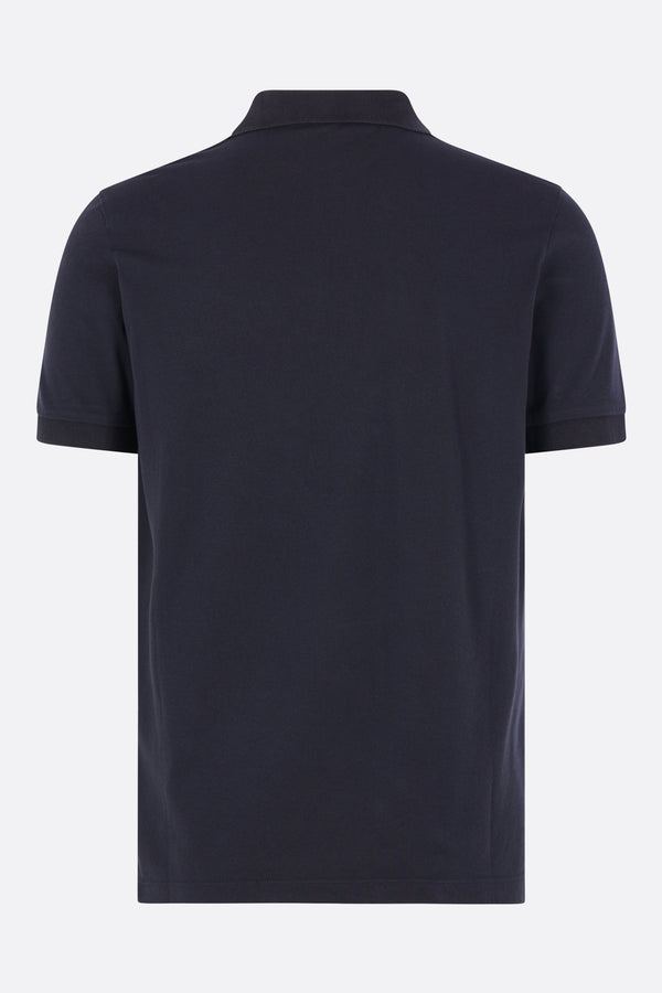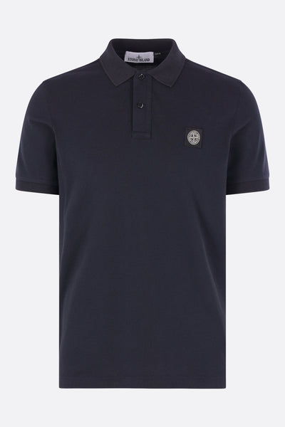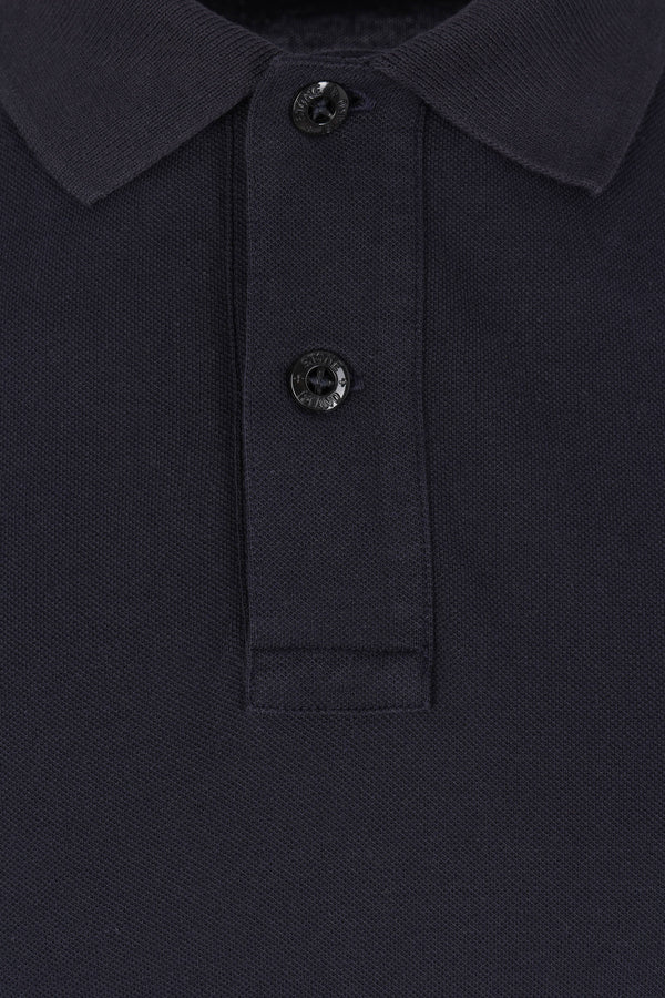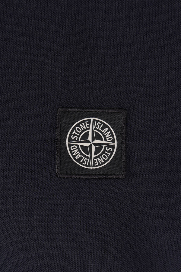 Polo di Stone Island realizzata in piquet di cotone stretch color blu con patch logo Compass sul petto. Caratterizzata da colletto a polo, chiusura frontale con due bottoni, maniche corte e fondo dritto con piccoli spacchi laterali.