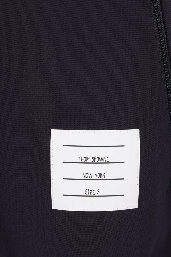 Bomber di Thom Browne realizzato in viscosa tecnica color blu con stampa 4-bar a contrasto sulla manica sinistra. Caratterizzato da collo bomber, chiusura frontale con zip a doppio cursore, tasche con zip, maniche lunghe e bordi a costine. Completa il design il passante a righe in gros grain sul retro del collo.