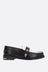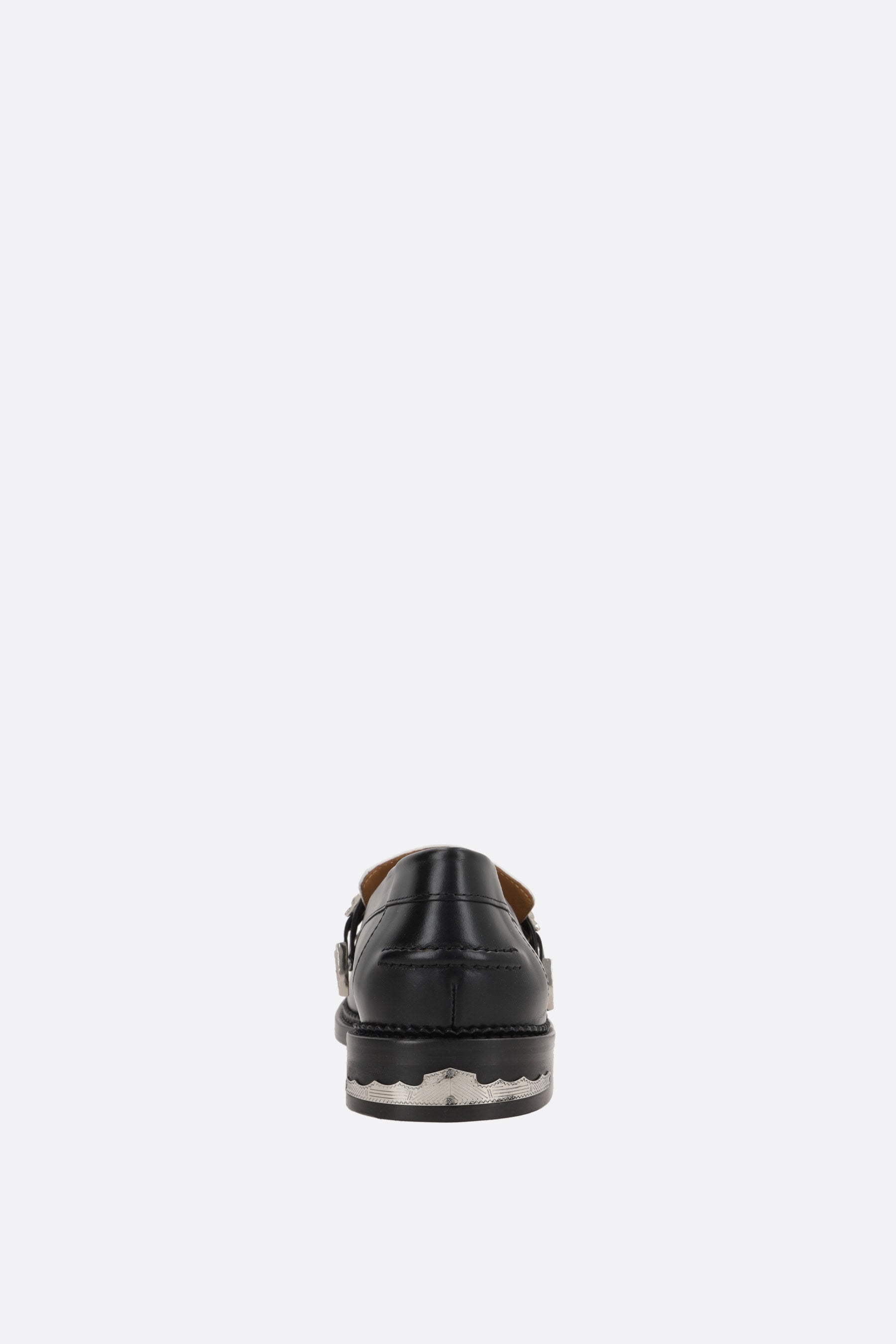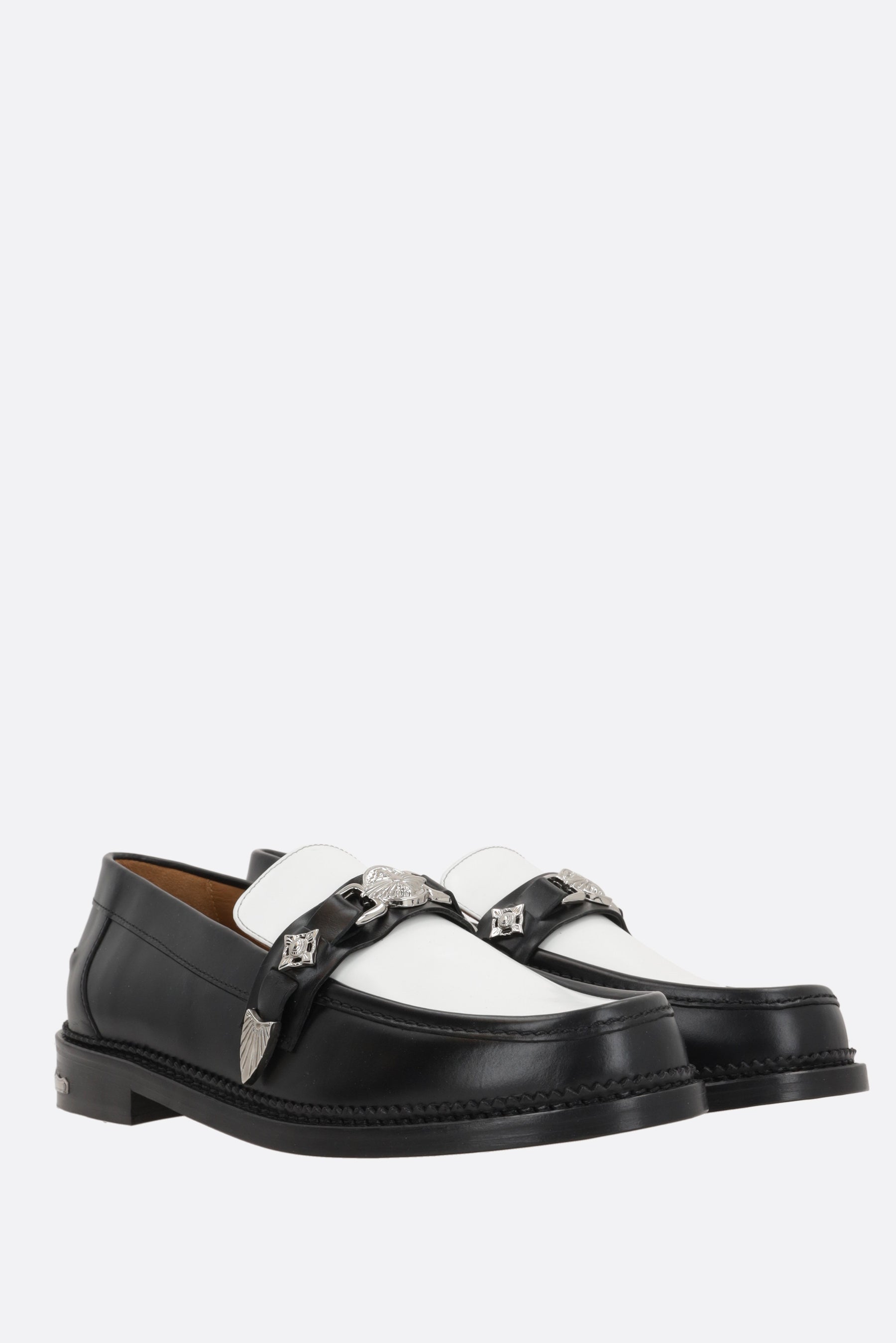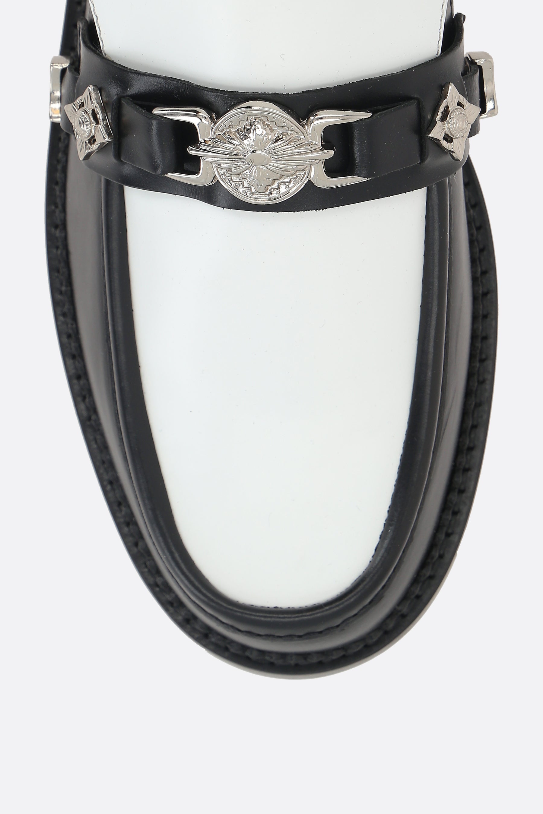 Mocassino di Toga Virilis realizzato in pelle spazzolata color nero e bianco con borchie stile western. Caratterizzato da punta tonda, fodere in pelle e suola in cuoio con dettaglio in metallo sul tallone.