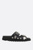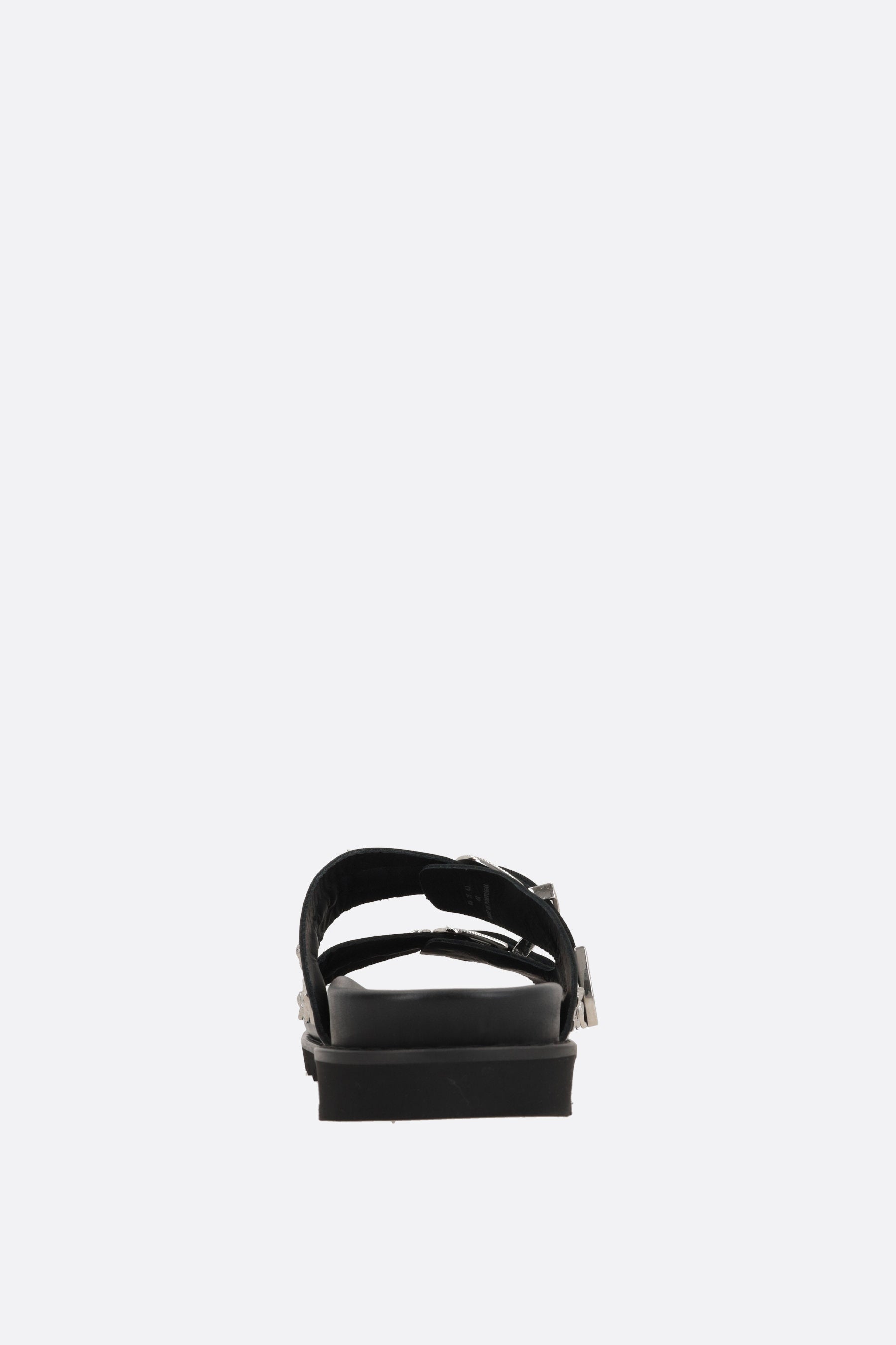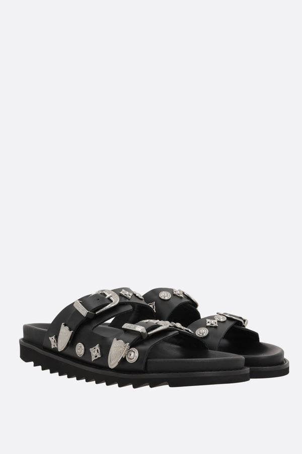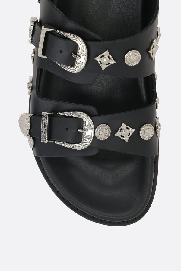 Sandalo flat di Toga Virilis realizzato in pelle liscia color nero con borchie decorative finitura argento. Caratterizzato da doppio cinturino regolabile con fibbia metallica, punta tonda, fodere in pelle e suola seghettata in gomma.