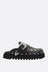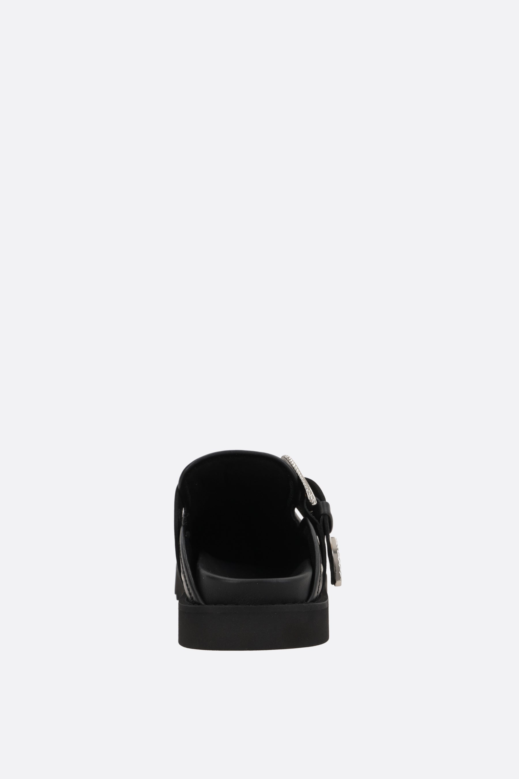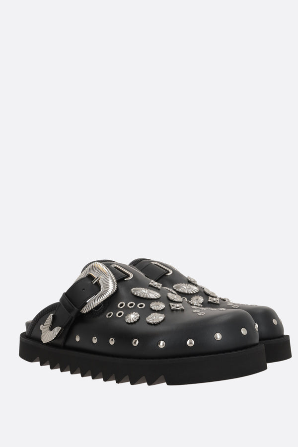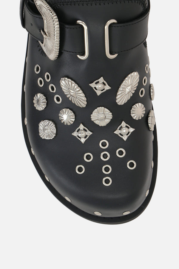 Mule flat di Toga Virilis realizzata in pelle liscia color nero con borchie metalliche e occhielli sulla tomaia. Caratterizzata da punta tonda, cinturino regolabile con fibbia, fodere in pelle e suola in gomma dentellata.