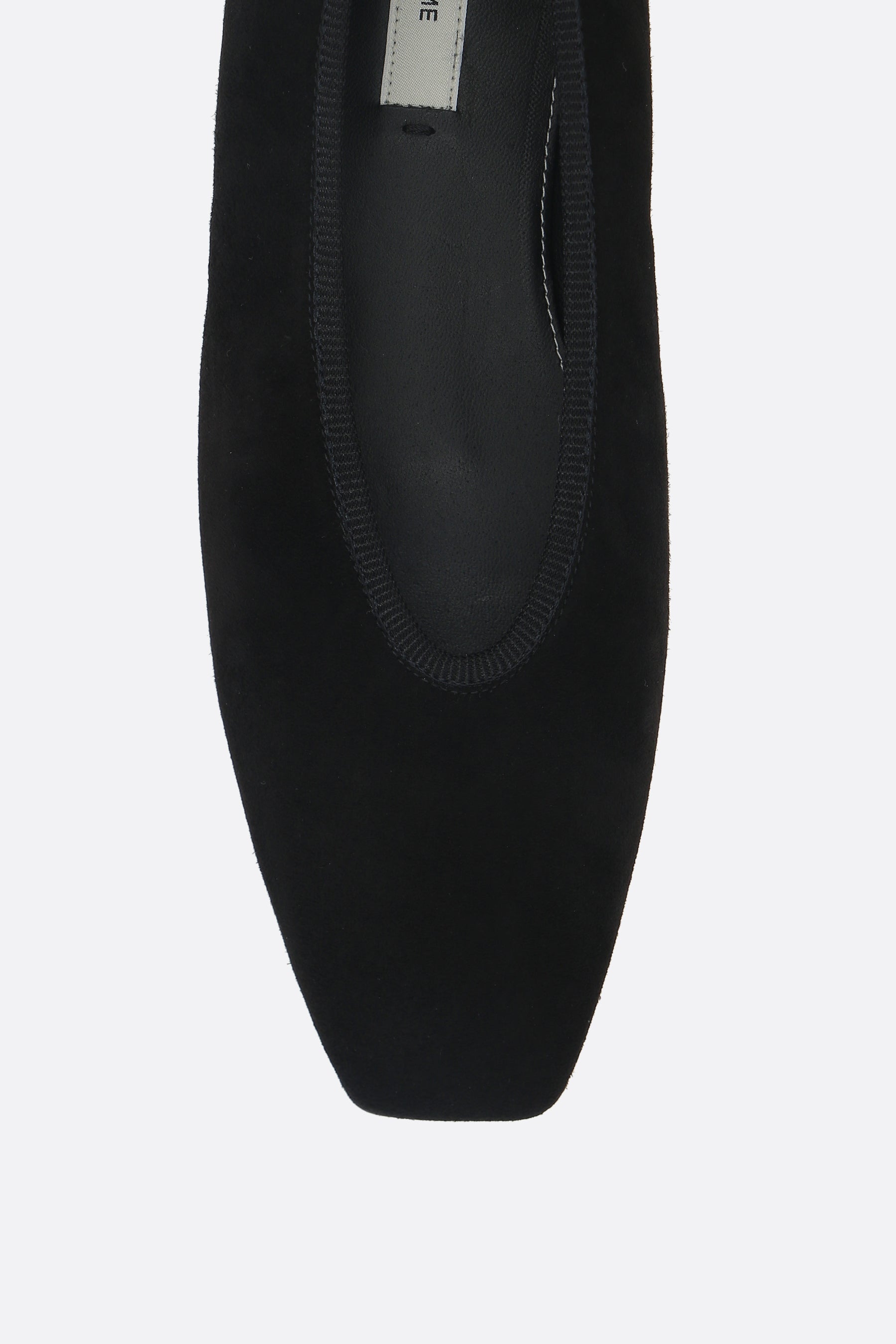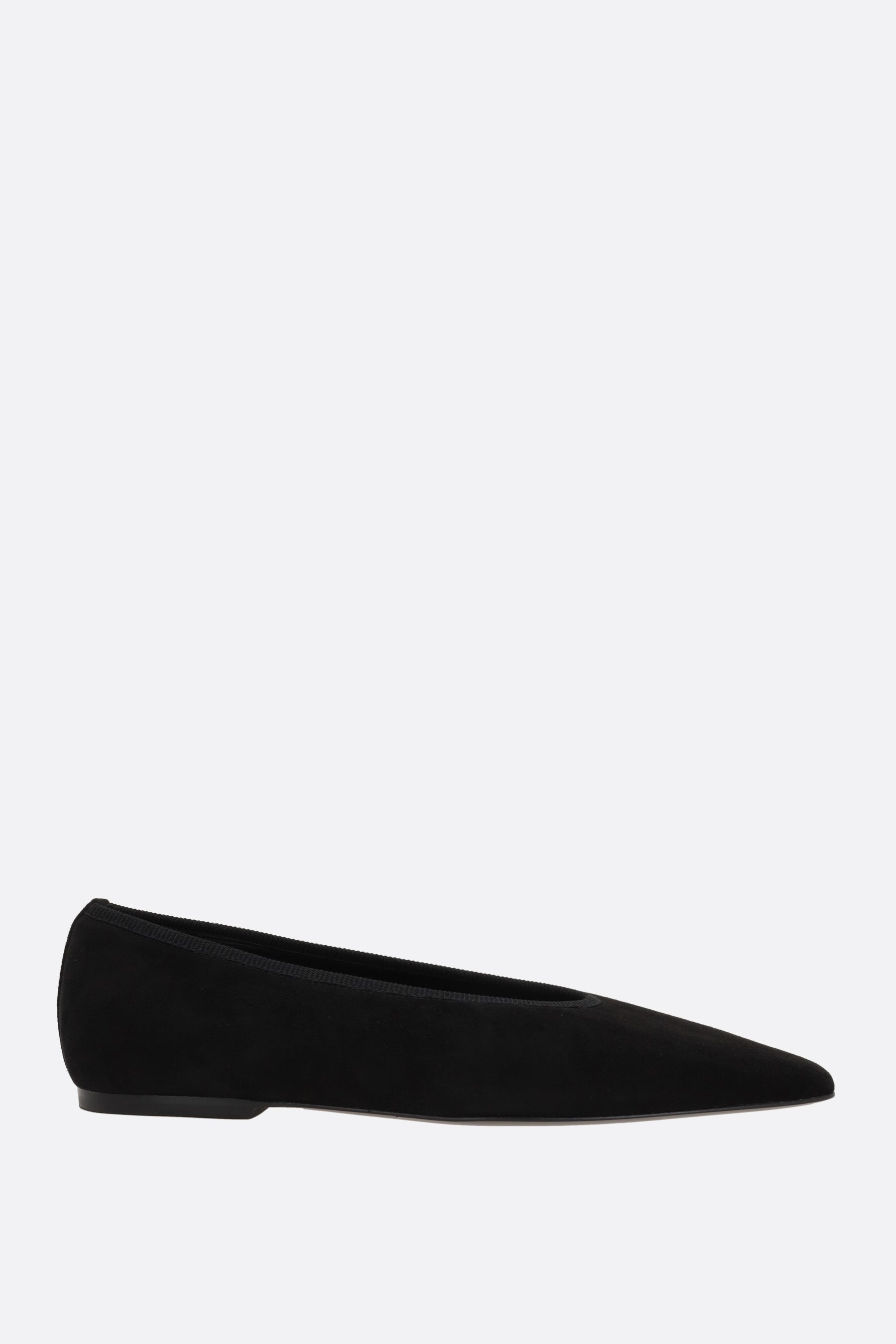 Ballerina di Toteme realizzata in suede color nero con profilo a costine. Caratterizzata da punta squadrata, fodere in pelle e suola in cuoio.