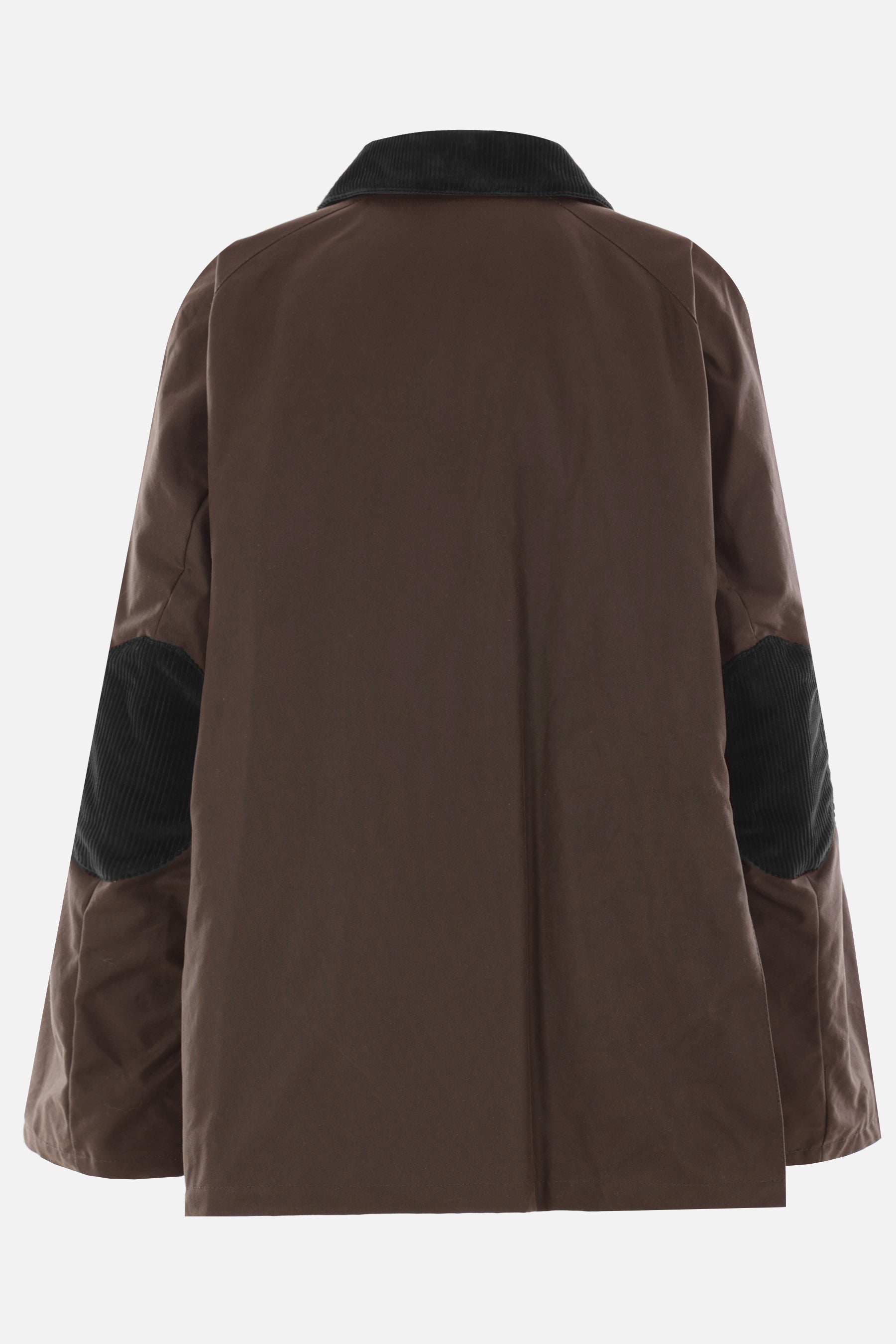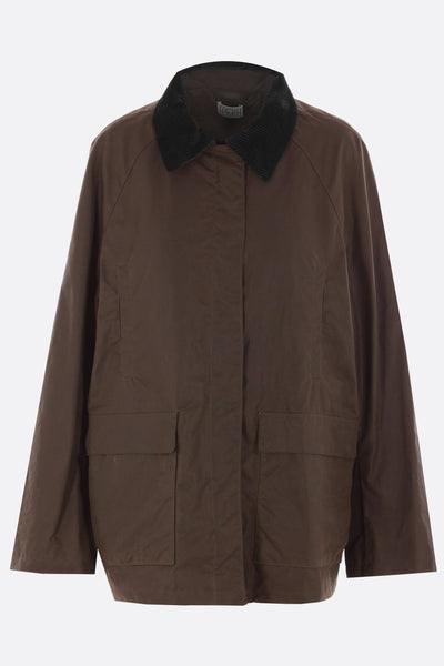 Giacca oversize di Toteme realizzata in cotone cerato color marrone. Caratterizzata da colletto a punta in velluto a coste, chiusura frontale con zip a doppio cursore / bottoni automatici, tasche multiple, maniche lunghe con toppe sui gomiti, spacchi sul retro e interno trapuntato.