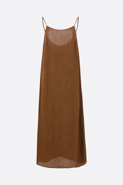 Abito sottoveste di Uma Wang realizzato in viscosa color marrone con effetto stropicciato. Caratterizzato da ampia scollatura, spalline sottili regolabili e fondo dritto.
