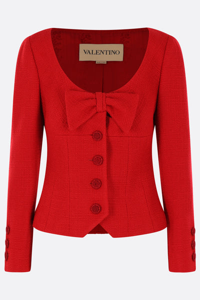 Giacca cropped di Valentino Garavani realizzata in Plain Wool Tweed color rosso con fiocco frontale. Caratterizzata da ampia scollatura, chiusura frontale con bottoni soutache, maniche lunghe con polsini abbottonati e fondo dritto. Interno foderato in jacquard di misto seta.