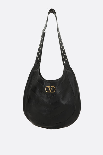 Borsa hobo di Valentino Garavani realizzata in un patchwork di nappa lucida e opaca a motivo chevron. Caratterizzata da metalleria color argento, spallaccio regolabile con borchie e interno foderato in nappa tono su tono. Completa il design il dettaglio VLogo Signature in metallo color oro anticato.