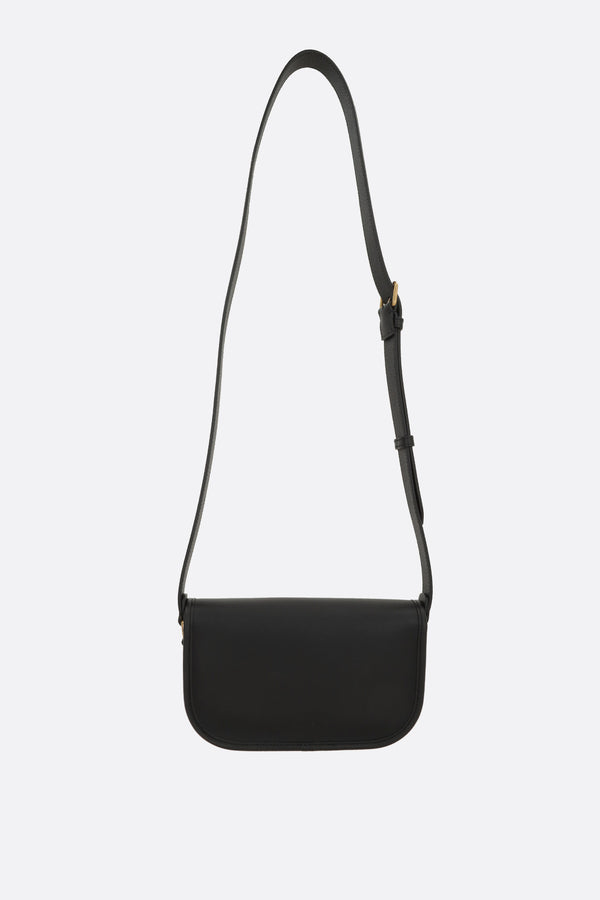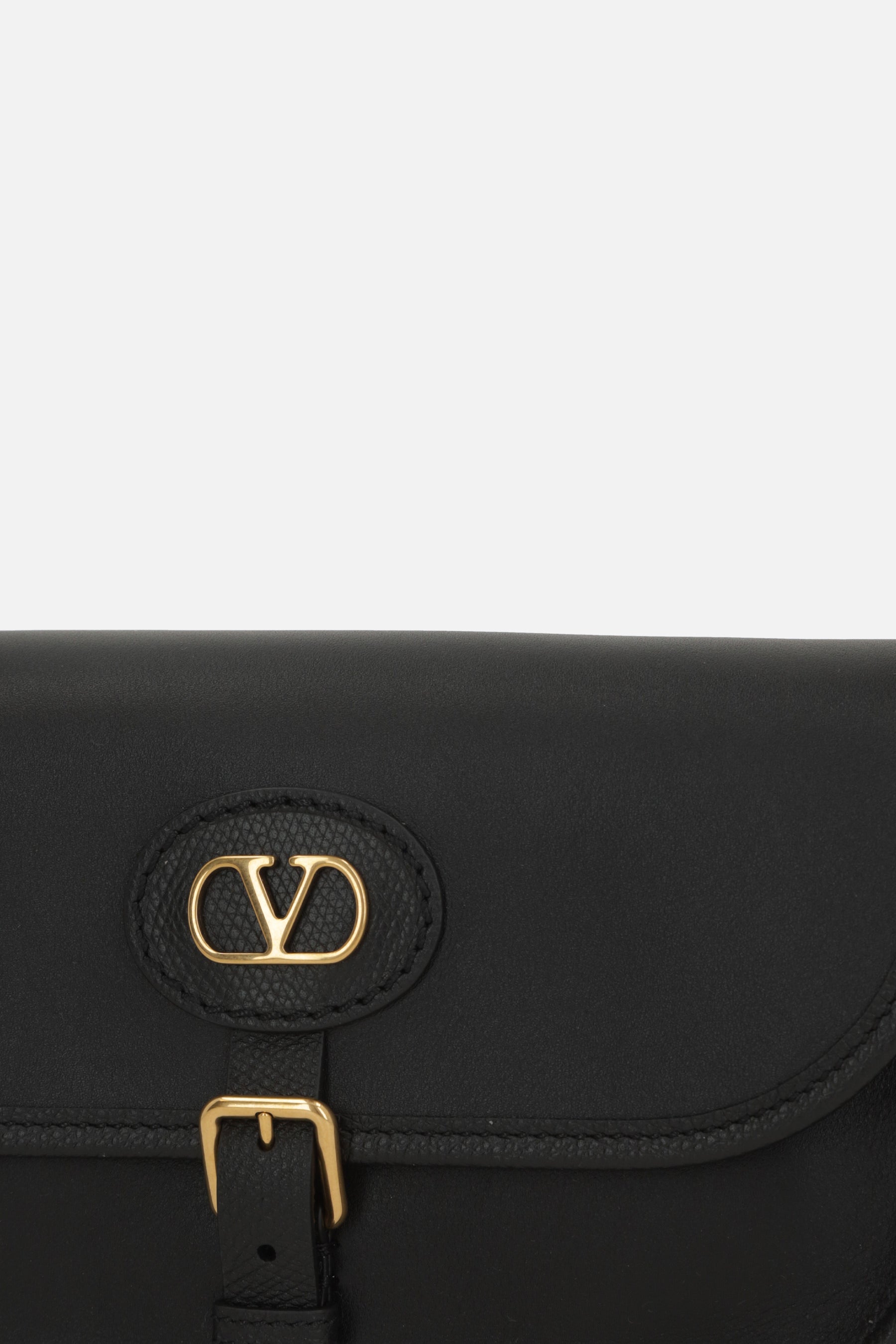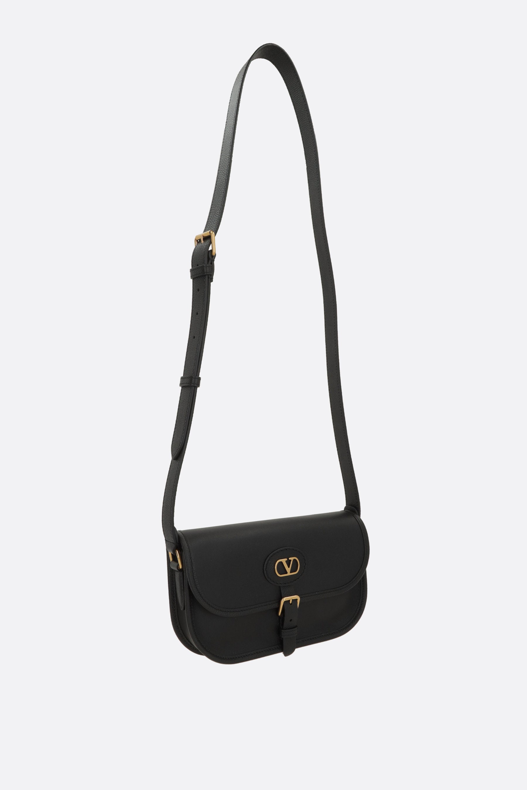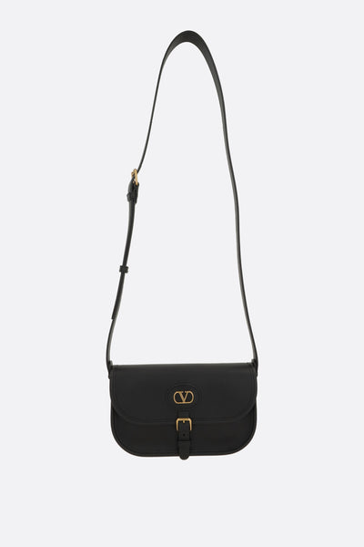 Borsa a tracolla di Valentino Garavani realizzata in pelle liscia color nero con finitura martellata sui bordi. Caratterizzata da metalleria color oro, chiusura con bottone magnetico / fibbia su patta e tracolla regolabile. L'interno foderato in suede color nero è dotato di tasca con zip e due fessure per carte. Completa il design la patch Vlogo Signature.