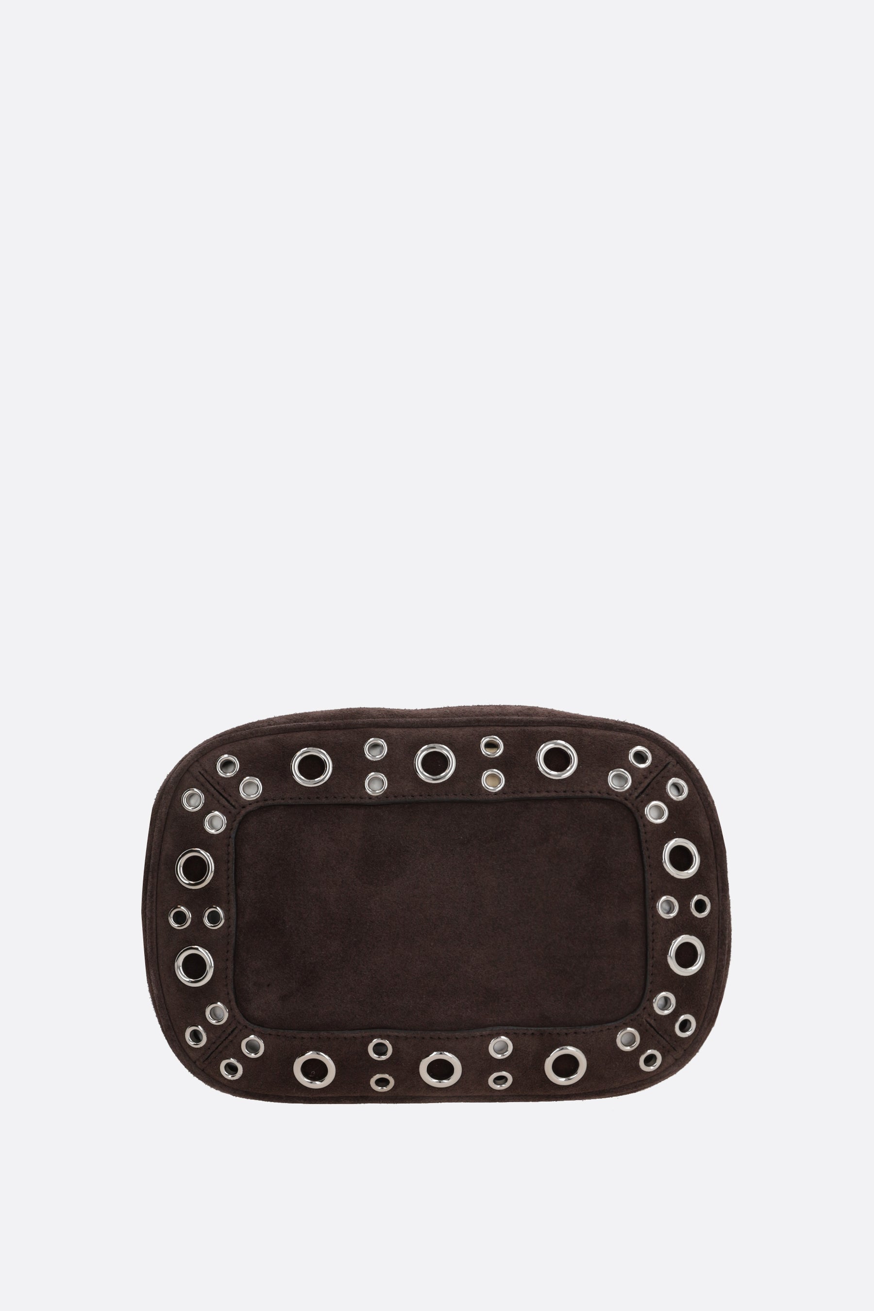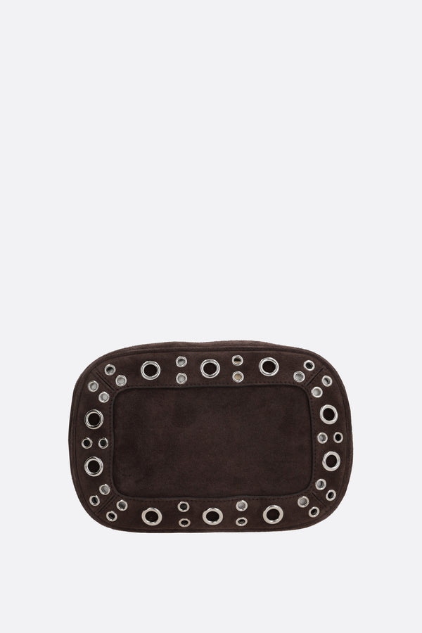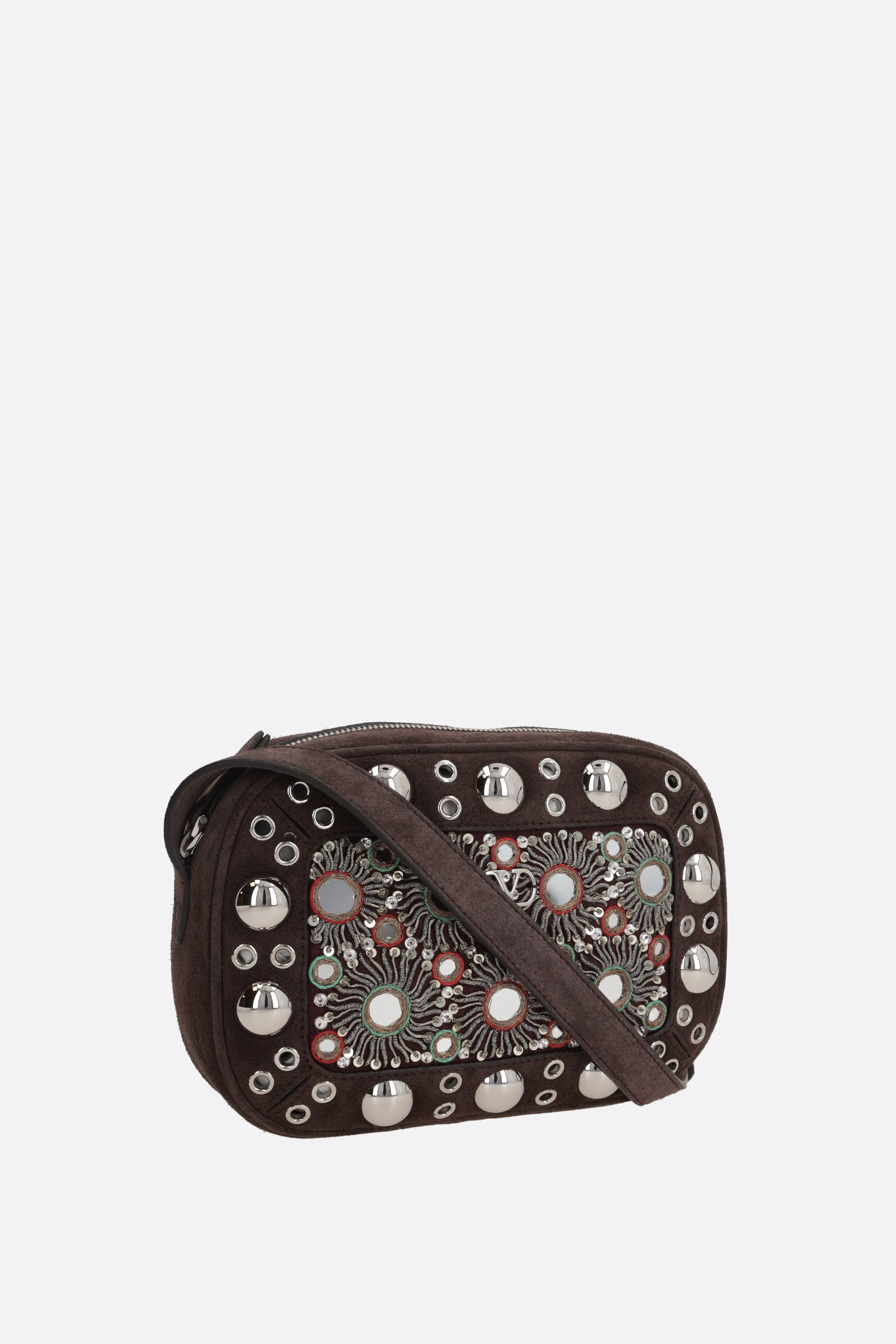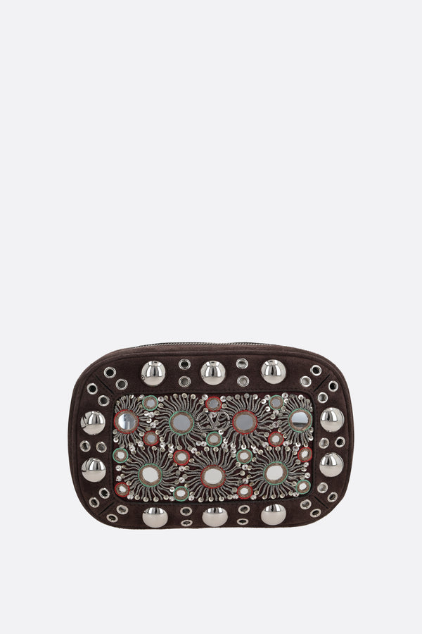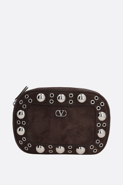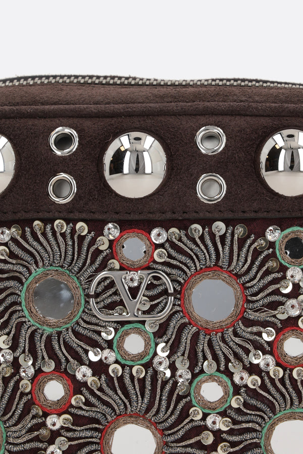 Borsa a tracolla di Valentino Garavani realizzata in suede color marrone con borchie a sfera e rivetti lungo i profili e ricamo con specchietti sul davanti. Caratterizzata da metalleria color argento, chiusura con zip e tracolla regolabile. L'interno foderato in suede tono su tono è dotato di due fessure per carte. Completa il design l'iconico dettaglio VLogo Signature in metallo applicato frontalmente.