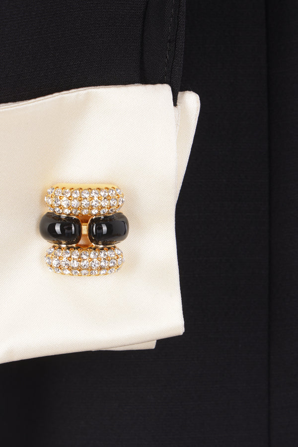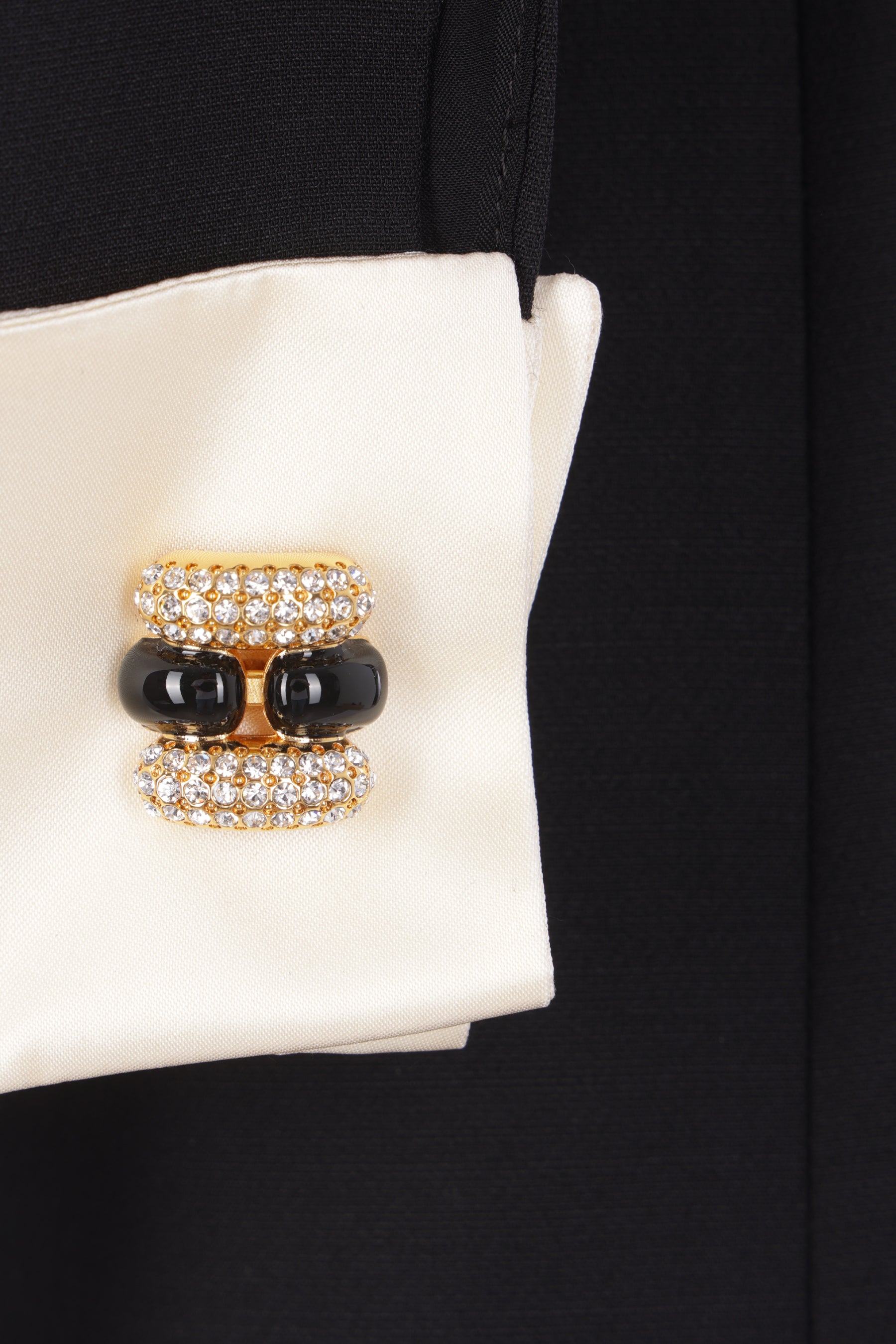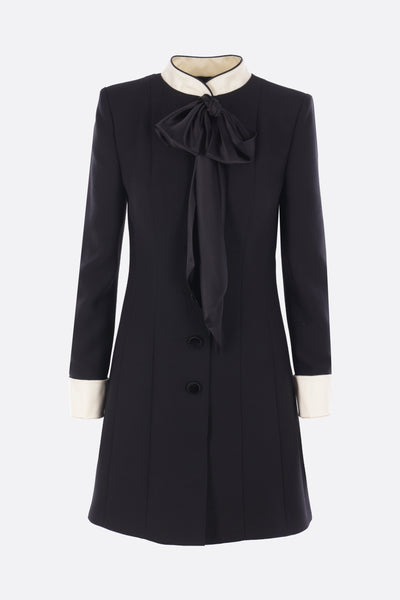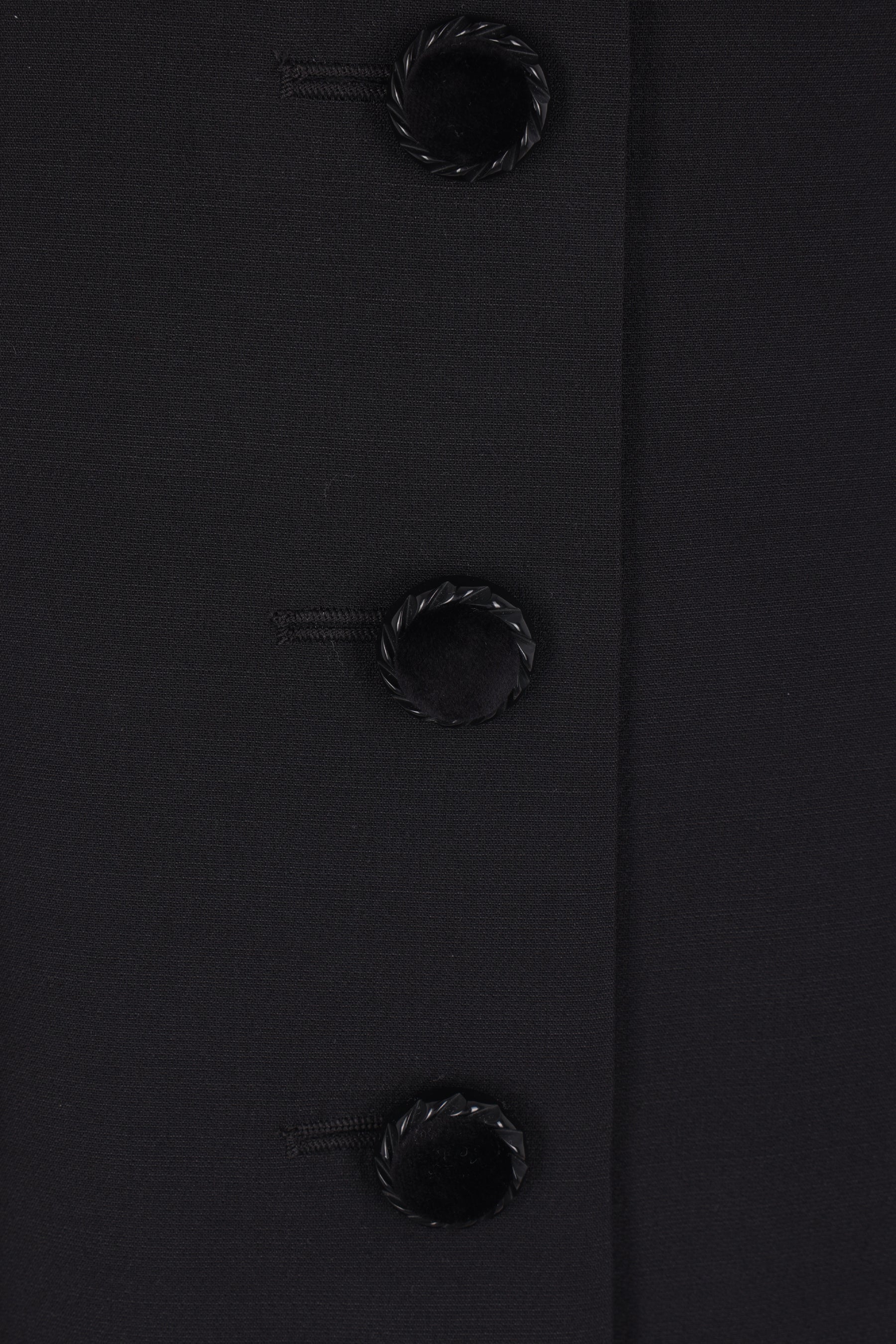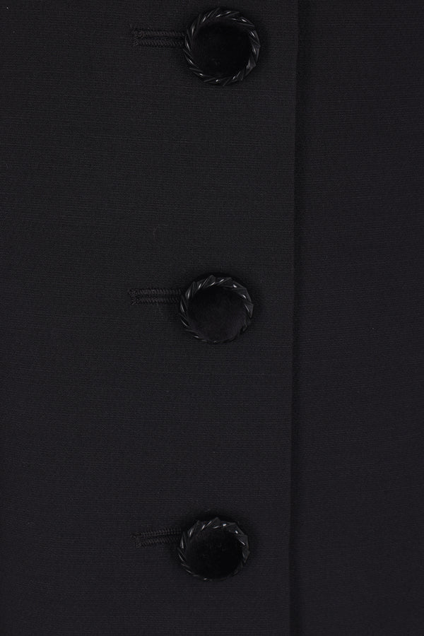 Miniabito di Valentino Garavani realizzato in Crepe Couture color nero con collo e polsi in Duchesse a contrasto. Caratterizzato da colletto alla coreana con fiocco in raso, chiusura frontale con bottoni Soutache, spalline imbottite, maniche lunghe, dettaglio bottoni gioiello sui pols,i fondo dritto e interno foderato in jacquard.