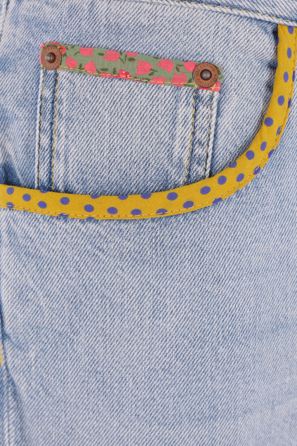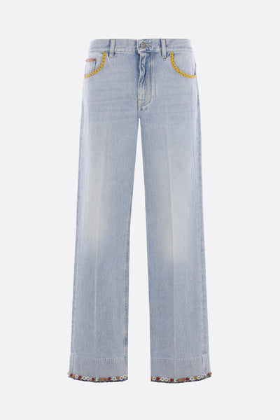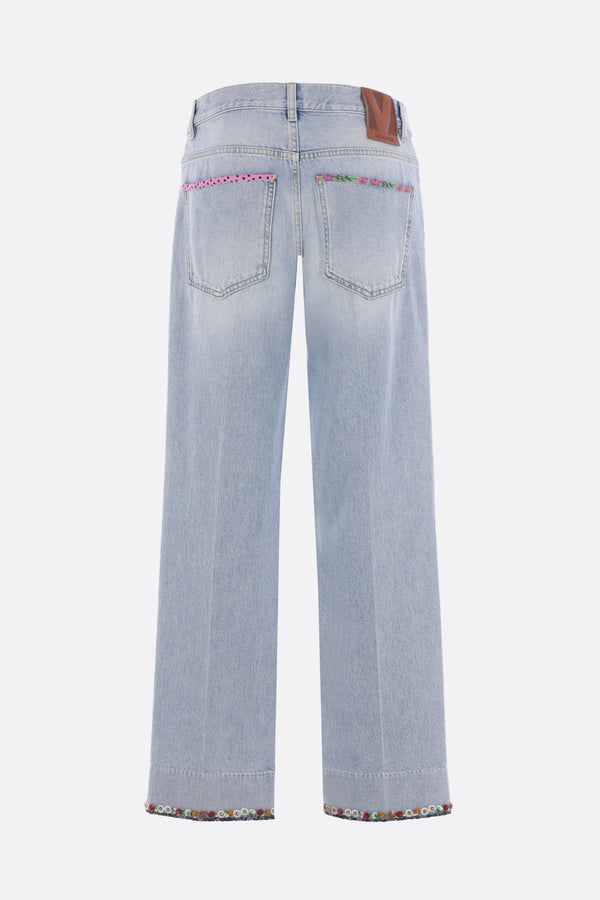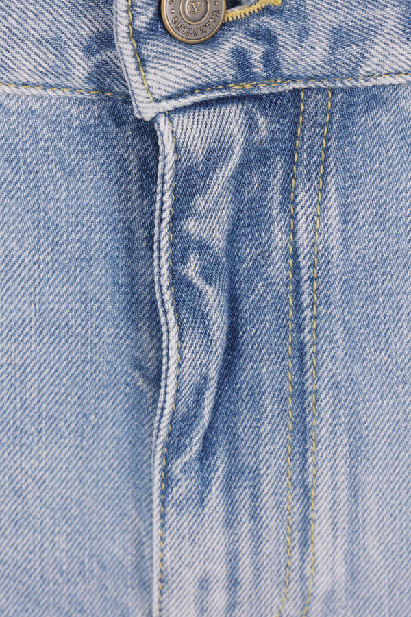 Jeans di Valentino Garavani realizzato in denim di cotone color azzurro. Caratterizzato da chiusura frontale con bottone metallico / zip, passanti per cintura, cinque tasche classiche con bordi stampati e piega centrale. Completano il design i ricami con fiorellini sul fondo.