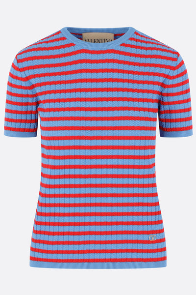 Pullover di Valentino Garavani realizzato in maglia di cotone a coste con motivo a righe color bluette e rosso. Caratterizzato da scollatura a giro, maniche corte e fondo dritto con dettaglio VLogo Signature in metallo.