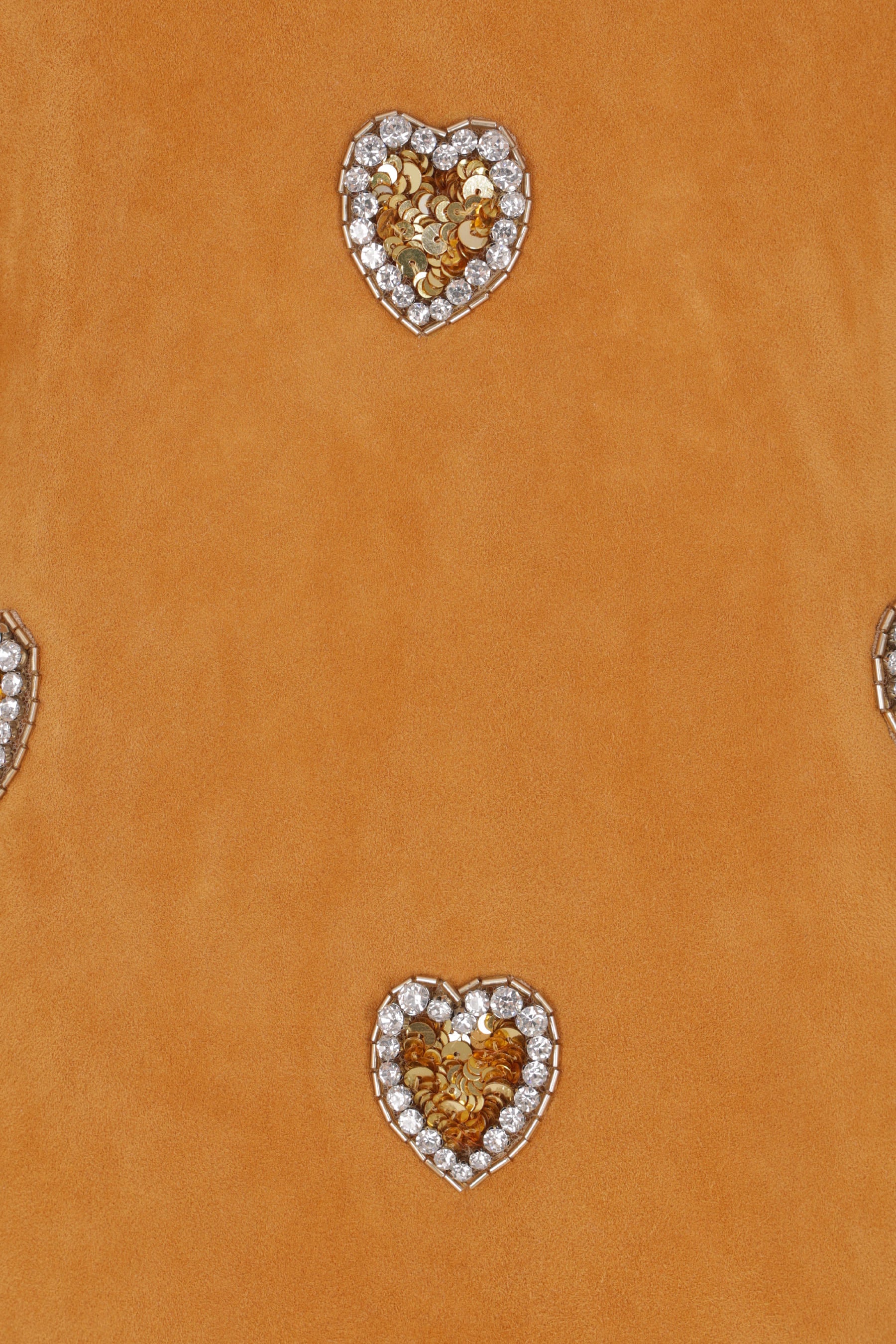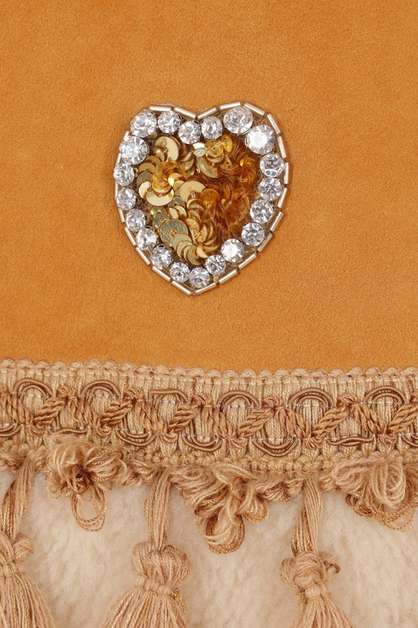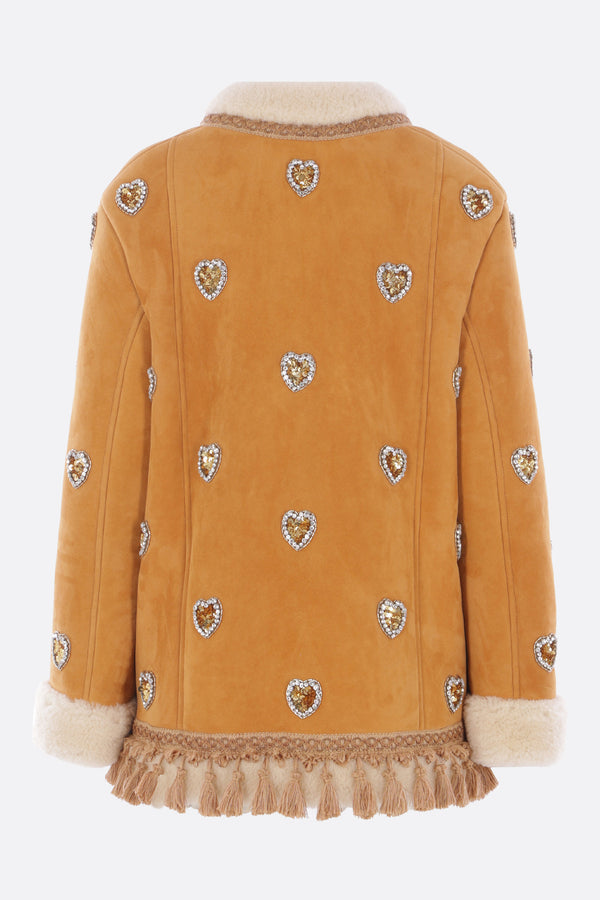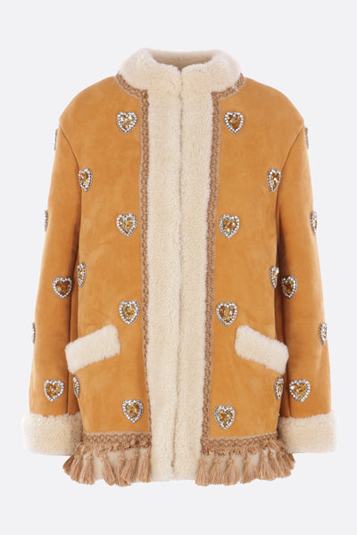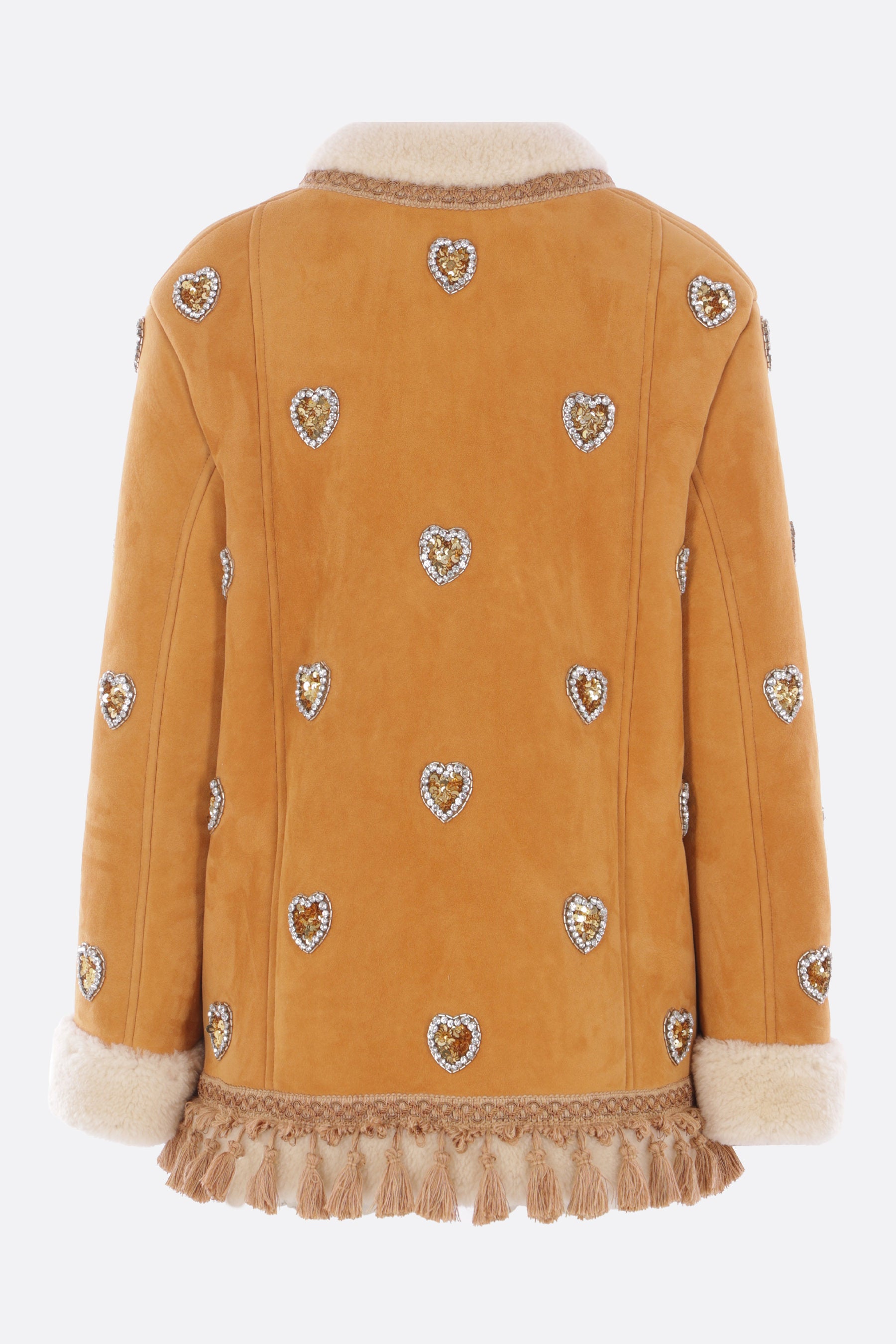 Montone di Valentino Garavani realizzato in shearling color beige con cuori ricamati. Caratterizzato da scollatura a giro, chiusura con ganci, tasche frontali, maniche lunghe, dettaglio passamaneria ai bordi e nappine al fondo.