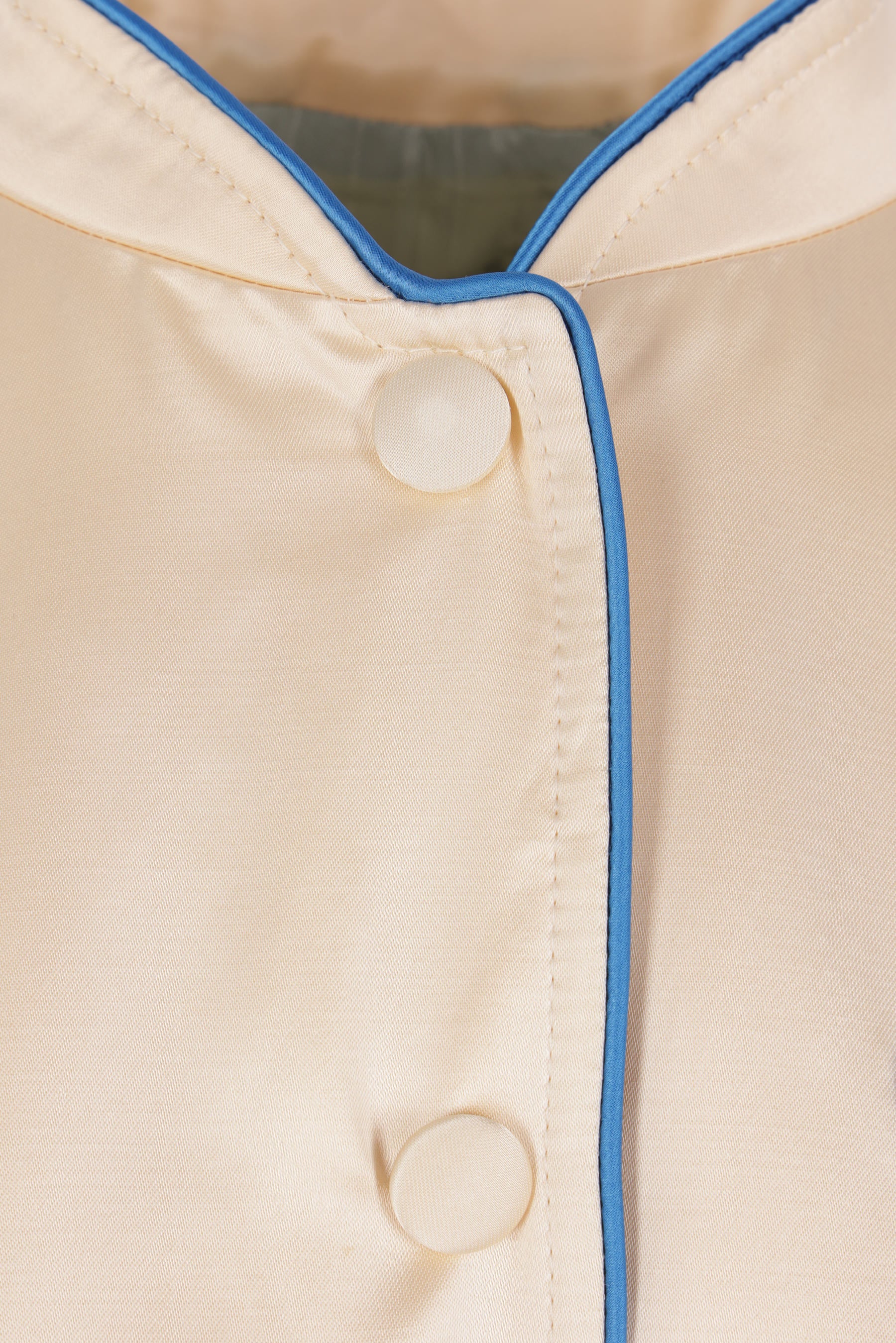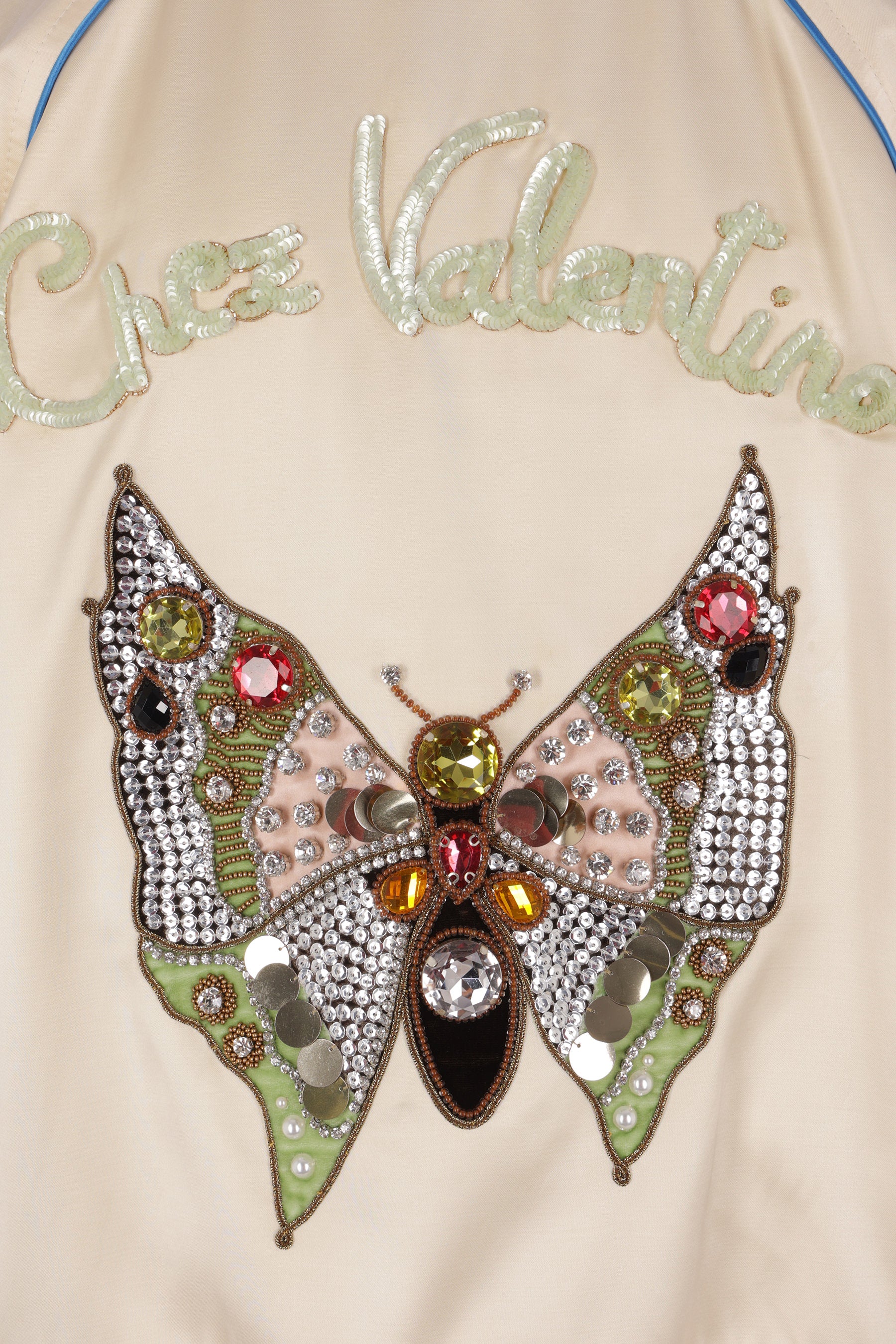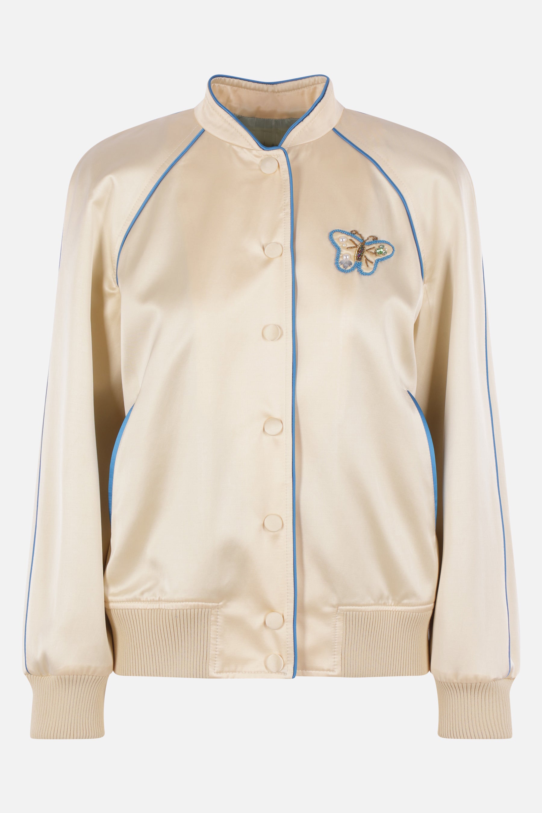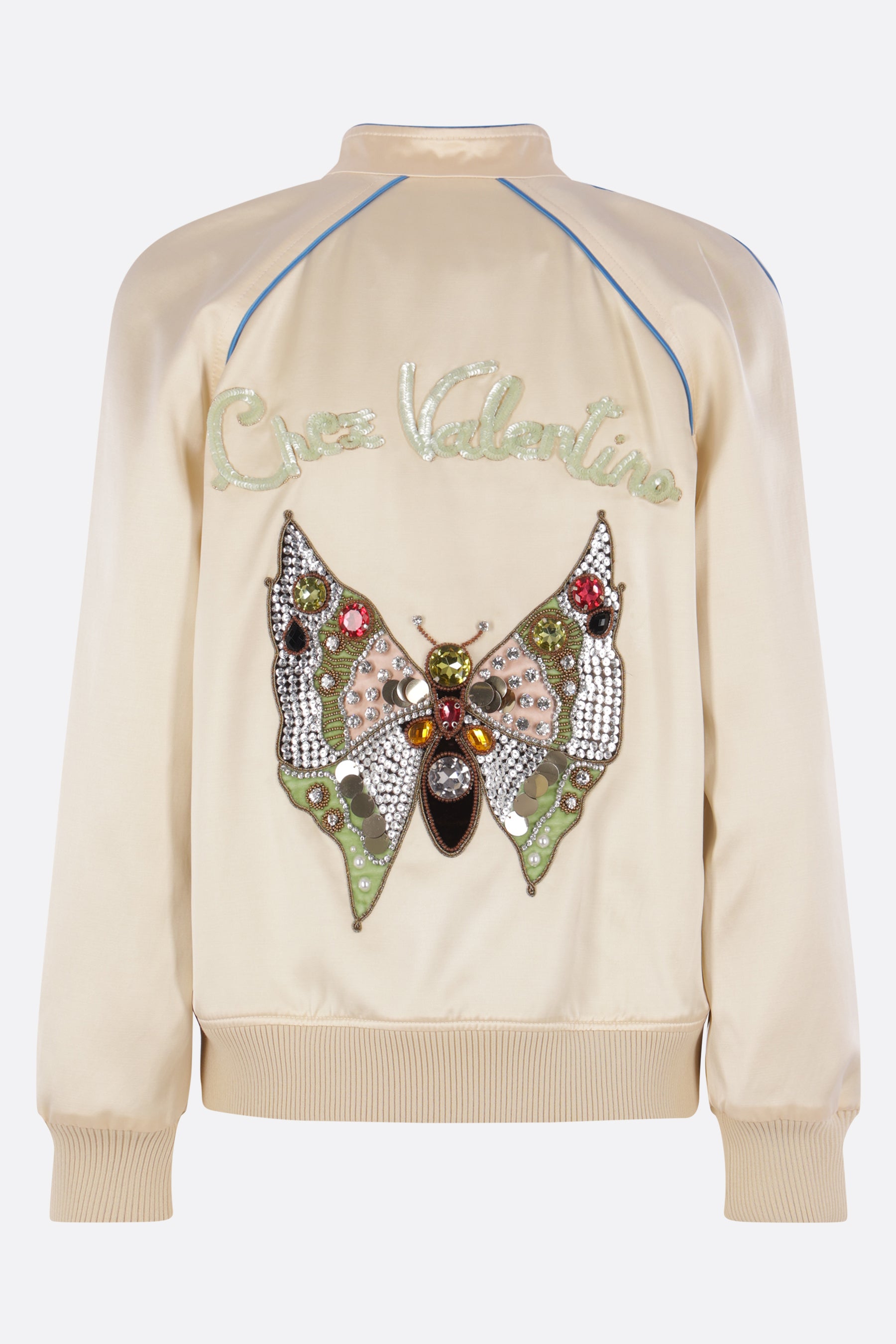 Bomber di Valentino Garavani realizzato in raso color avorio con piping azzurro a contrasto e patch farfalla ricamata sul petto. Caratterizzato da colletto alla coreana, chiusura frontale con bottoni automatici, tasche a filetto, maniche lunghe, bordi a costine e interno foderato. Completa il design il ricamo Chez Valentino e la farfalla decorata con cristalli e paillettes sul retro.