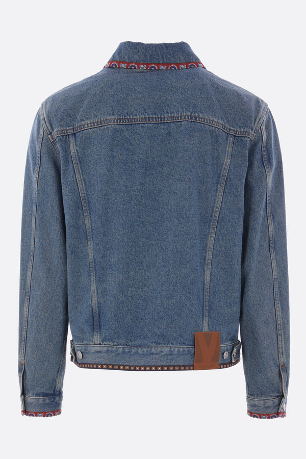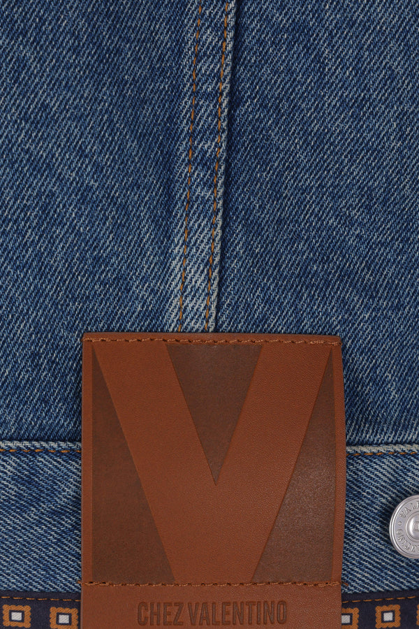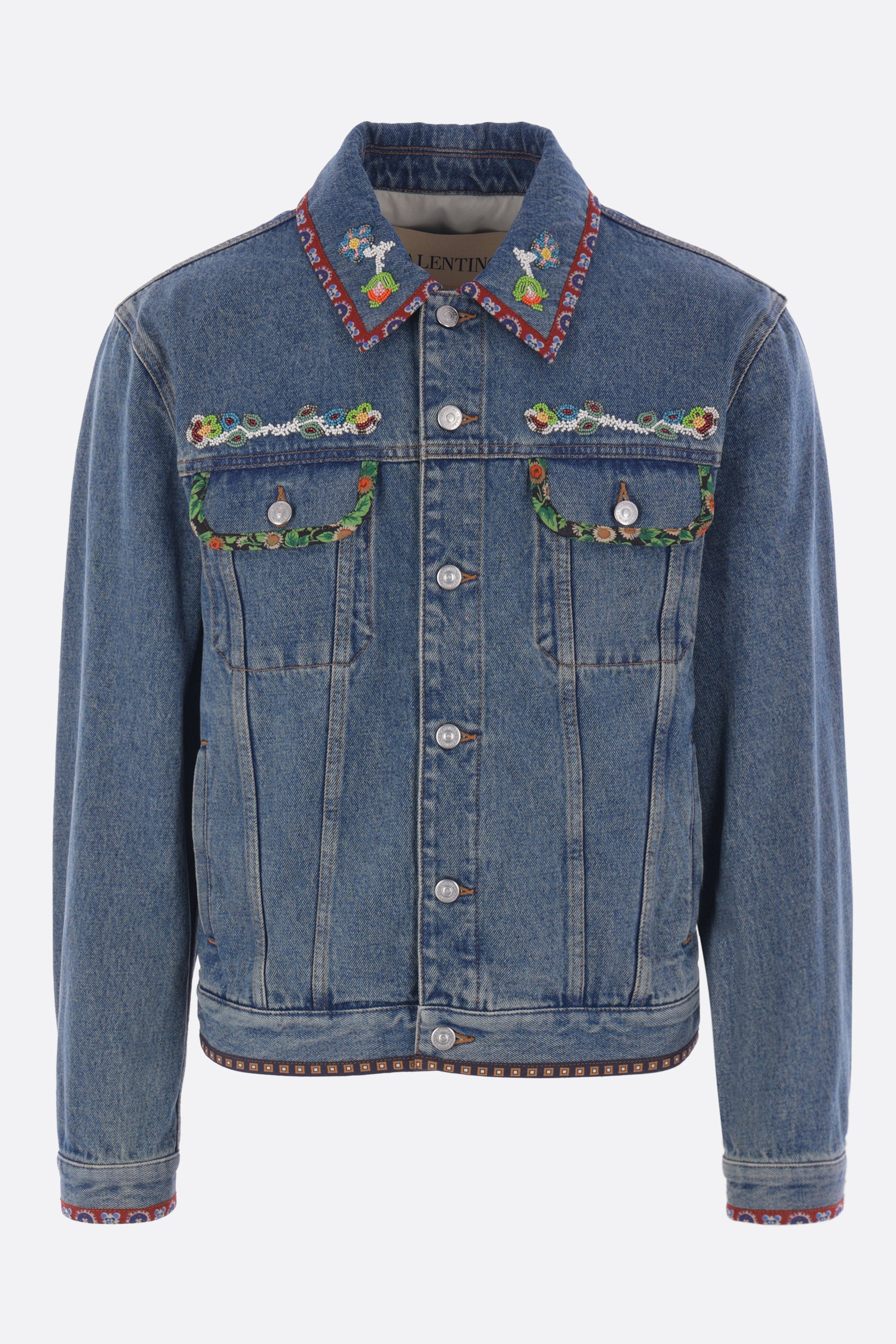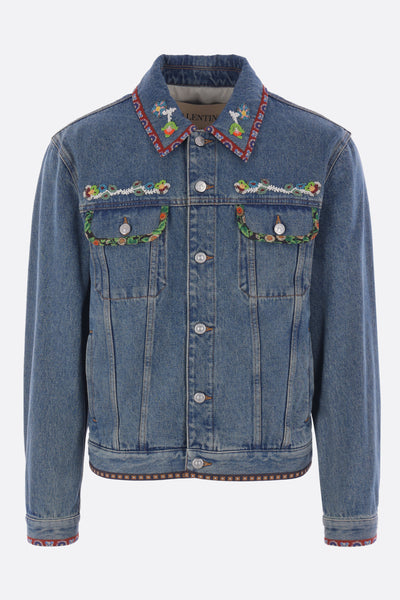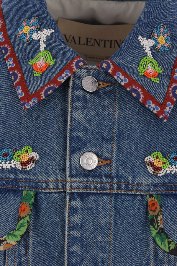 Giubbotto di Valentino Garavani realizzato in denim di cotone color blu con ricamo di perline e bordi stampati. Caratterizzata da colletto a punta, chiusura frontale con bottoni metallici, tasche multiple, maniche lunghe con polsini abbottonati e fondo dritto.