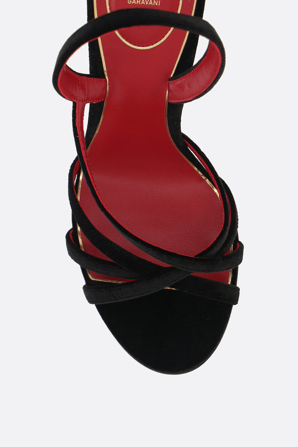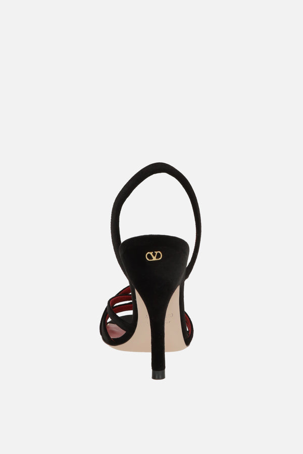 Sandalo di Valentino Garavani realizzato in velluto color nero. Caratterizzato da cinturino elasticizzato alla caviglia, punta a mandorla, fodere in pelle e suola in cuoio. Completa il design il tacco curvo rivestito con dettaglio VLogo Signature in metallo.