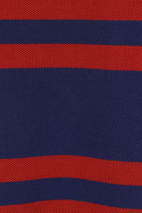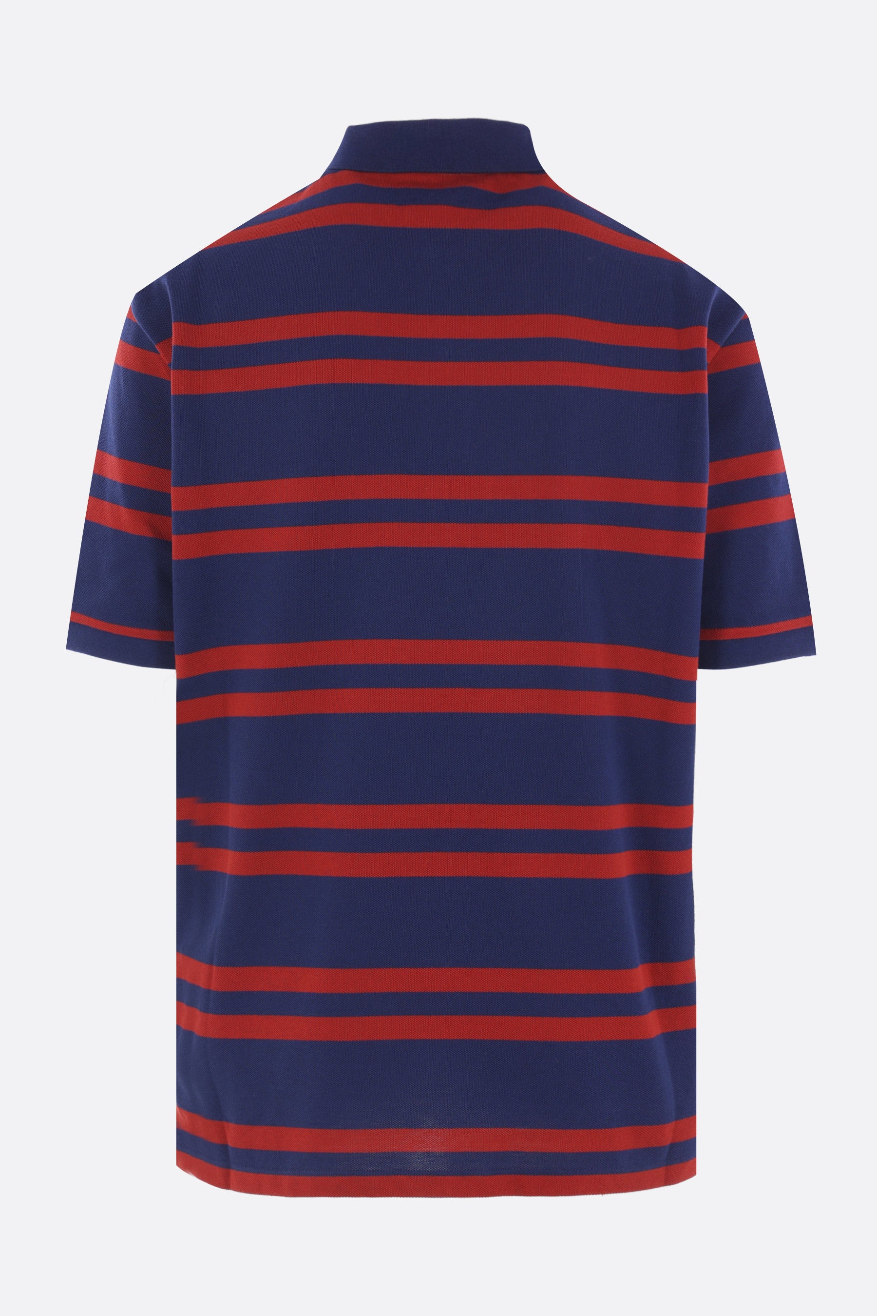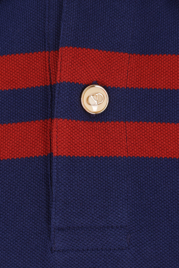 Polo di Valentino Garavani realizzata in piquet di cotone a righe color blu e rosso con ricamo Chez Valentino sul petto. Caratterizzata da colletto a polo, chiusura frontale con bottoni, maniche corte e fondo dritto con spacchi laterali.