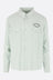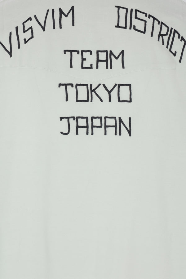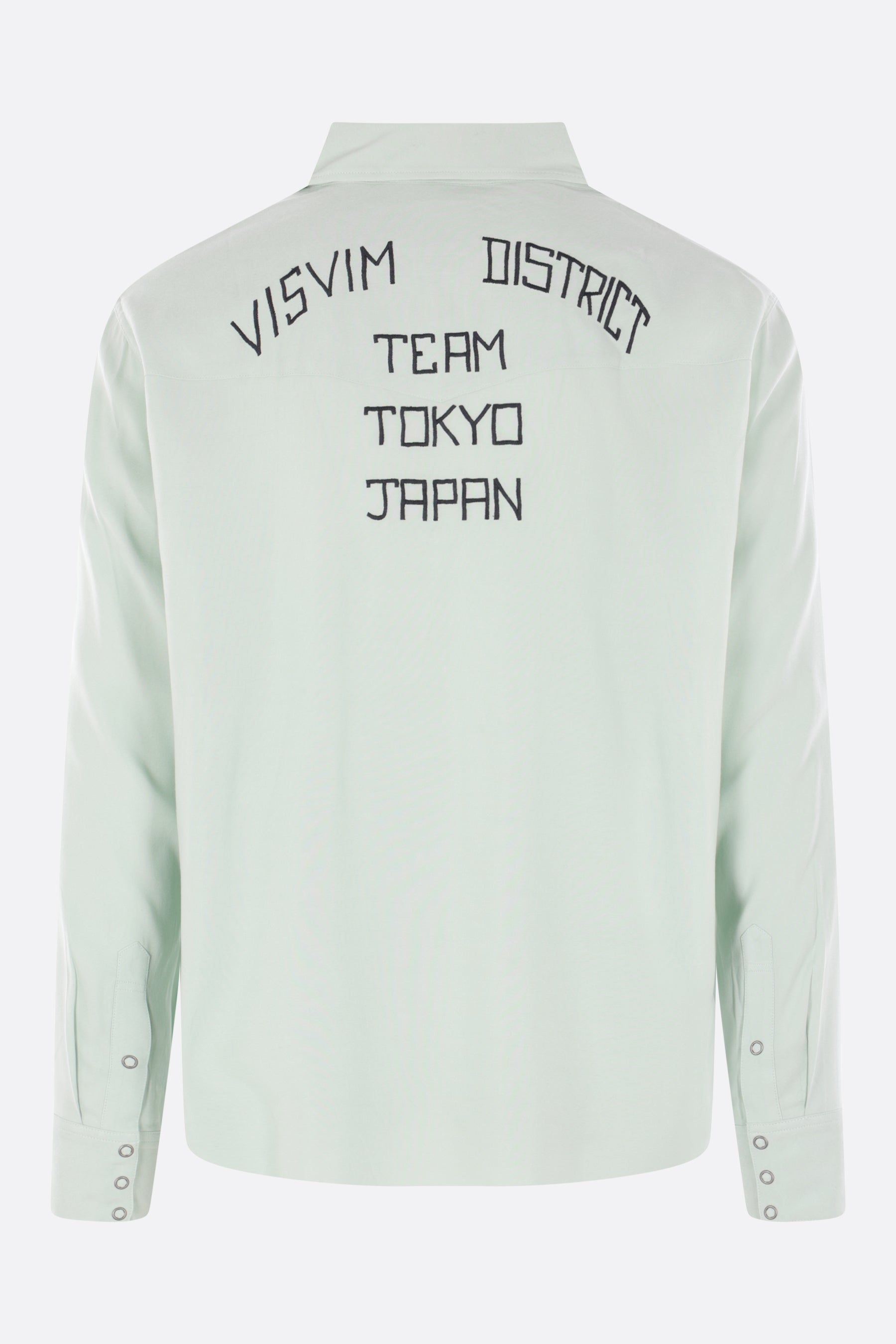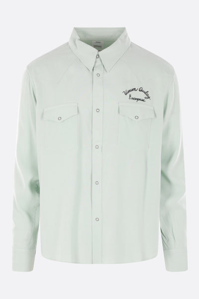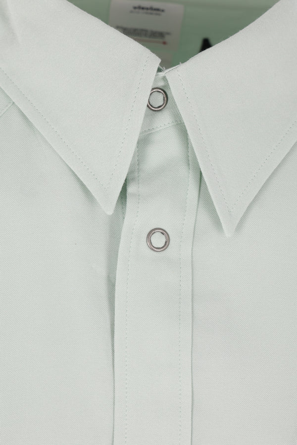 Camicia di Visvim realizzata in rayon color verde chiaro con ricamo "Visvim Quality Enterprise" sul petto e ricamo "Visvim District" sul retro. Caratterizzata da colletto a punta, chiusura frontale con bottoni automatici, tasche con patta, maniche lunghe con polsini abbottonati e fondo arrotondato.