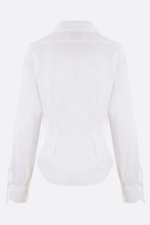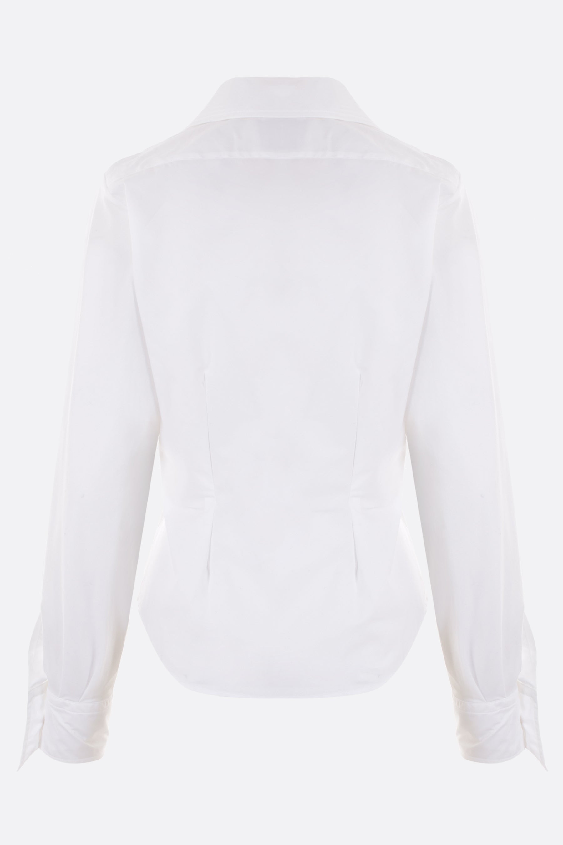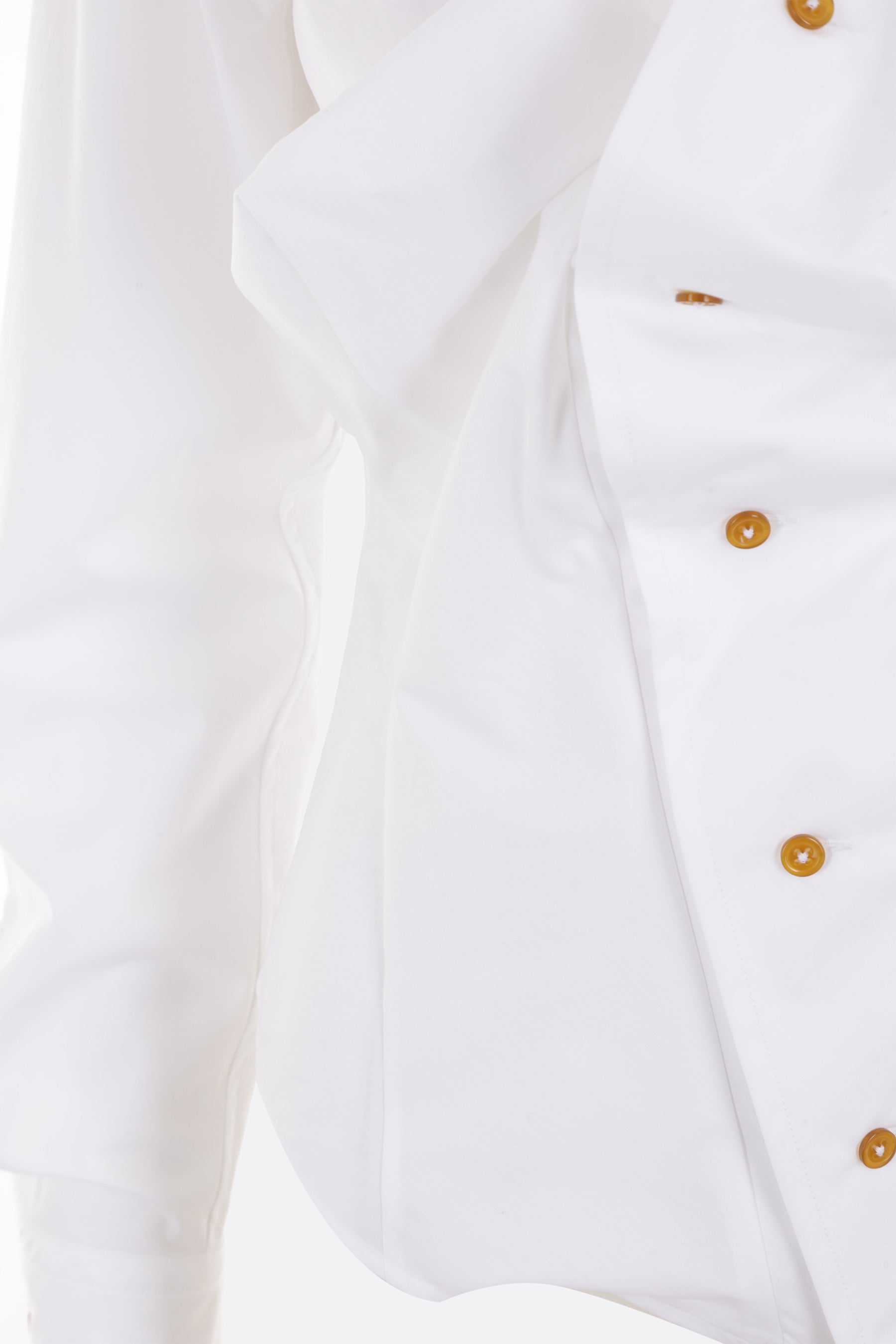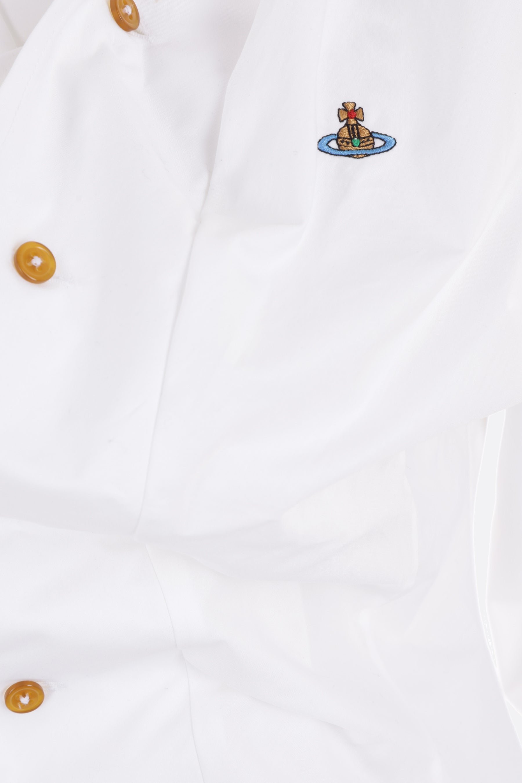 Camicia di Vivienne Westwood realizzata in popeline di cotone color bianco con ricamo logo Orb al petto. Caratterizzata da colletto asimmetrico, chiusura arricciata con bottoni, maniche lunghe con polsini abbottonati e fondo arrotondato.