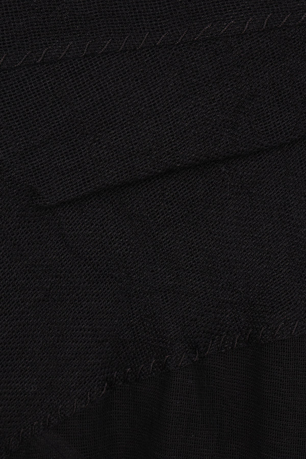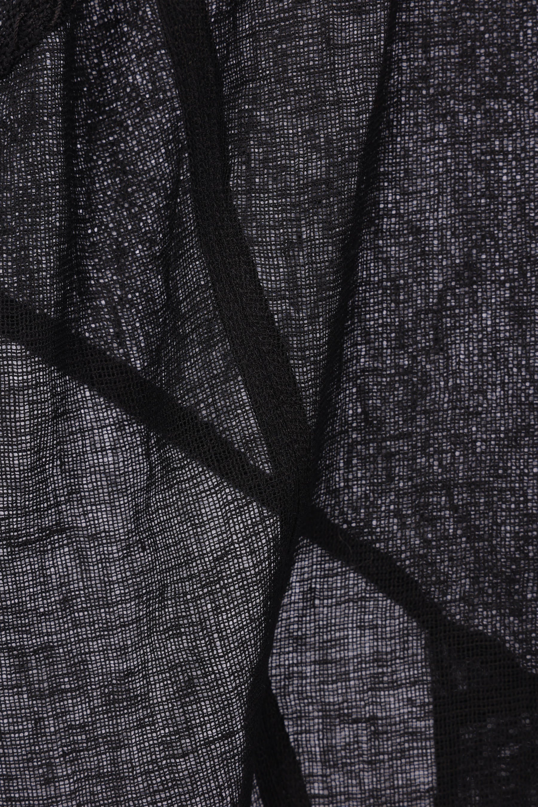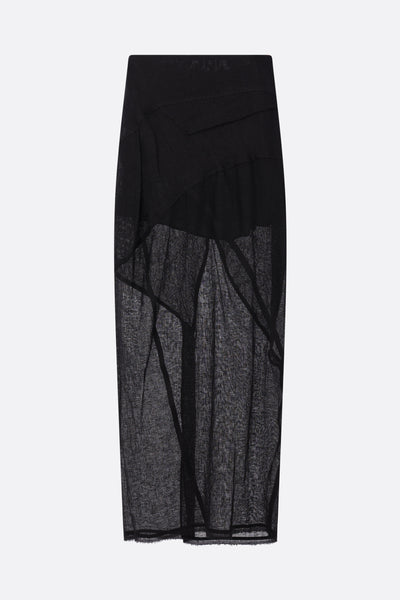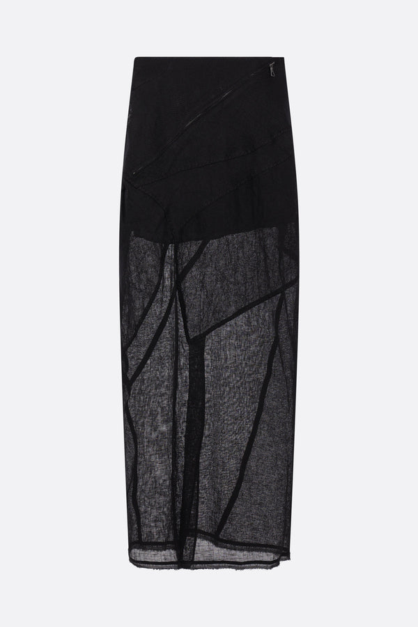 Gonna lunga di Yehuafan realizzata in lino color nero con dettagli in tela tono su tono. Caratterizzata da chiusura posteriore con zip obliqua, pieghe asimmetriche in vita, spacco centrale sul retro e fondo tagliato a vivo. Interno parzialmente foderato.