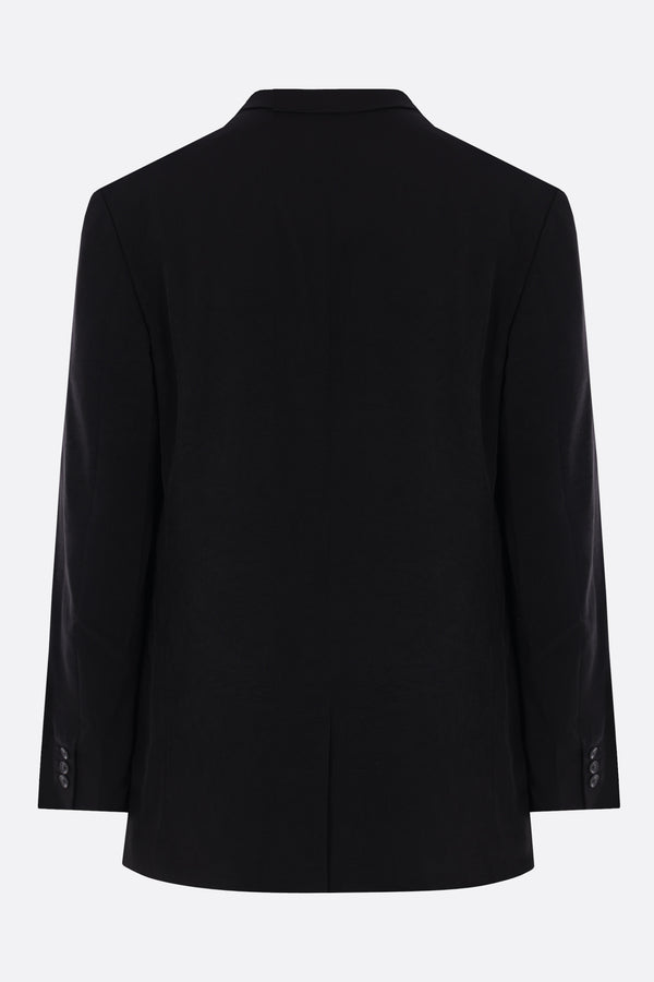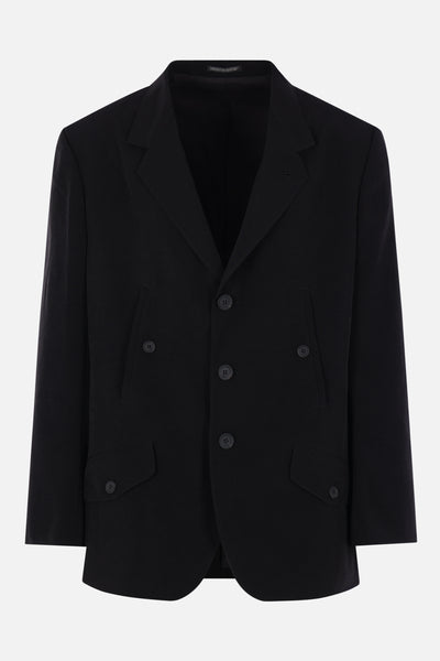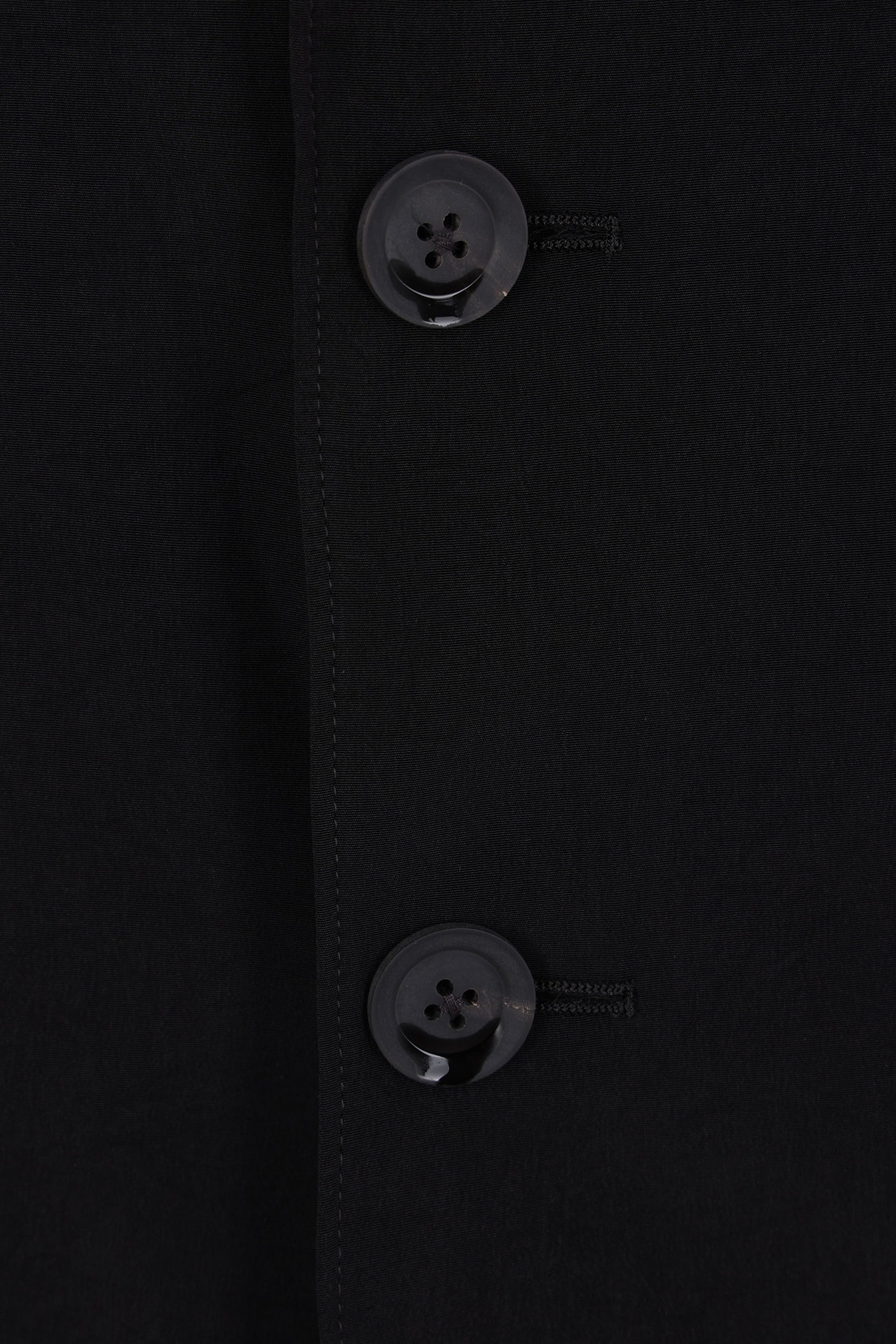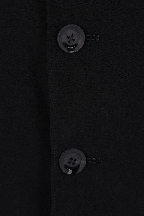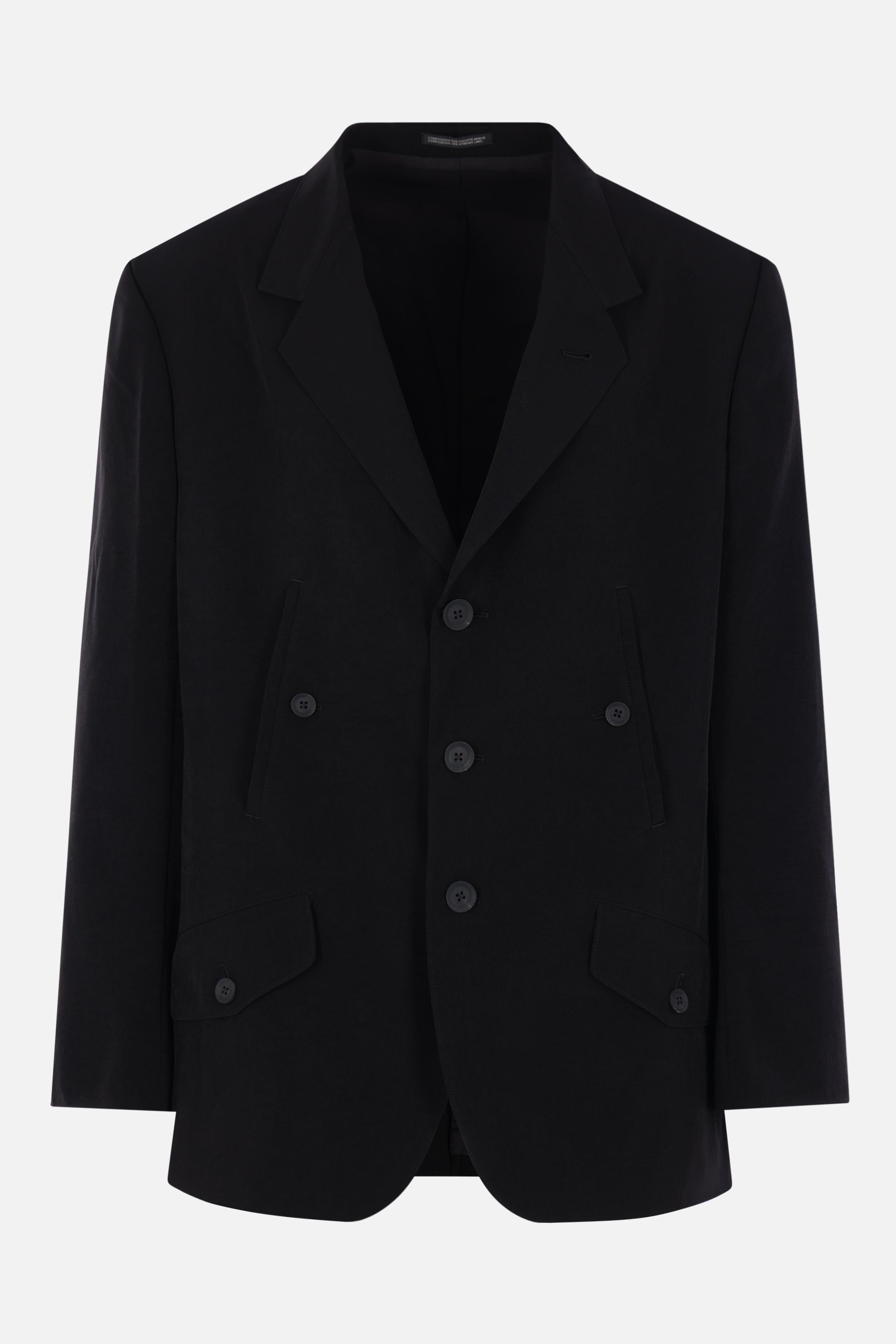 Giacca monopetto di Yohji Yamamoto realizzata in raso color nero. Caratterizzata da rever classico, chiusura frontale con bottoni, tasche multiple, maniche lunghe con polsini abbottonati e spacco centrale sul retro. Interno foderato.