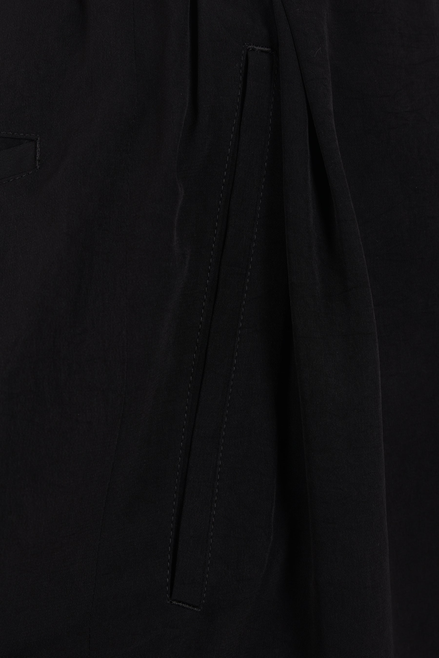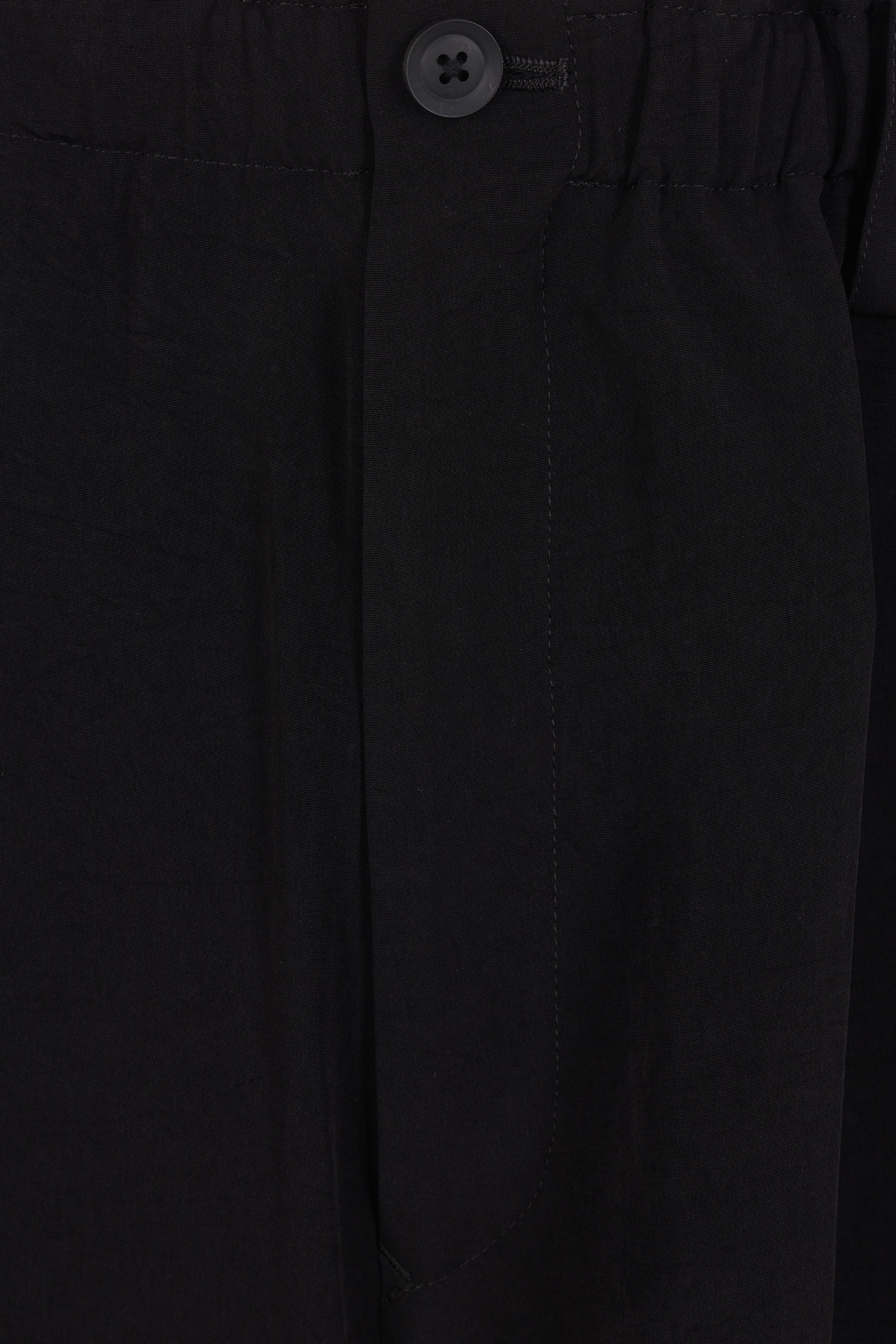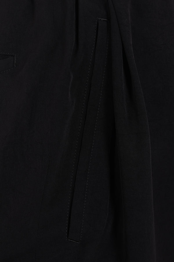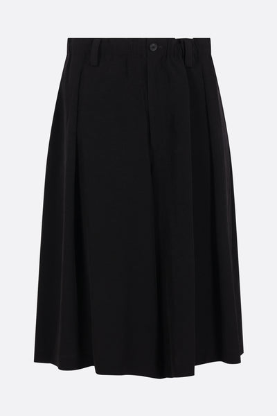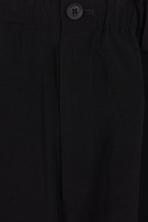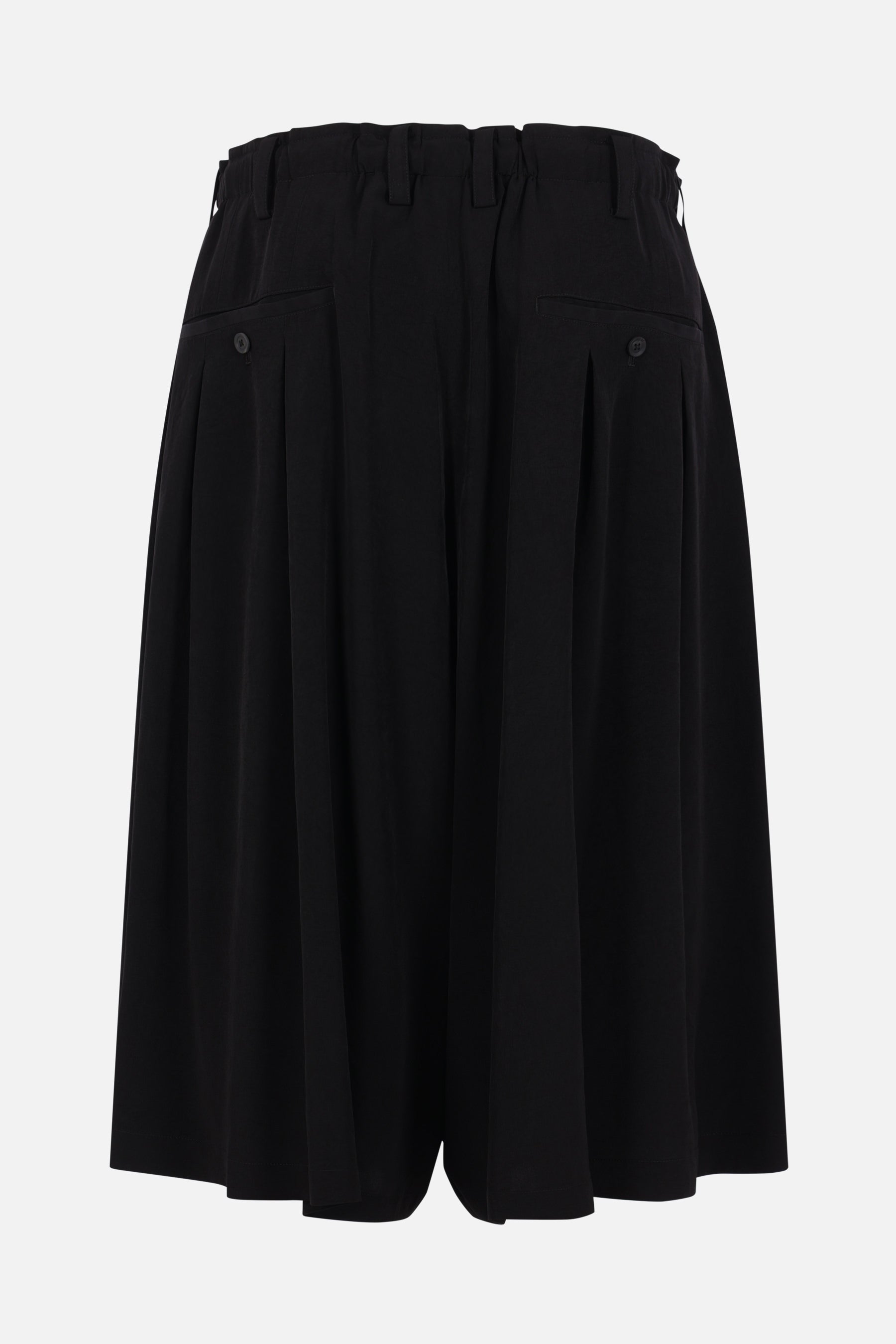 Pantalone corto dalla linea oversize di Yohji Yamamoto realizzato in crepe de chine color nero. Caratterizzato da fascia elasticizzata in vita con coulisse, chiusura frontale con bottone / zip, passanti per cintura, tasche multiple, pinces frontali e interno foderato.