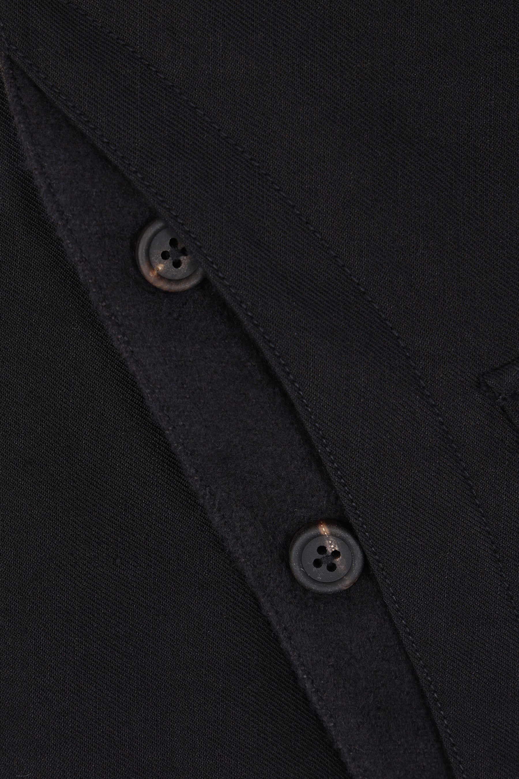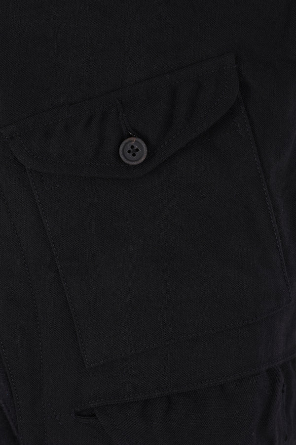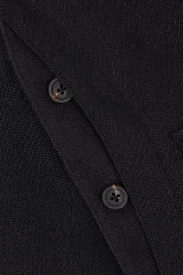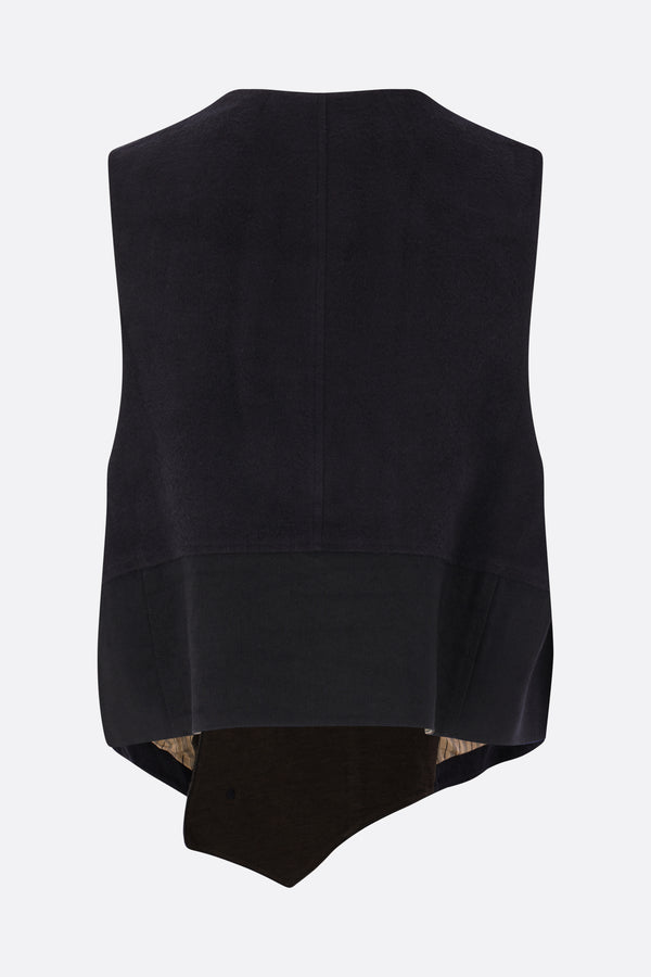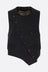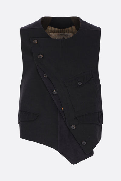 Gilet asimmetrico di Ziggy Chen realizzato in misto lana e lino color nero. Caratterizzato da scollatura a giro, chiusura asimmetrica con bottoni, tasche multiple e fondo asimmetrico più lungo sul davanti. Interno foderato in misto cotone a righe.
