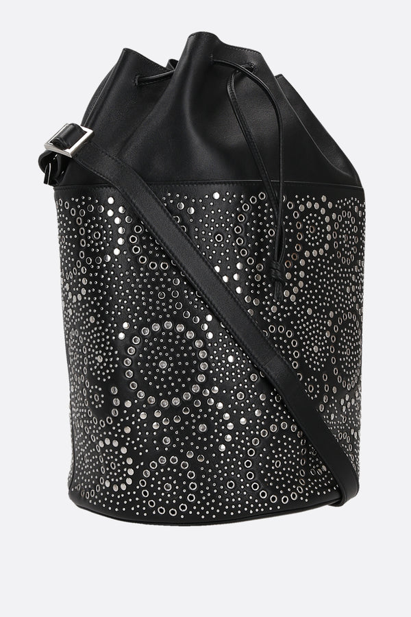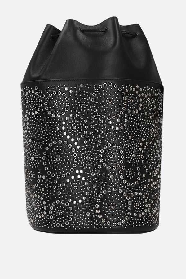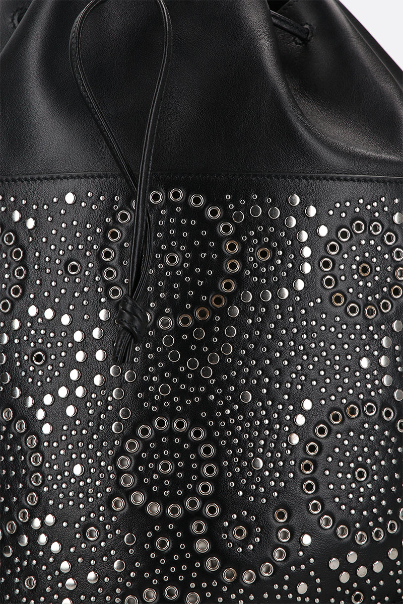 10 Corso Como's refined bucket bag crafted in black smooth leather entirely embellished by metal eyelets and studs. It features silver-tone hardware, top drawstring fastening and adjustable shoulder strap. Black leather-lined interior with removable zipped pouch.