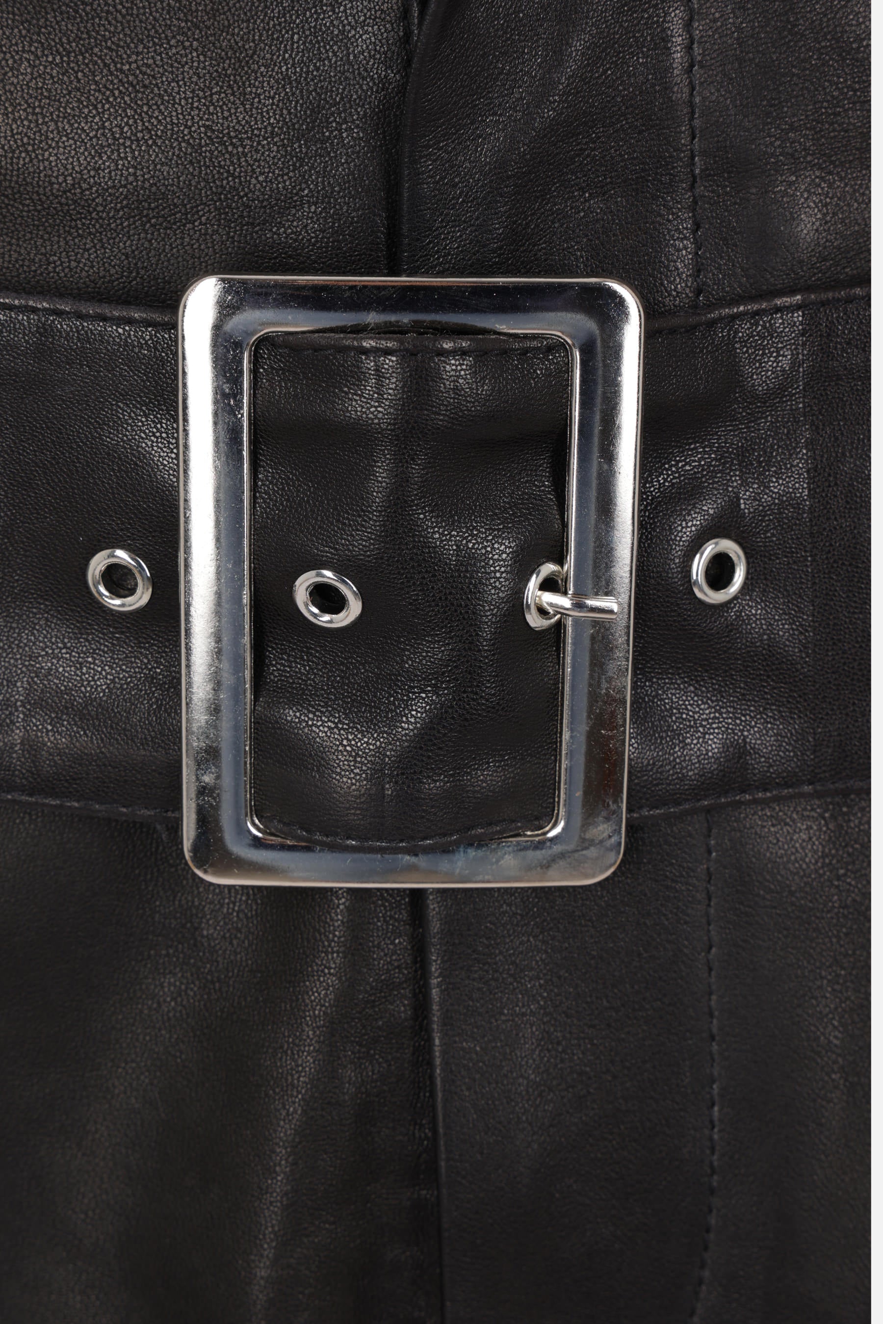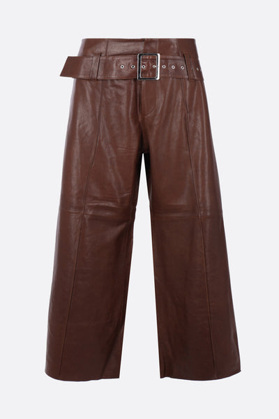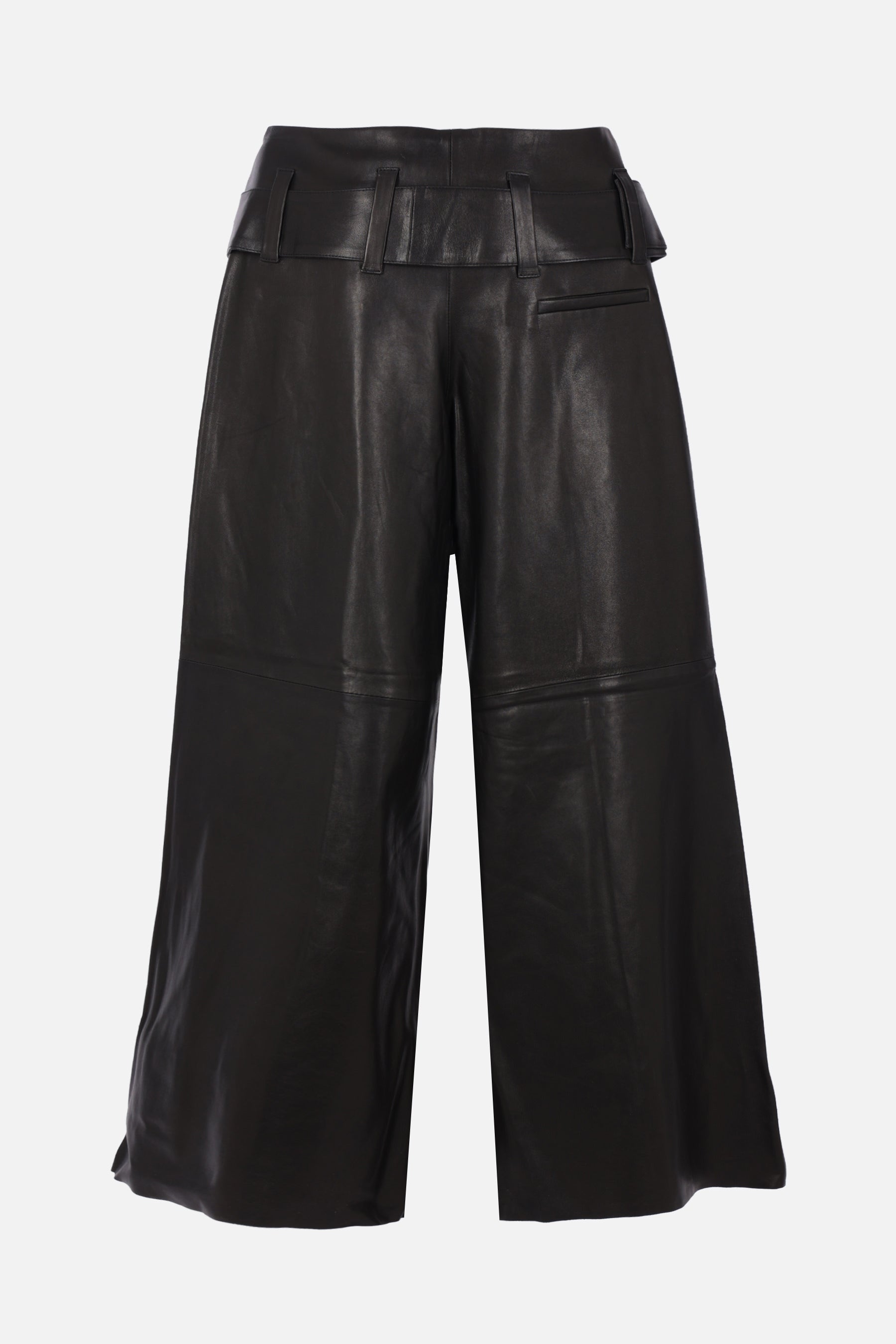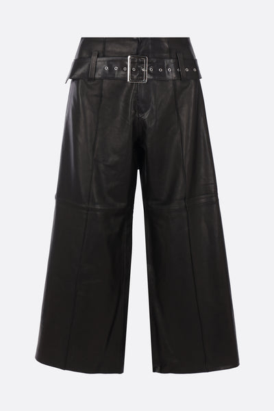 10 Corso Como wide-leg trousers made of black leather. Featuring a front button and zip closure, matching belt, multiple pockets, central seam, lined interior, and laser-cut hem.