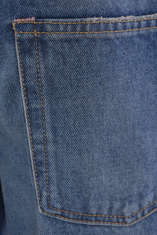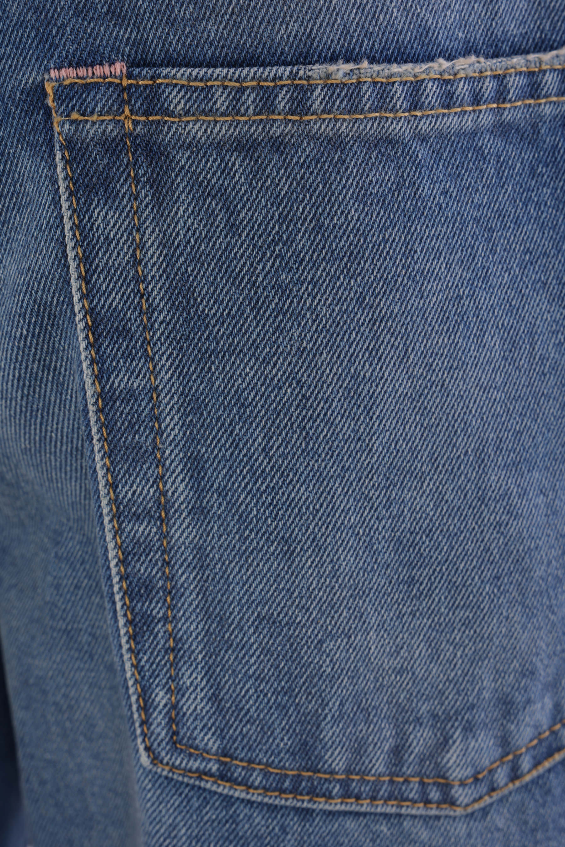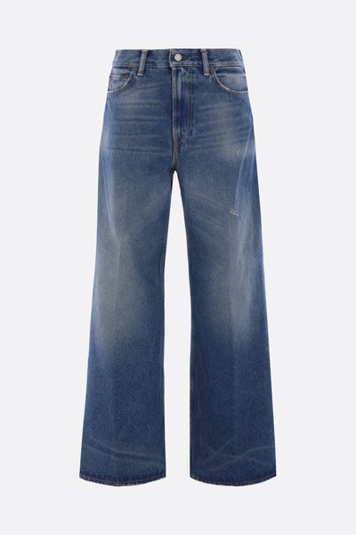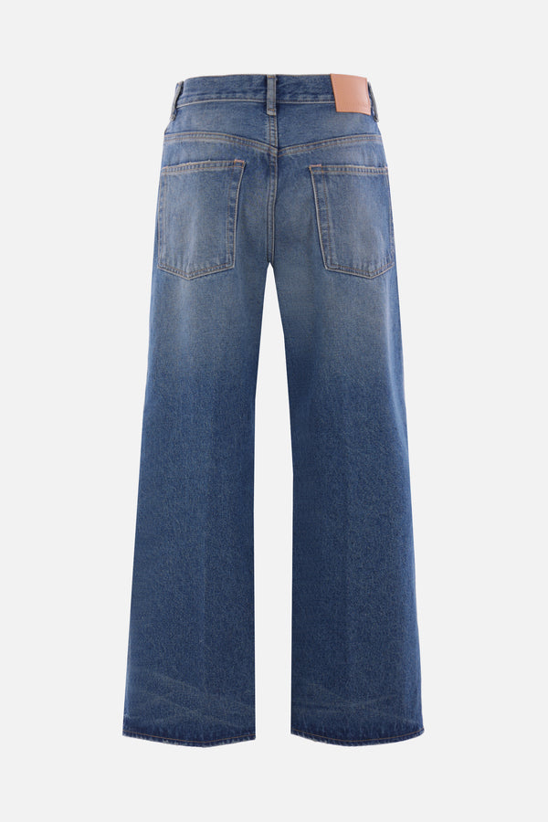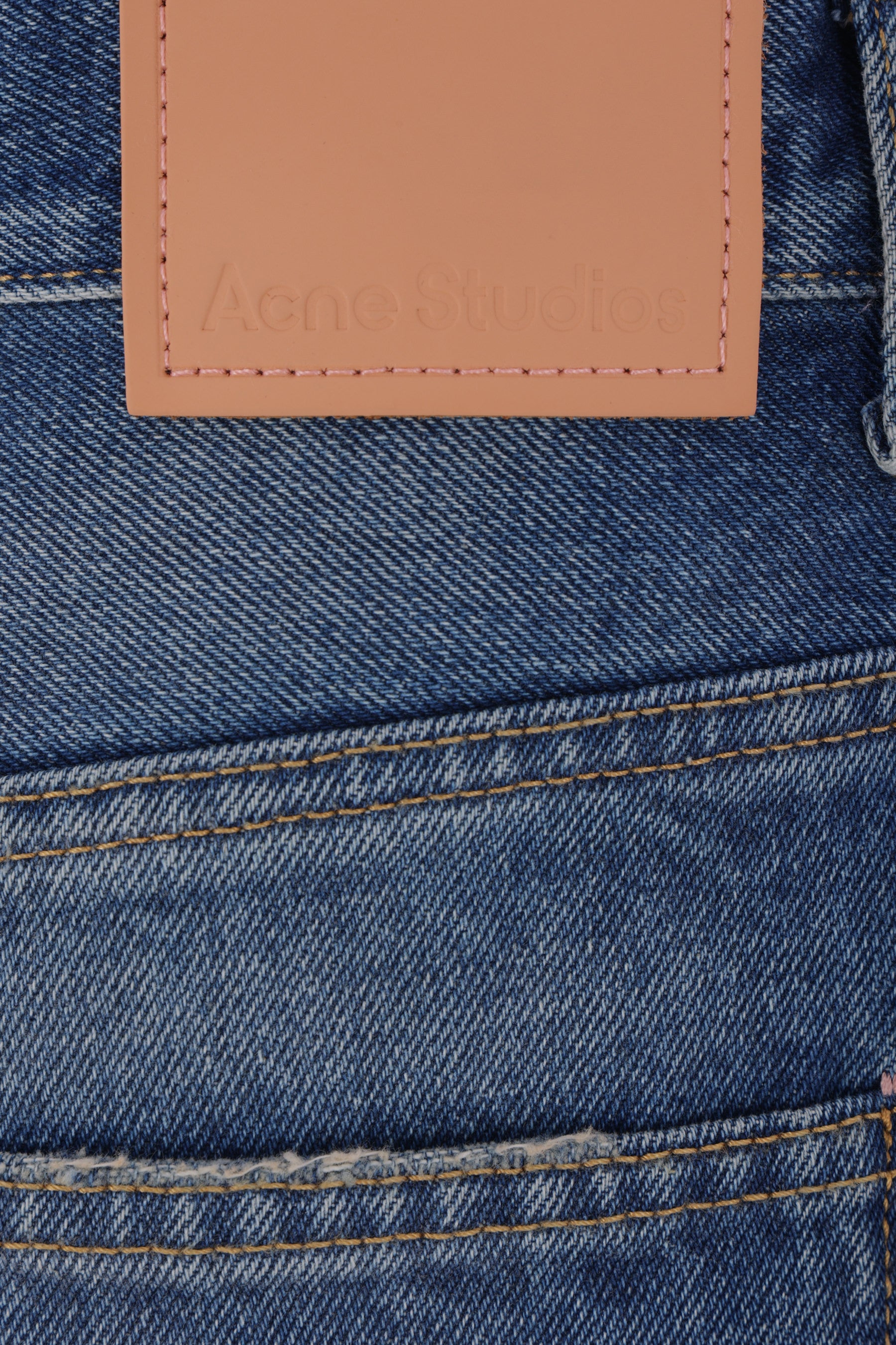 Acne Studios straight-leg jeans crafted from medium blue cotton denim with a subtle worn effect. Features a front metal button and zip closure, belt loops, and five classic pockets. The design is completed with a leather logo patch on the back.