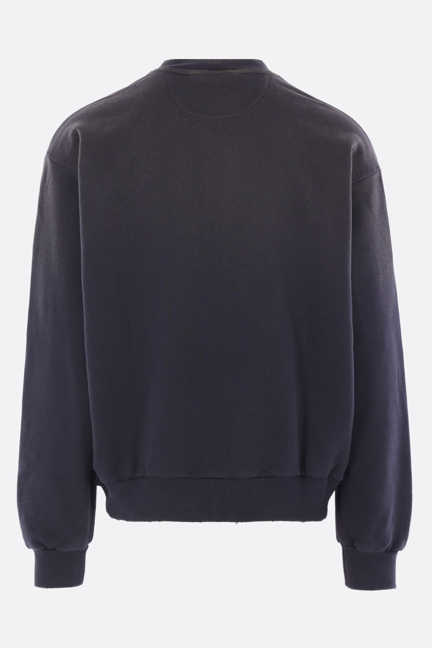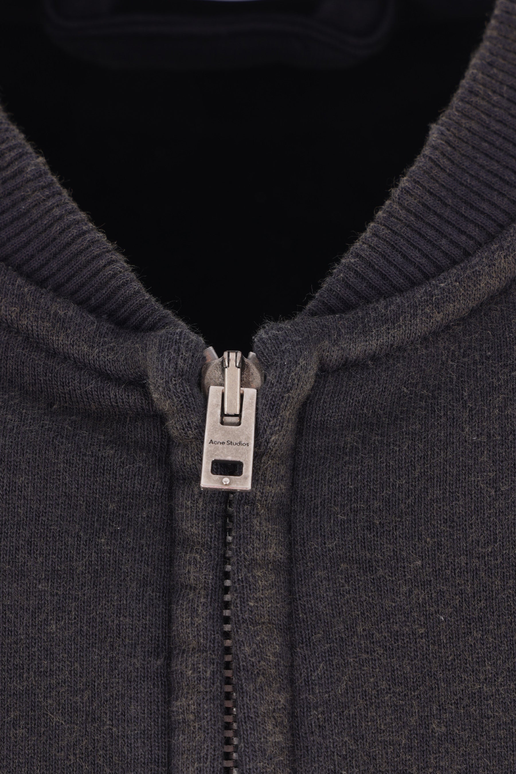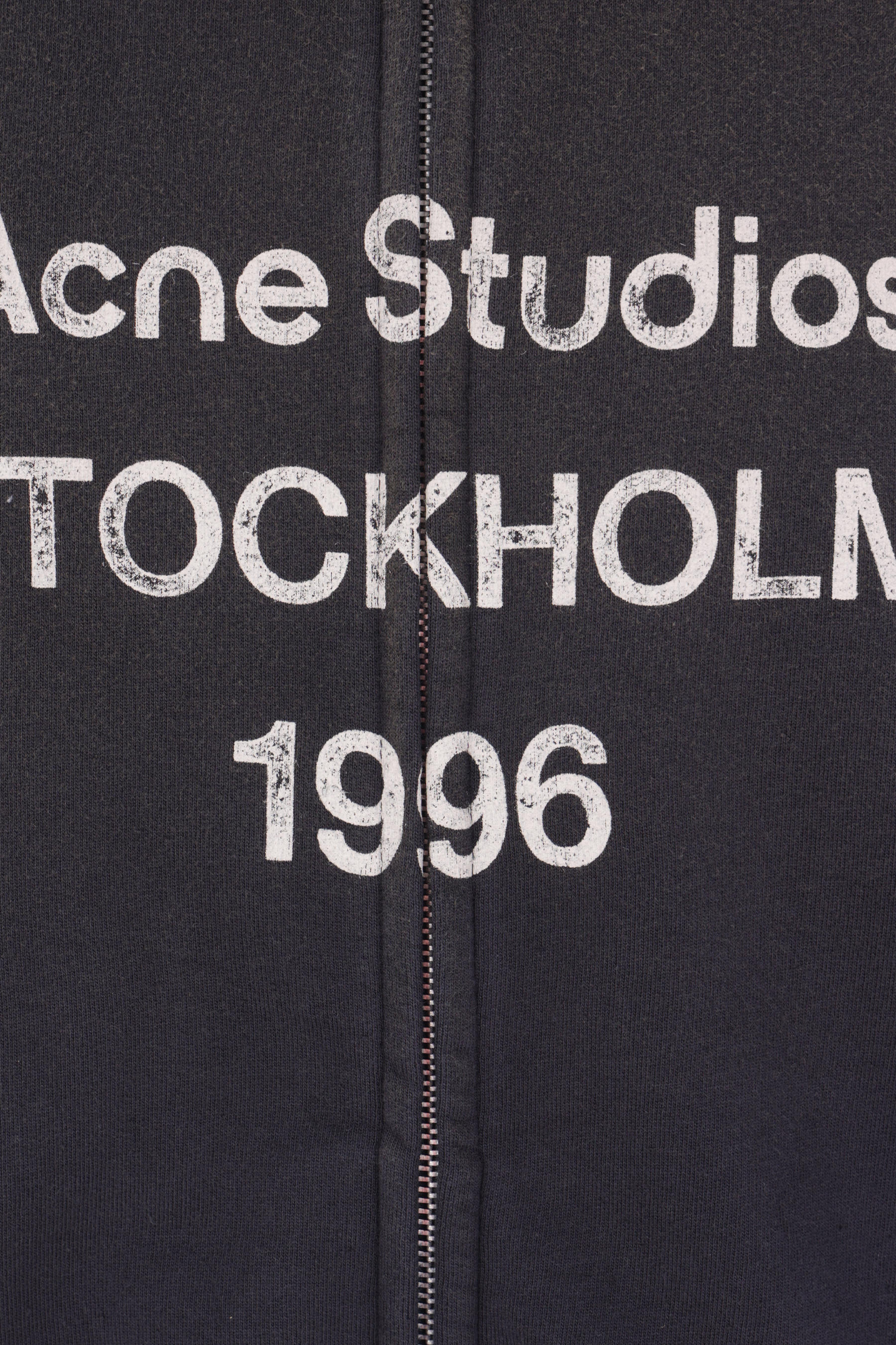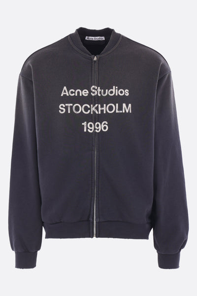 Acne Studios sweatshirt crafted from faded black cotton-blend jersey with a distressed effect and Acne Studios 1996 print on the chest. Features a bomber collar, front zip closure, hidden side pockets, long sleeves, and ribbed edges.