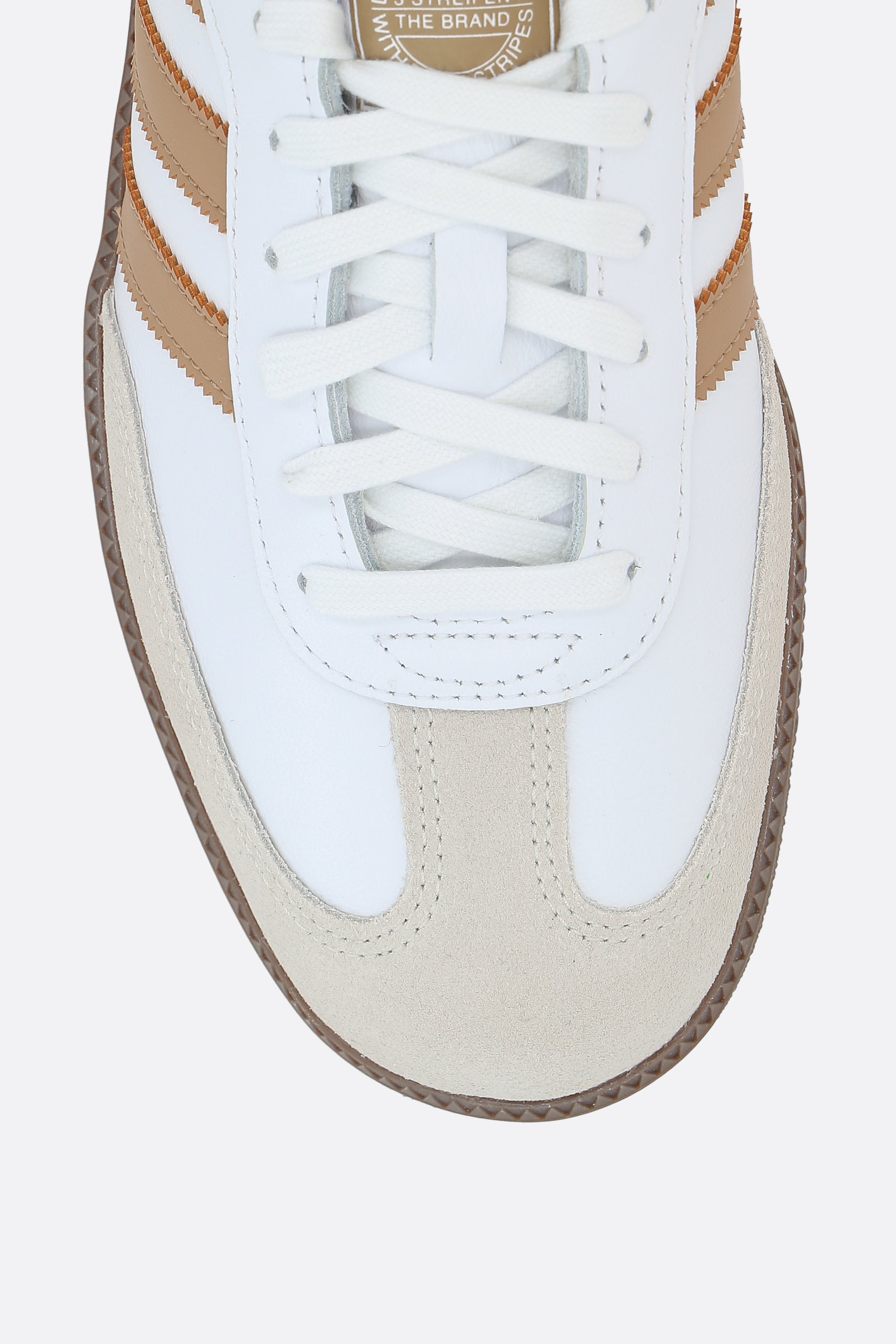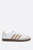 adidas low-top sneaker made of smooth white leather with a natural-colored suede insert at the tip. Featuring a lace-up closure, round toe, fabric lining, and rubber sole. The design is completed with the iconic 3-Stripes detail along the sides, a contrasting beige heel tab, and the unmistakable logo printed on the tongue.