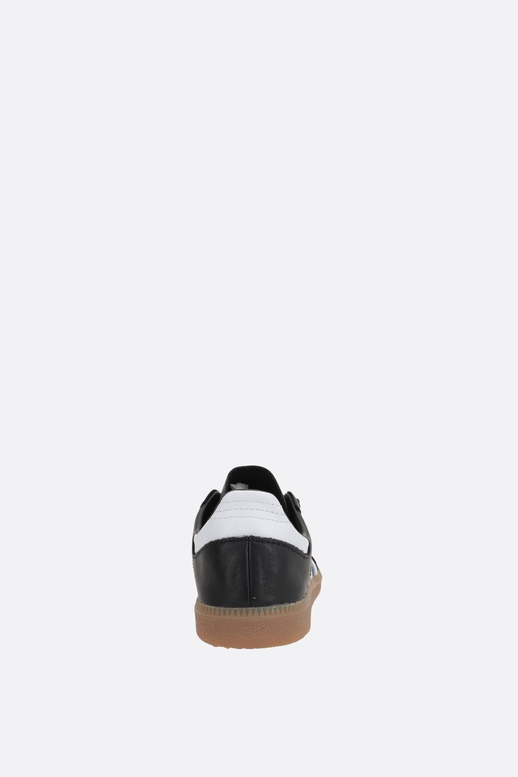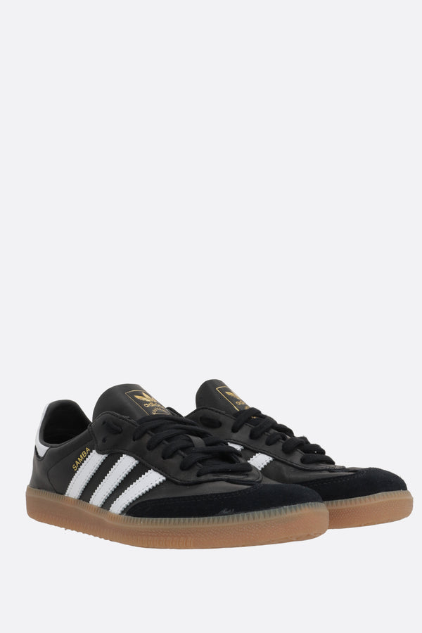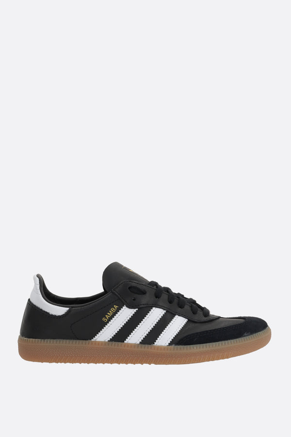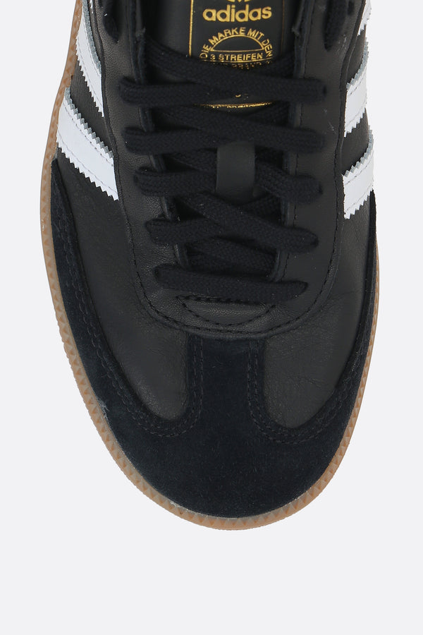 adidas low-top sneakers crafted from smooth black leather with a contrasting grey suede insert on the toe. Featuring lace-up closure, round toe, leather lining, and rubber sole. The design is completed with the iconic 3-Stripes along the sides, a contrasting white heel tab, and the signature logo printed on the tongue.