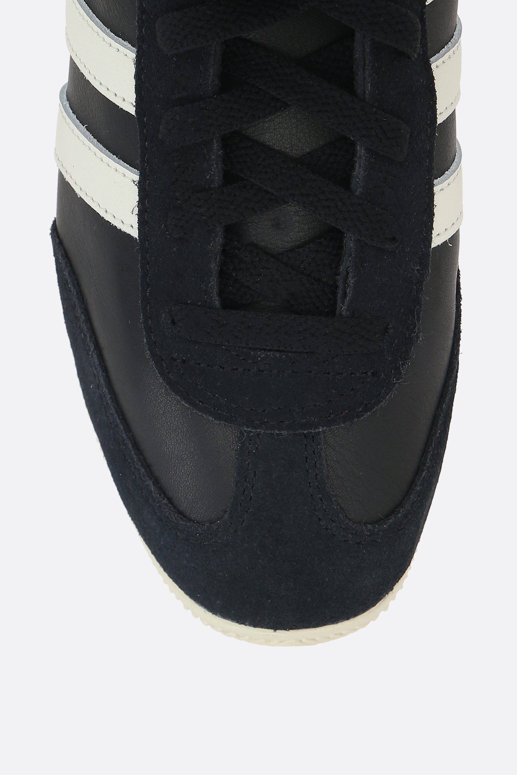 adidas high-top sneakers made of smooth black leather with tone-on-tone suede details. Featuring lace-up fastening, round toe, fabric lining, and rubber sole. The design is completed with the iconic 3-Stripes detailing along the sides and the signature logo label on the tongue.