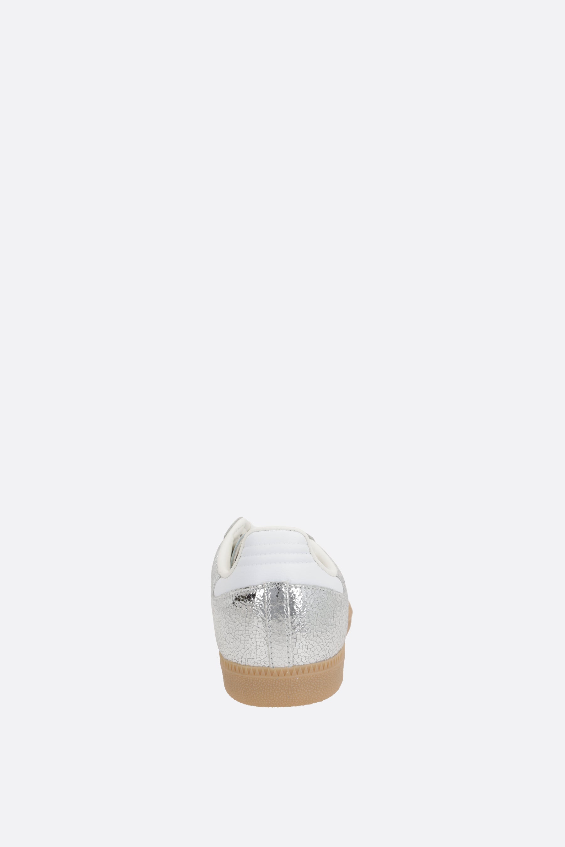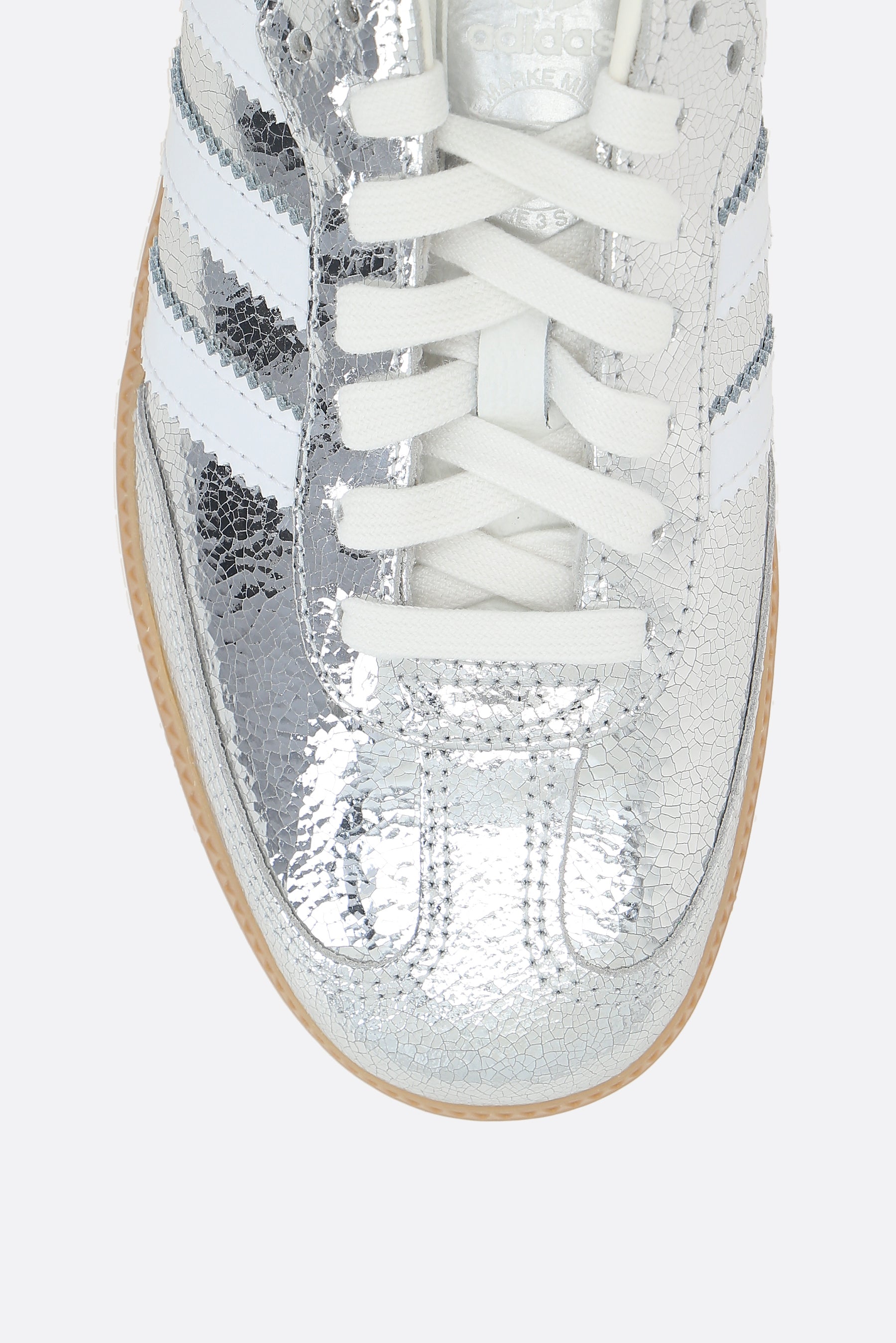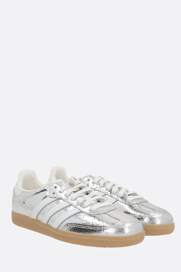 adidas low-top sneakers made from silver crinkled-effect laminated leather. Featuring lace-up closure, round toe, fabric lining, and rubber sole. The design is completed by the iconic 3-Stripes detail along the sides, a contrasting white heel tab, and the unmistakable logo printed on the tongue.