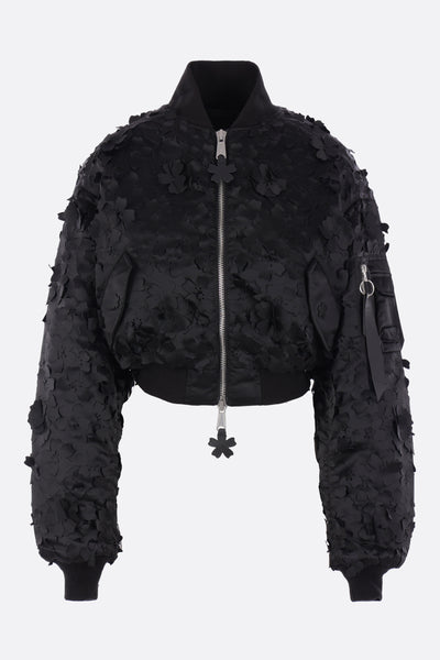Alpha Industries x Cecilie Bahnsen cropped padded bomber jacket crafted from black nylon with laser-cut floral motif. Featuring a bomber collar, front double-slider zip closure, multiple pockets, long sleeves, ribbed knit trims, and a pink quilted silk lining.