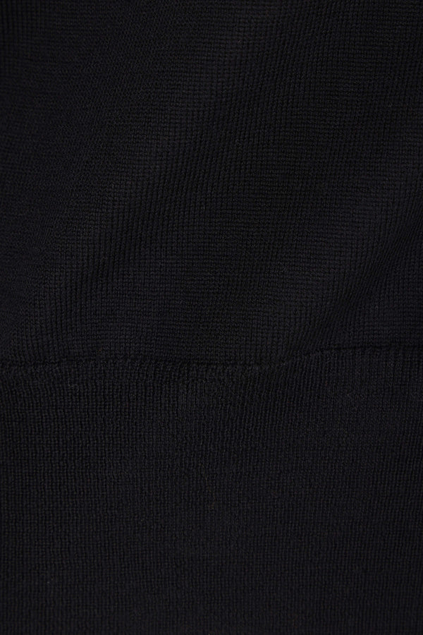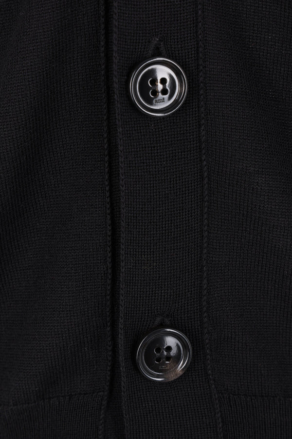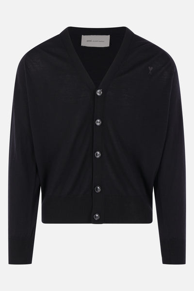 Ami Paris cardigan crafted from black merino wool knit with an Ami de Coeur embroidery on the chest. It features a V-neckline, front button closure, long sleeves, and ribbed edges.