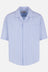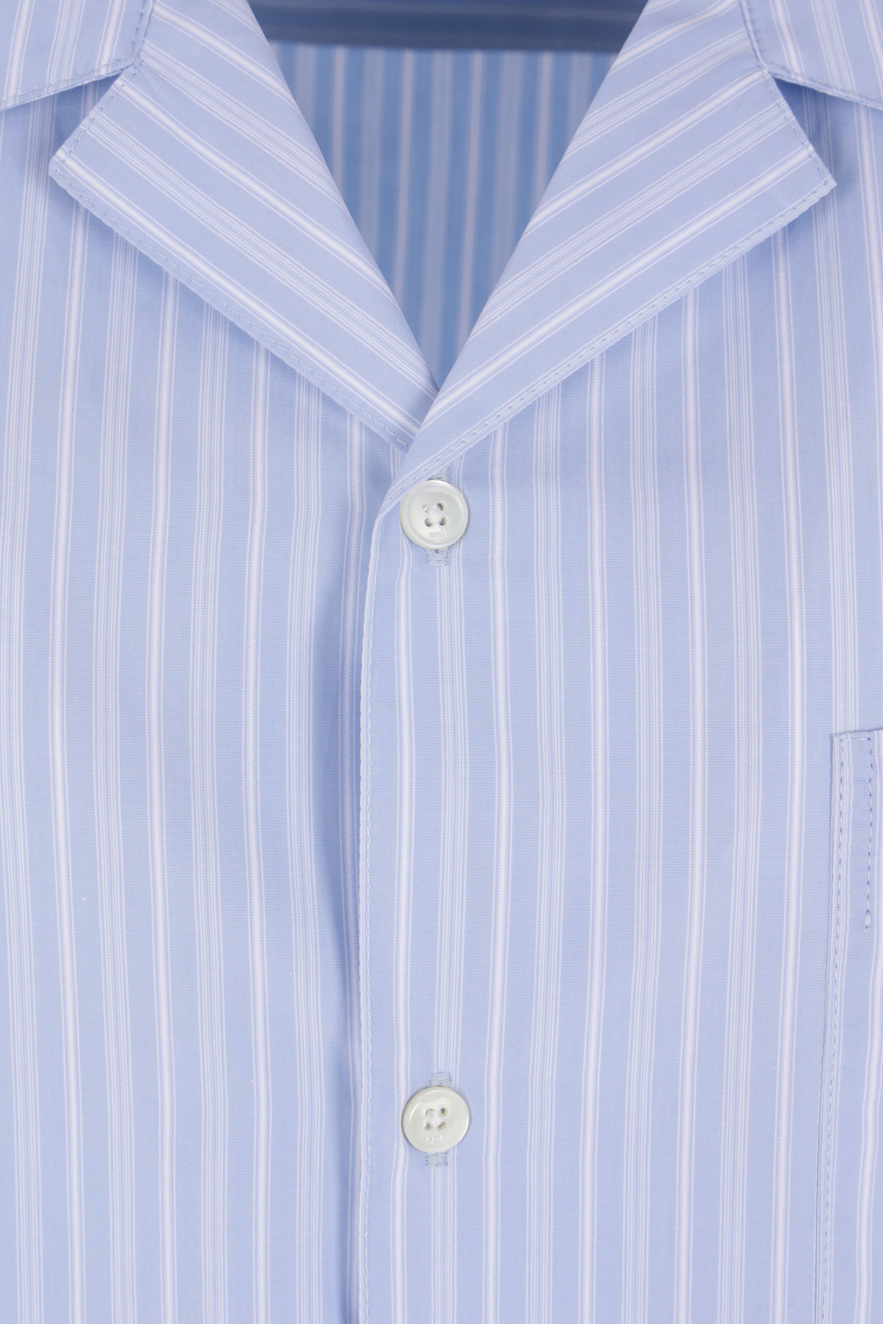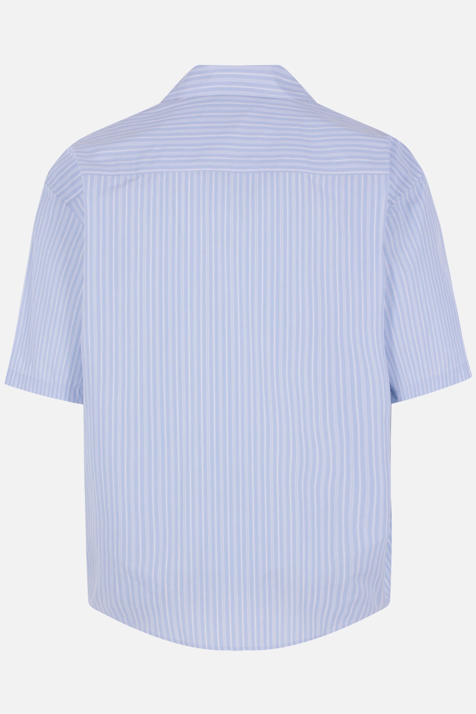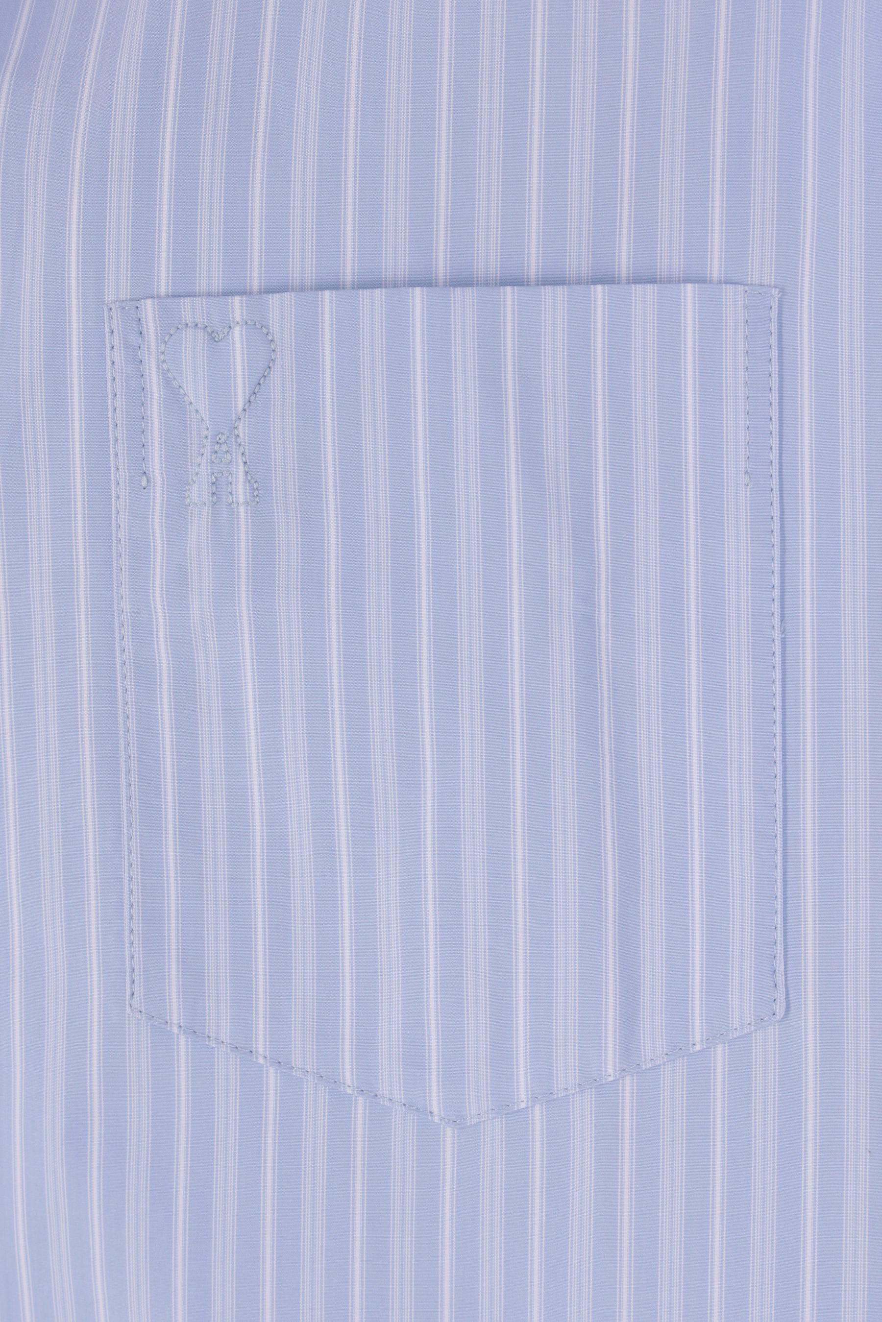 Ami Paris bowling shirt crafted from blue and white striped cotton poplin. Featuring a notched collar, front button closure, short sleeves, and a rounded hem. The design is completed by the Ami de Coeur embroidery on the chest pocket.