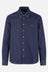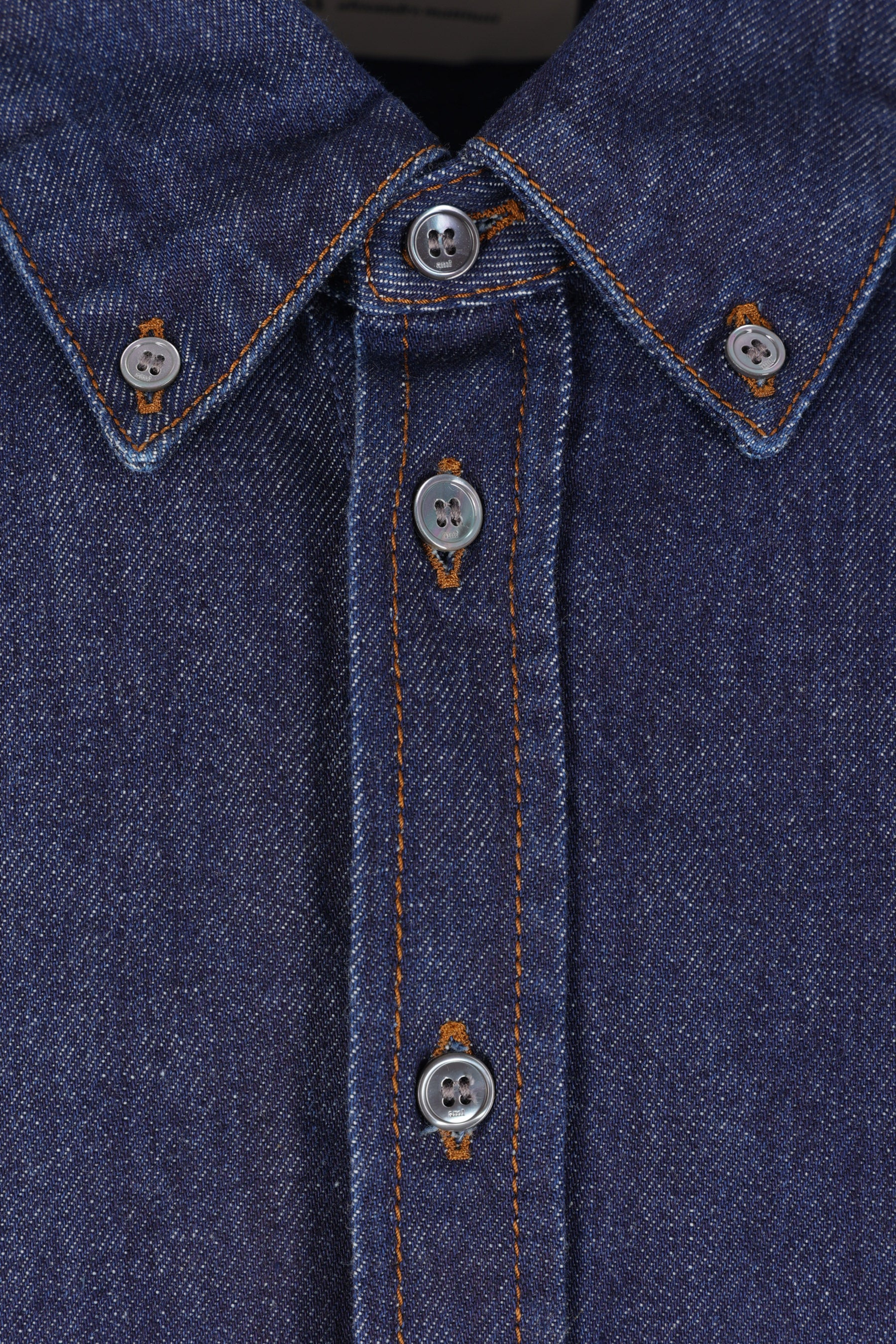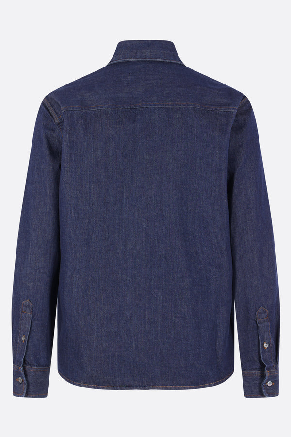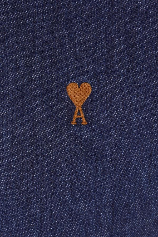 Ami Paris shirt crafted from indigo blue cotton denim with Ami de Coeur embroidery on the chest. Characterized by a button-down collar, front button closure, long sleeves with buttoned cuffs, and a rounded hem.