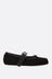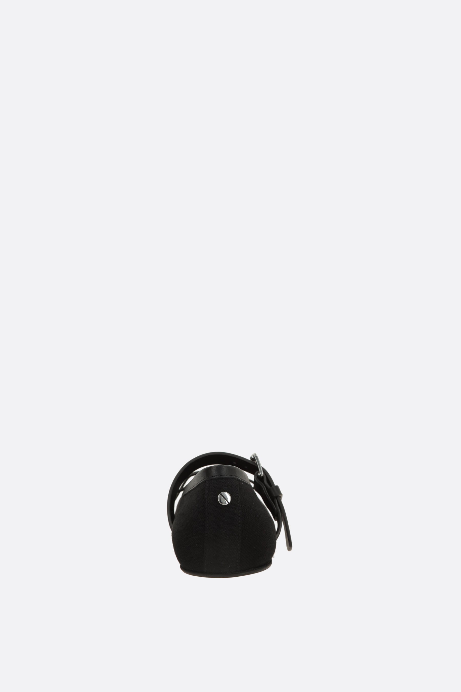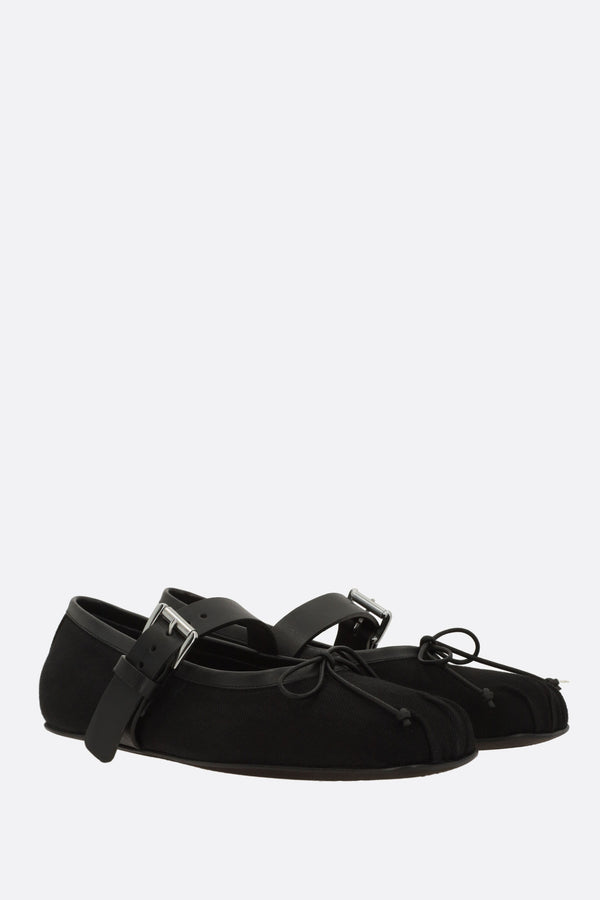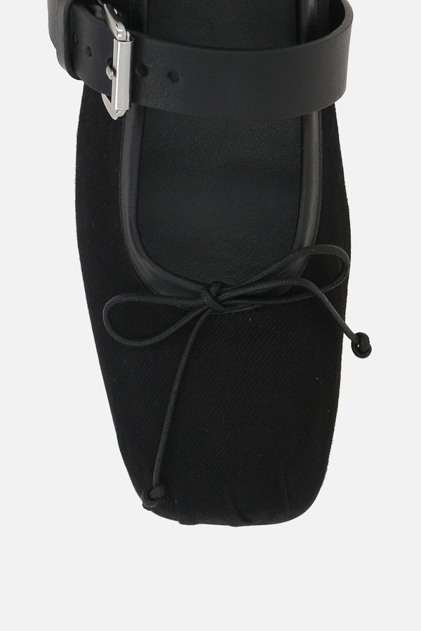 Ann Demeulemeester ballerinas crafted from black denim with tone-on-tone leather trims. It features a pleated square toe, an adjustable leather strap with a metal buckle, leather lining, and a leather/rubber sole. The design is completed with a decorative bow.