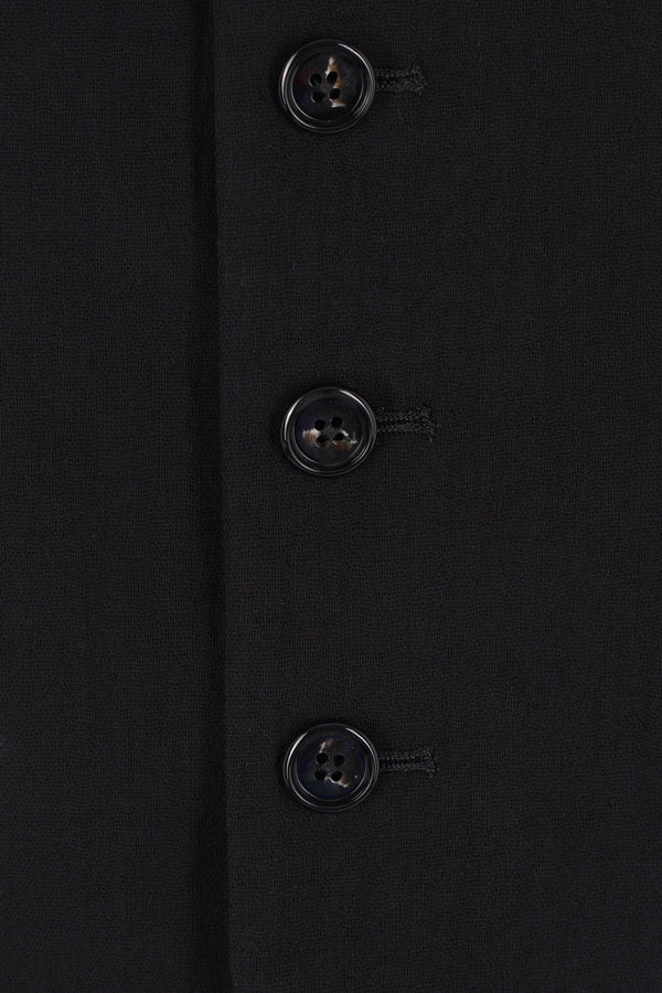 Ann Demeulemeester single-breasted vest crafted from black double cotton gauze. Features a V-neckline, front button closure, twill back panel, and an adjustable strap with metal buckle. Fully lined interior.