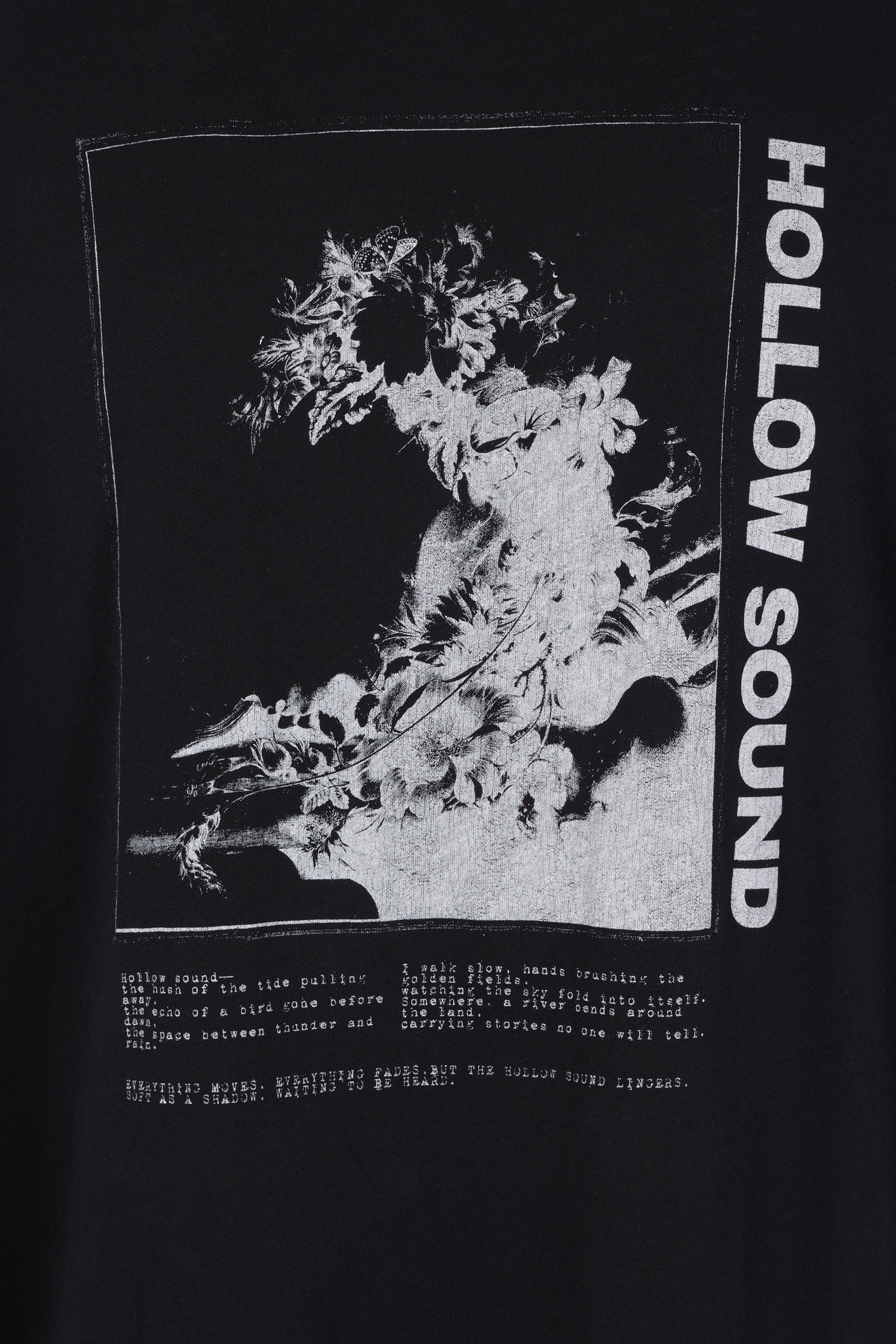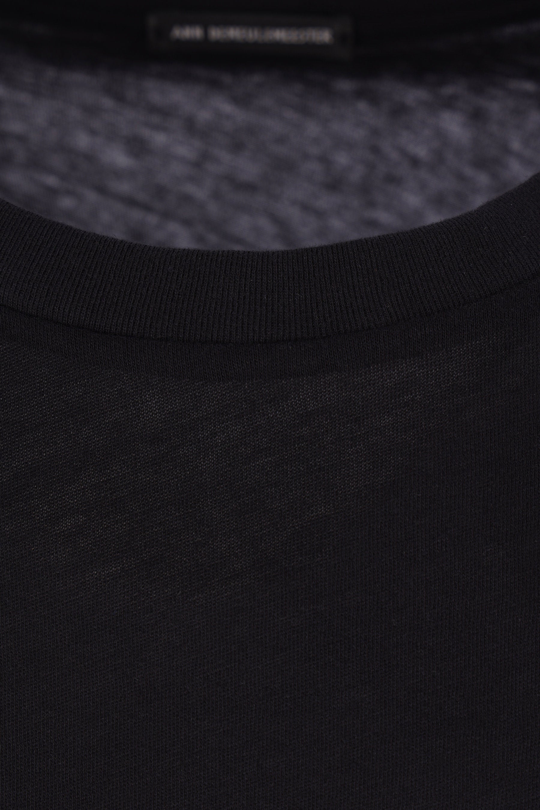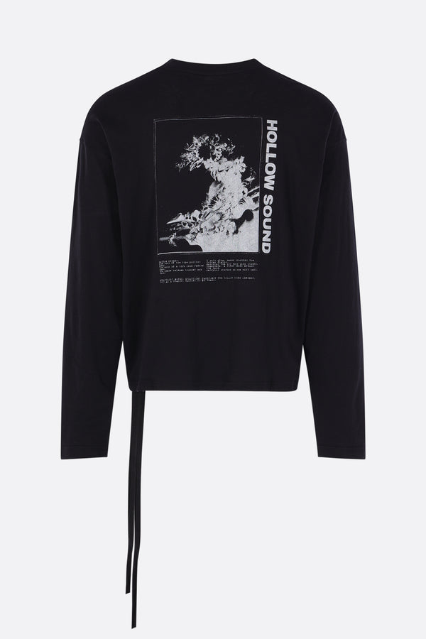 Ann Demeulemeester t-shirt crafted from black cotton jersey with an "Hollow Sound" print on the back. It features a crew neckline, long sleeves, and a straight hem with decorative ties.